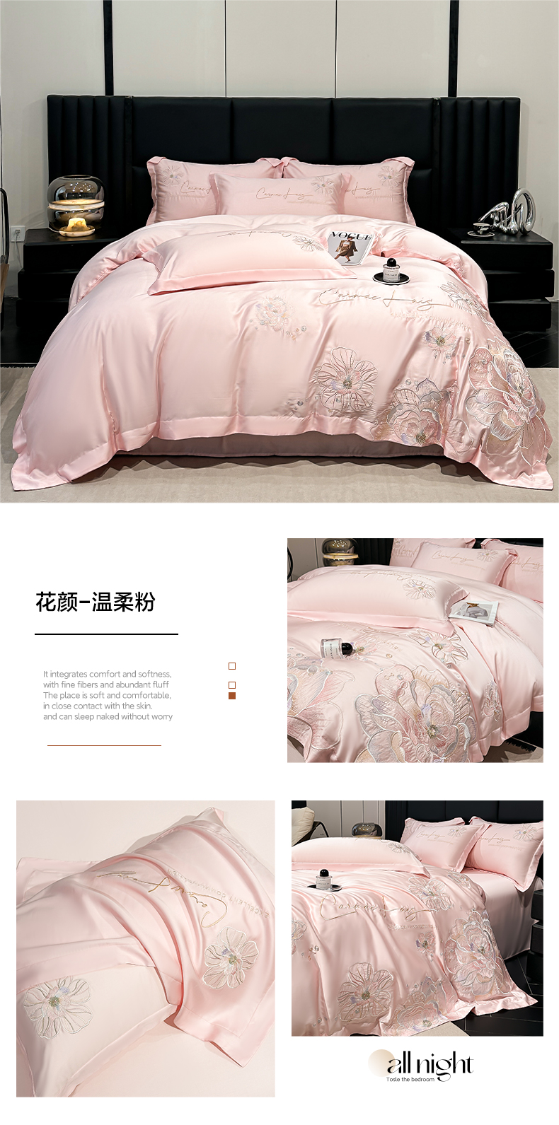 商品名称:欧乐蒂 2025新款水洗冰丝刺绣四件套-花颜 花颜-雅粉