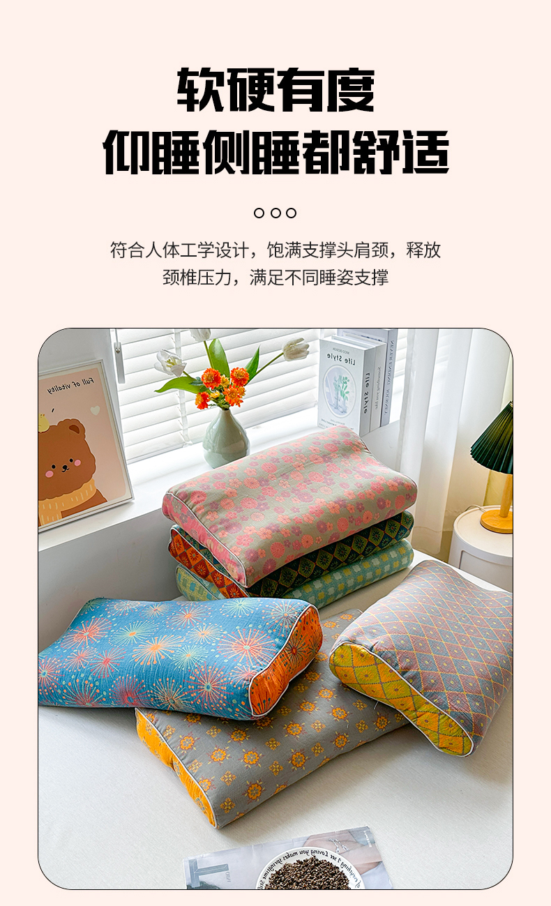 商品名称:梦莱家纺 2025新款全棉双层纱色织提花全荞麦枕牵引枕高低造型枕头枕芯 碎花红 30x50cm/只-甜荞麦