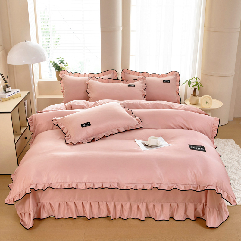 找底底2023新款230g牛奶绒法莱绒刺绣蕾丝边床裙款四件套,豆沙色,橘橙色,玛卡蓝,嫩黄,浅粉色,雾紫,质感灰