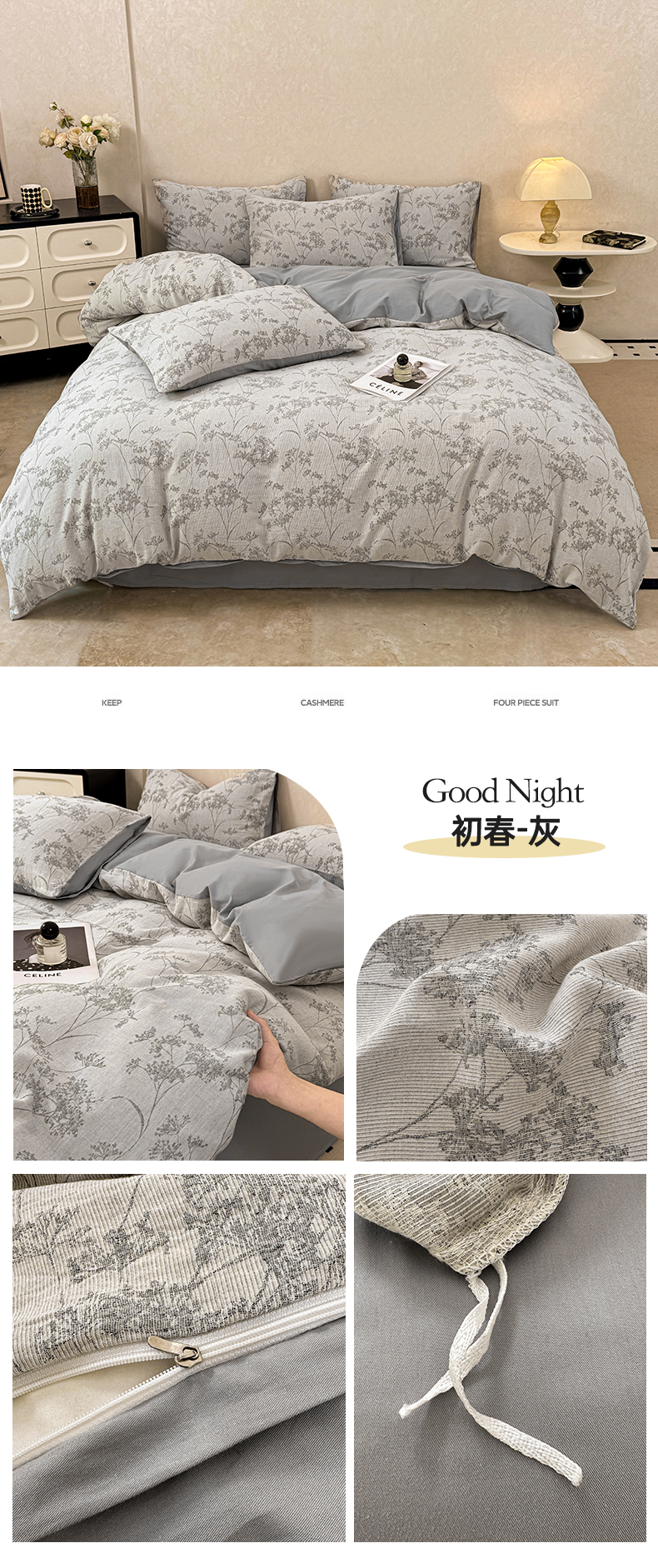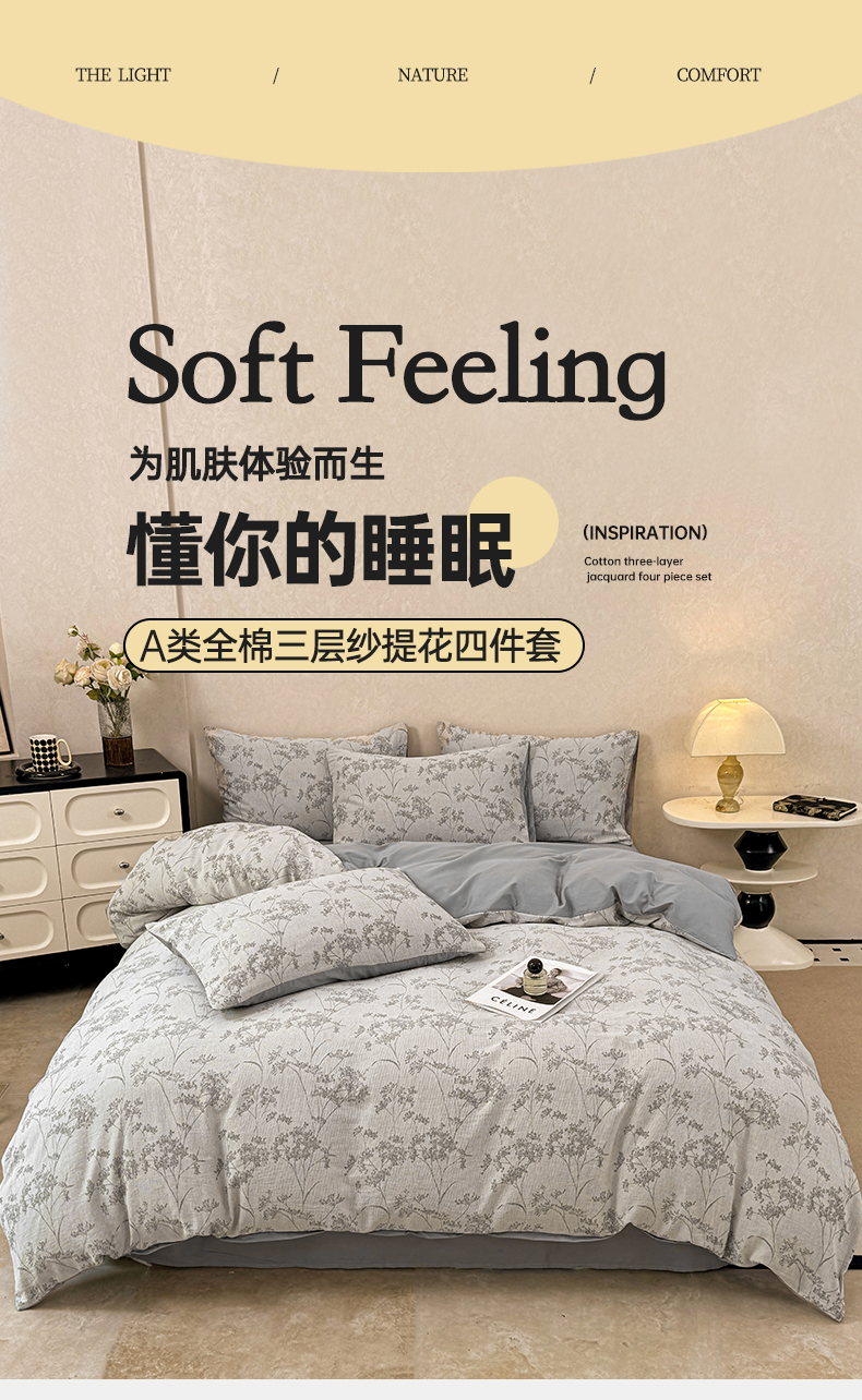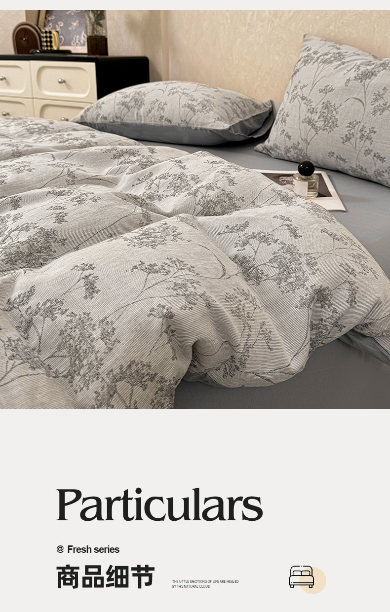 当前位置: 91家纺网 > 商品网购 > 床品套件 > 四件套 > 色织四件套 > 灰鲸2025新款A类全棉三层纱色织提花系列四件套 初春-灰