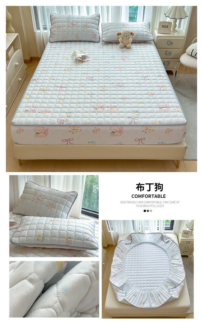 • 91家纺网 家纺一手货源 找家纺 雯豆家纺 2025四季款新品夹棉床笠三件套水洗棉磨毛小清新印花床垫保护套 布丁狗