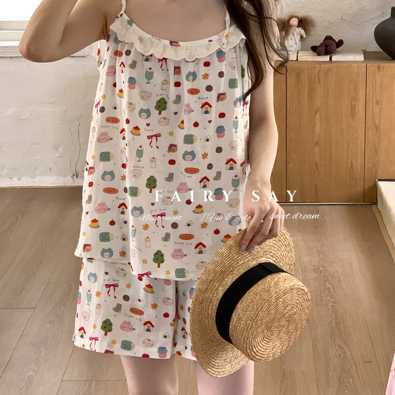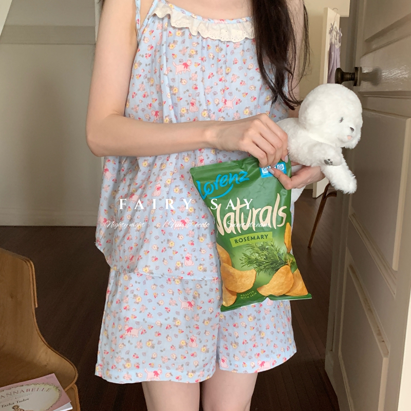当前位置: 91家纺网 > 商品网购 > 居家日用 > 睡衣/家居服套装 > 妍景家居生活馆 2025新款纱布吊带套装 蓝底碎花