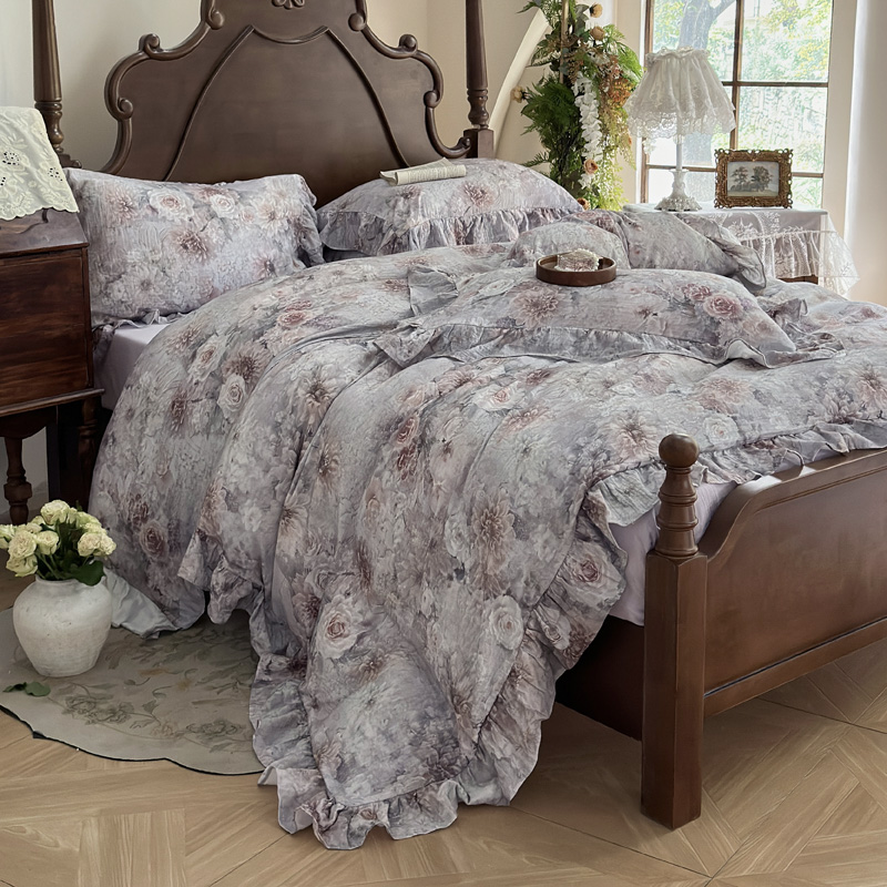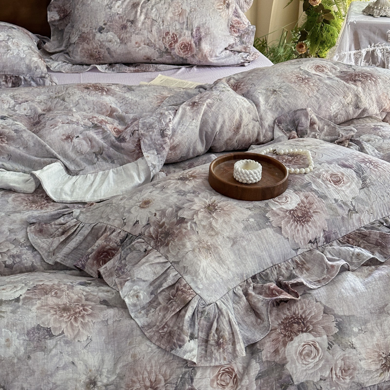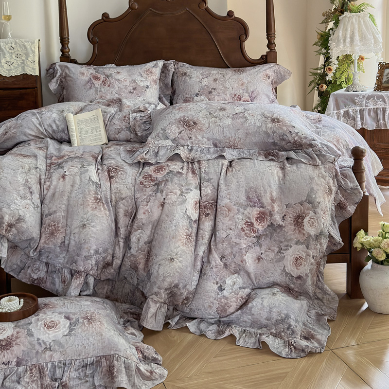 商品名称:木楌家居2025新款法式油画风全棉双层皱皱纱四件套 山谷幽