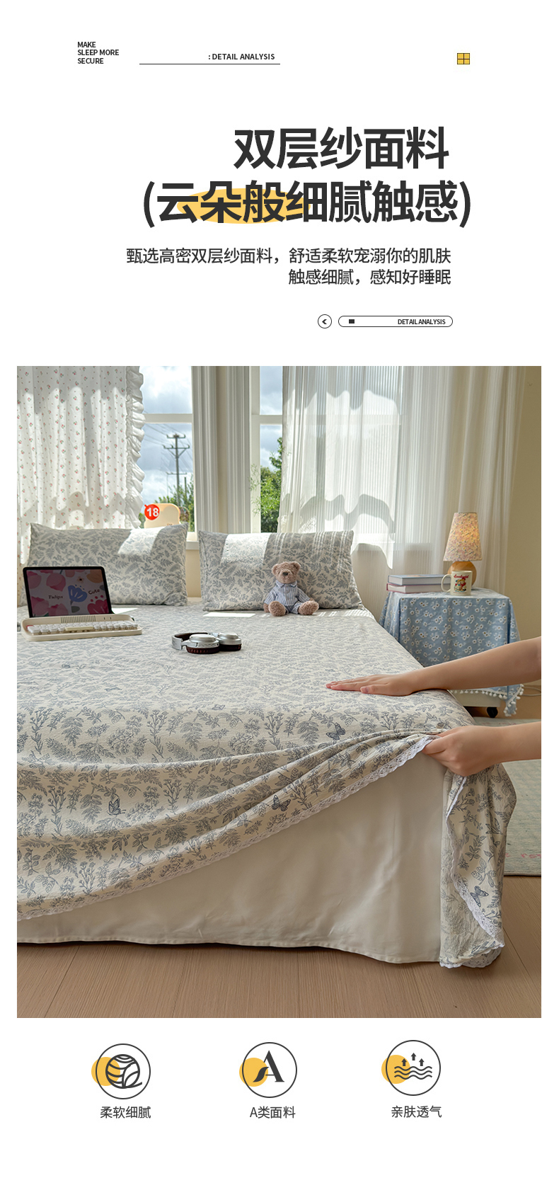 沐芷 2025 A类双层纱花边床单单件 单人双人床单三件套 东方草木