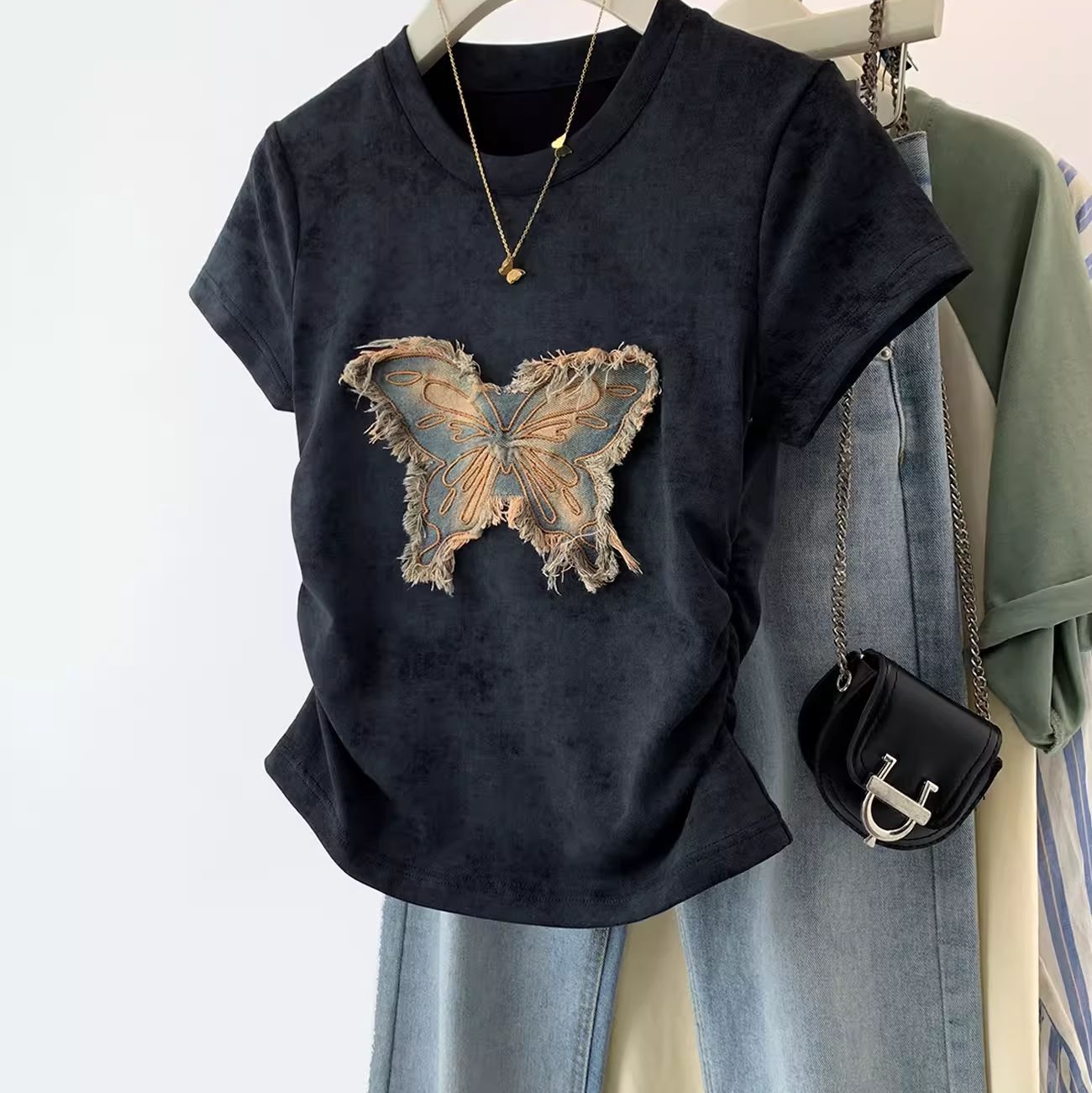 洛兰沙家居馆【只代发】【只代发】 2025新款扎染短袖t恤女莫代尔上衣美式复古夏季设计感小个子修身短款上 白色
