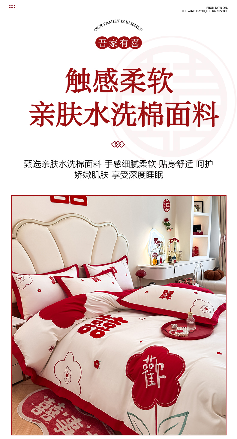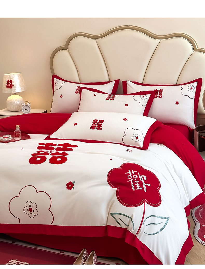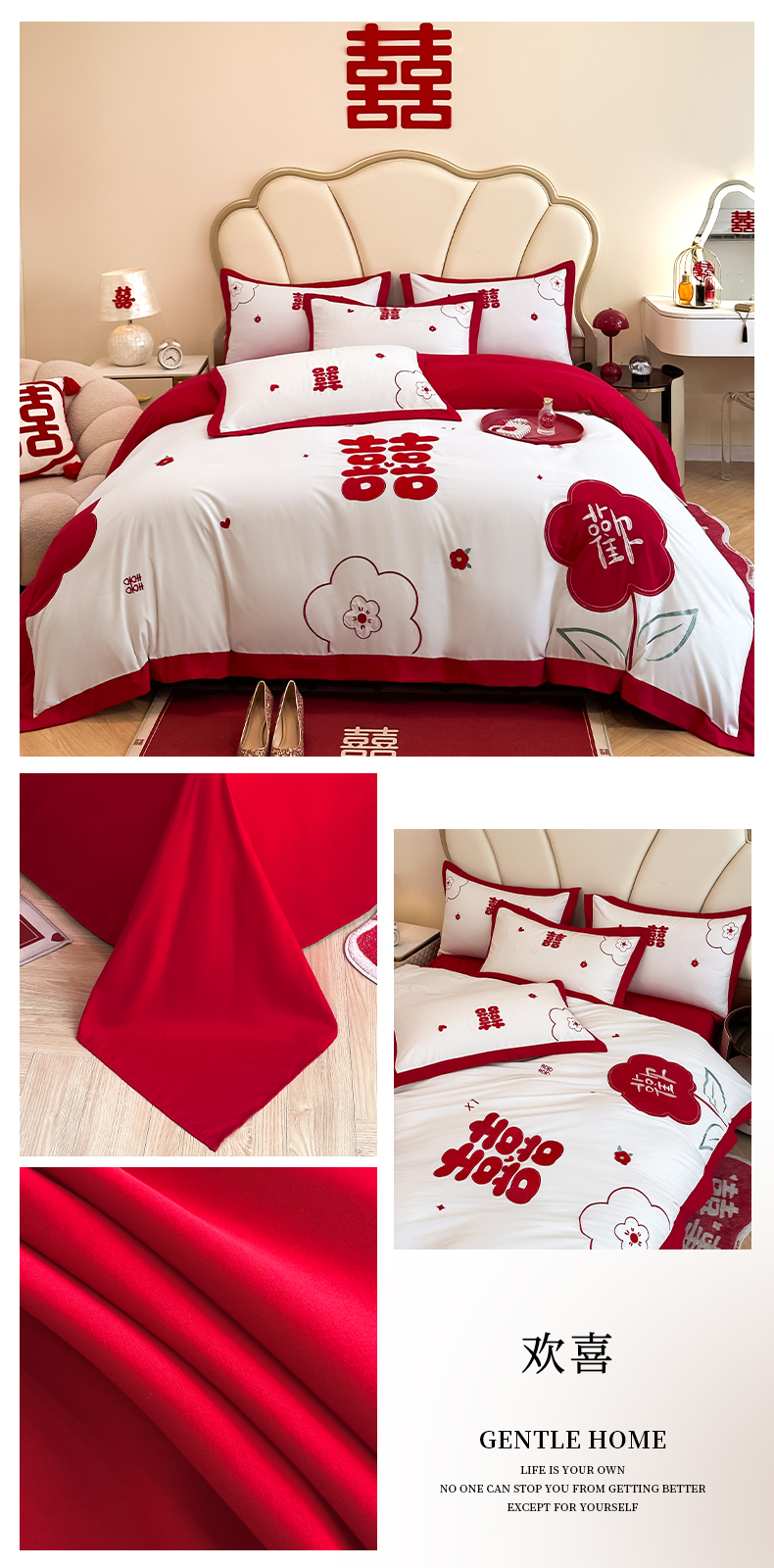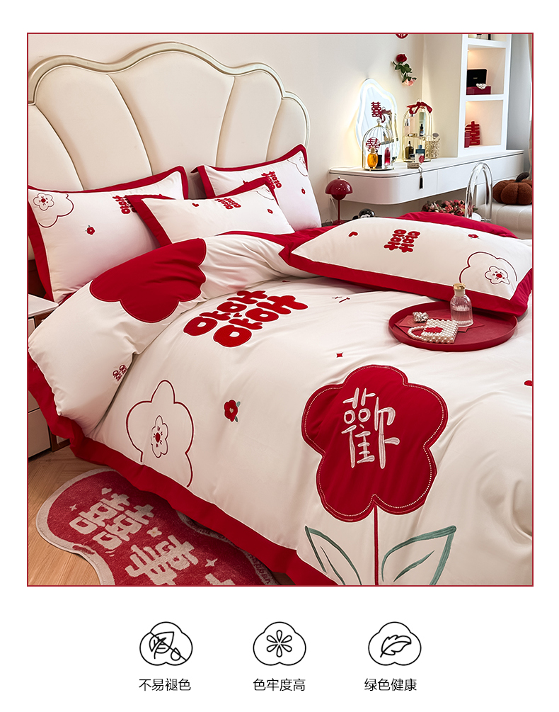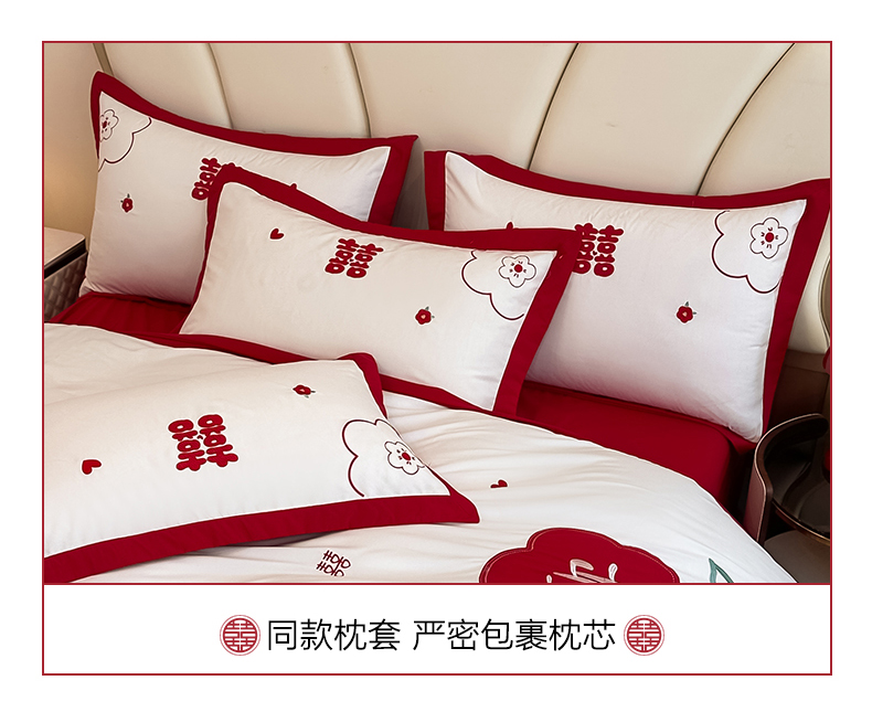 商品名称:火麒麟家纺 2025新款亲肤棉婚庆刺绣四件套 欢喜