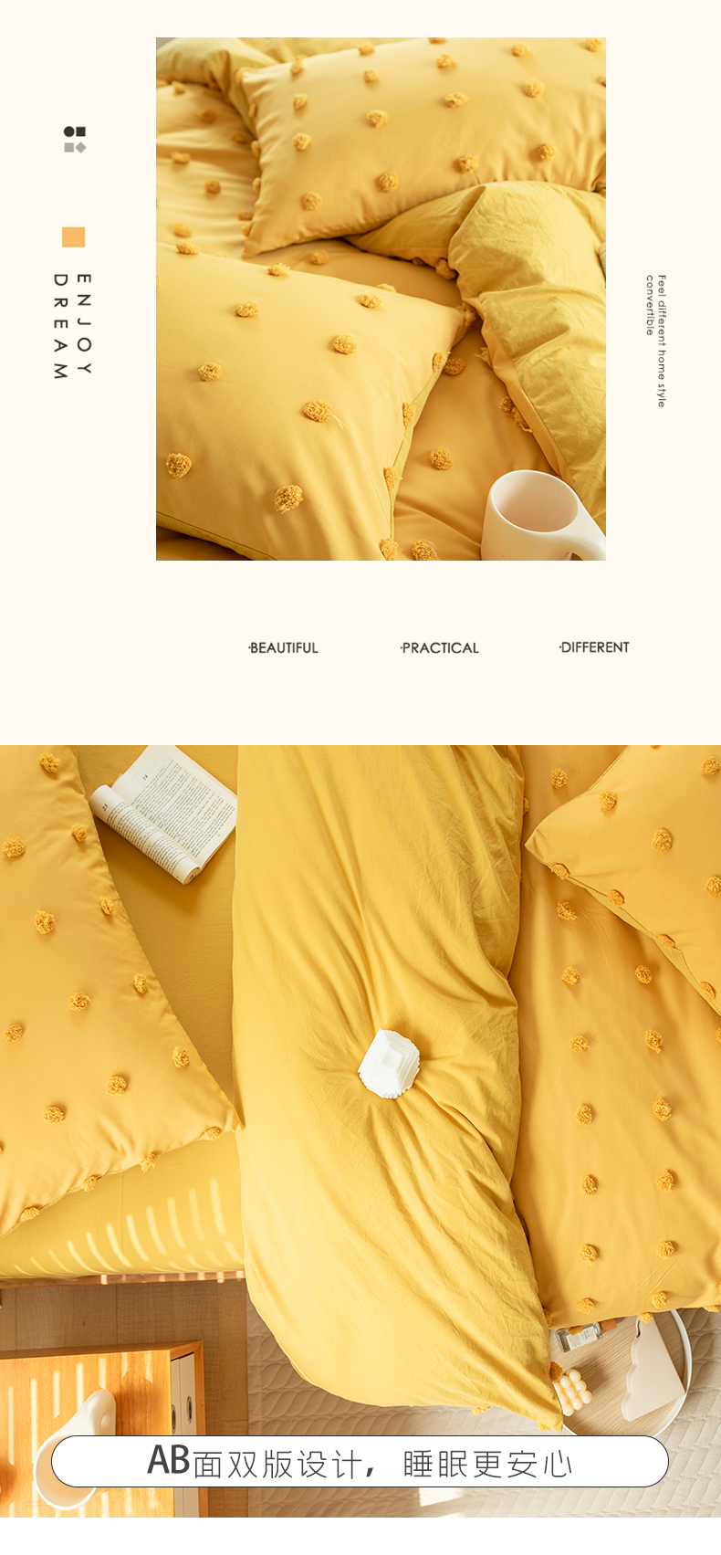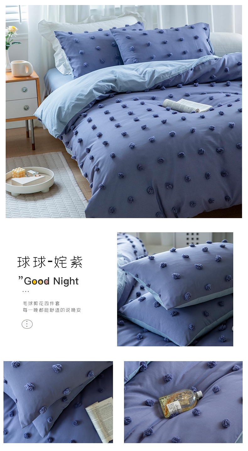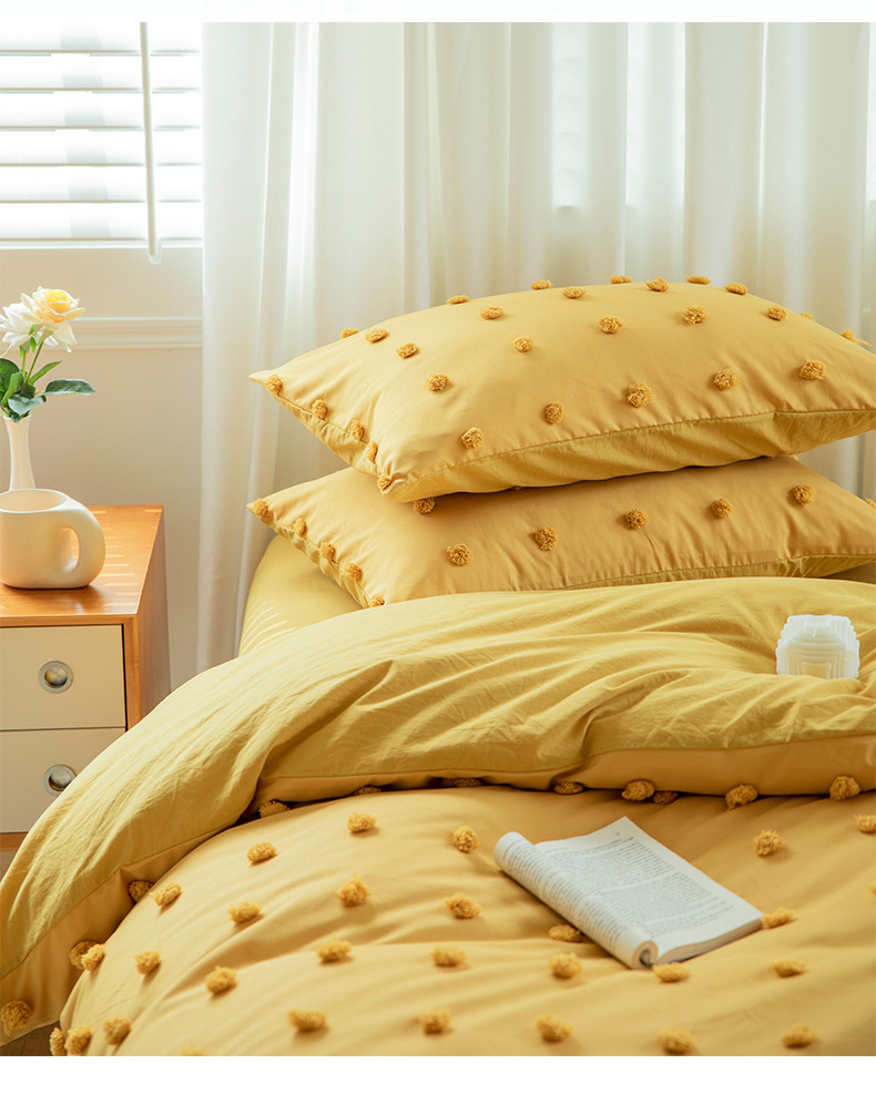 贝尔 PELLHOME 复古风毛球剪花日式简约套件全棉水洗棉纯素色四件套(春节不打烊) 球球-奶黄