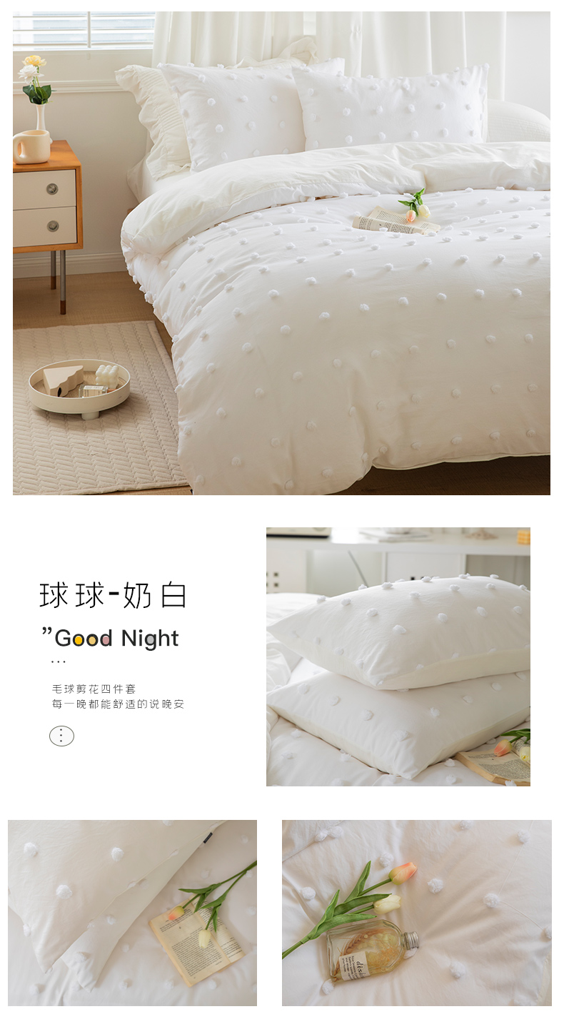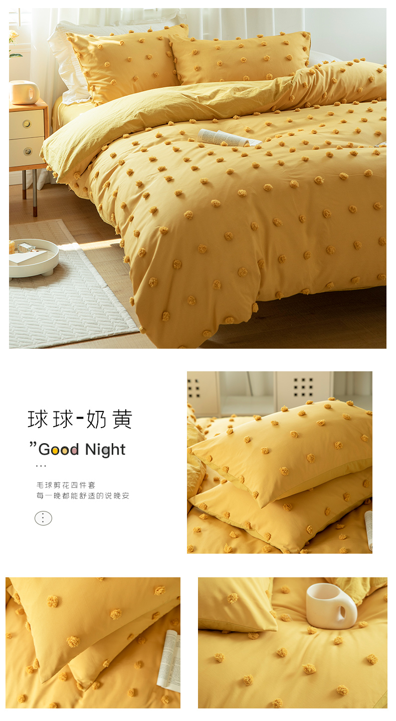 商品名称:贝尔 PELLHOME 复古风毛球剪花日式简约套件全棉水洗棉纯素色四件套(春节不打烊) 球球-奶黄
