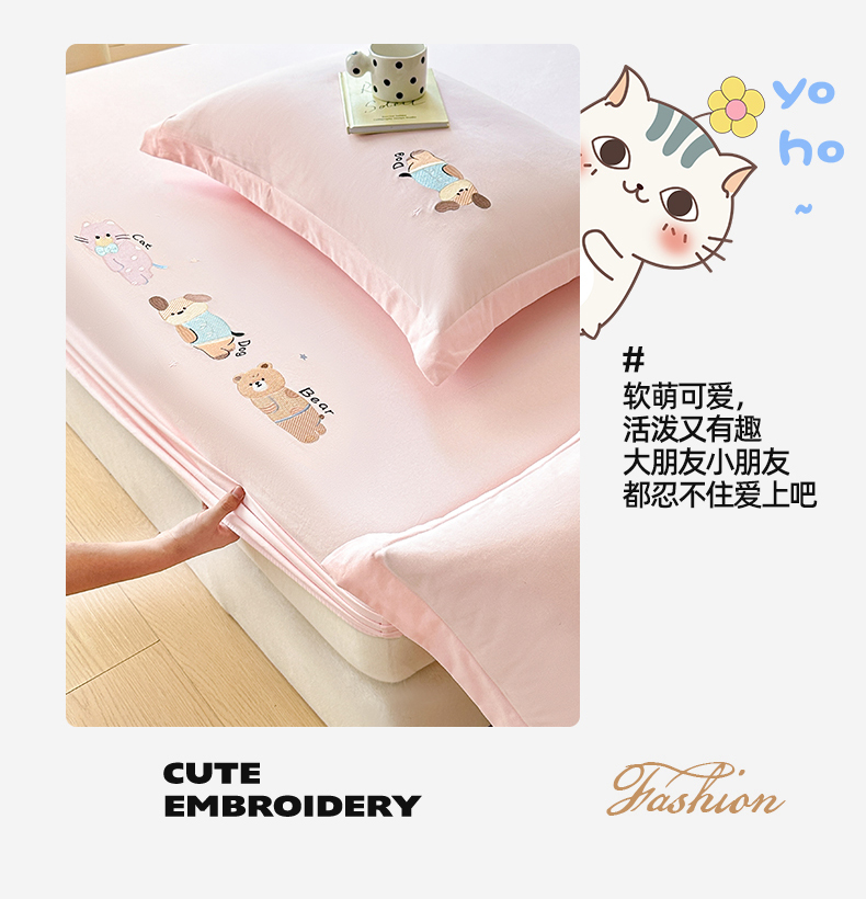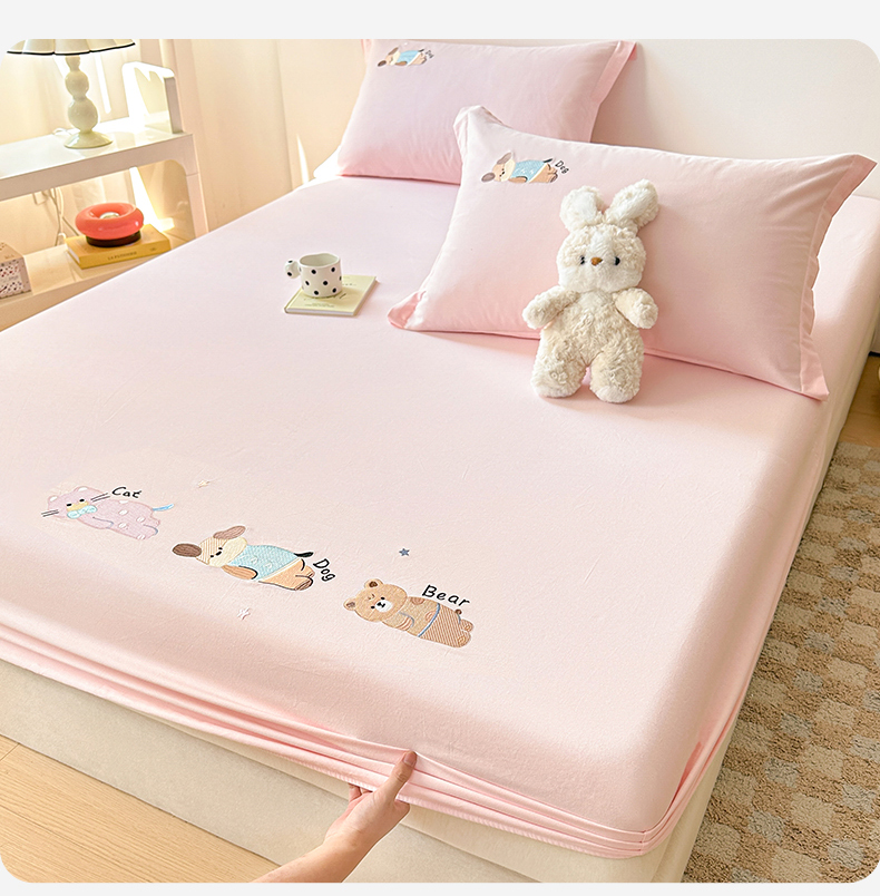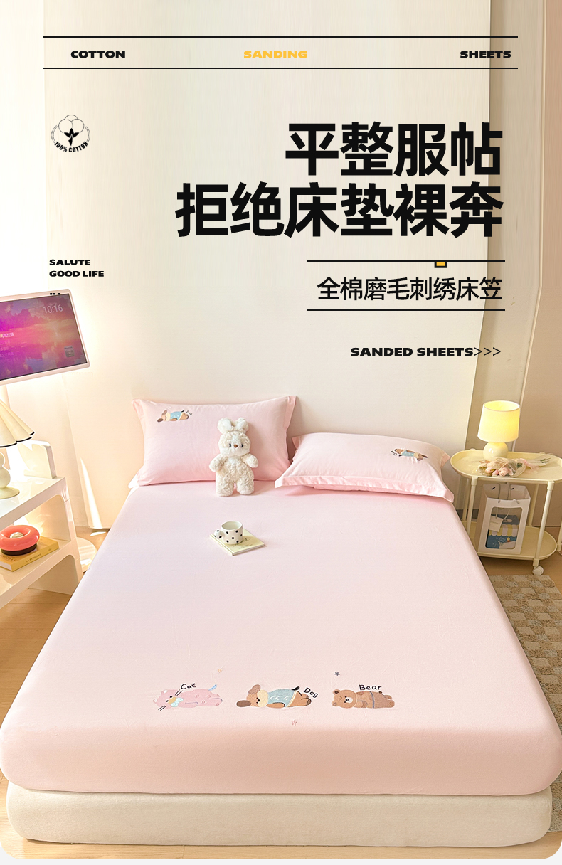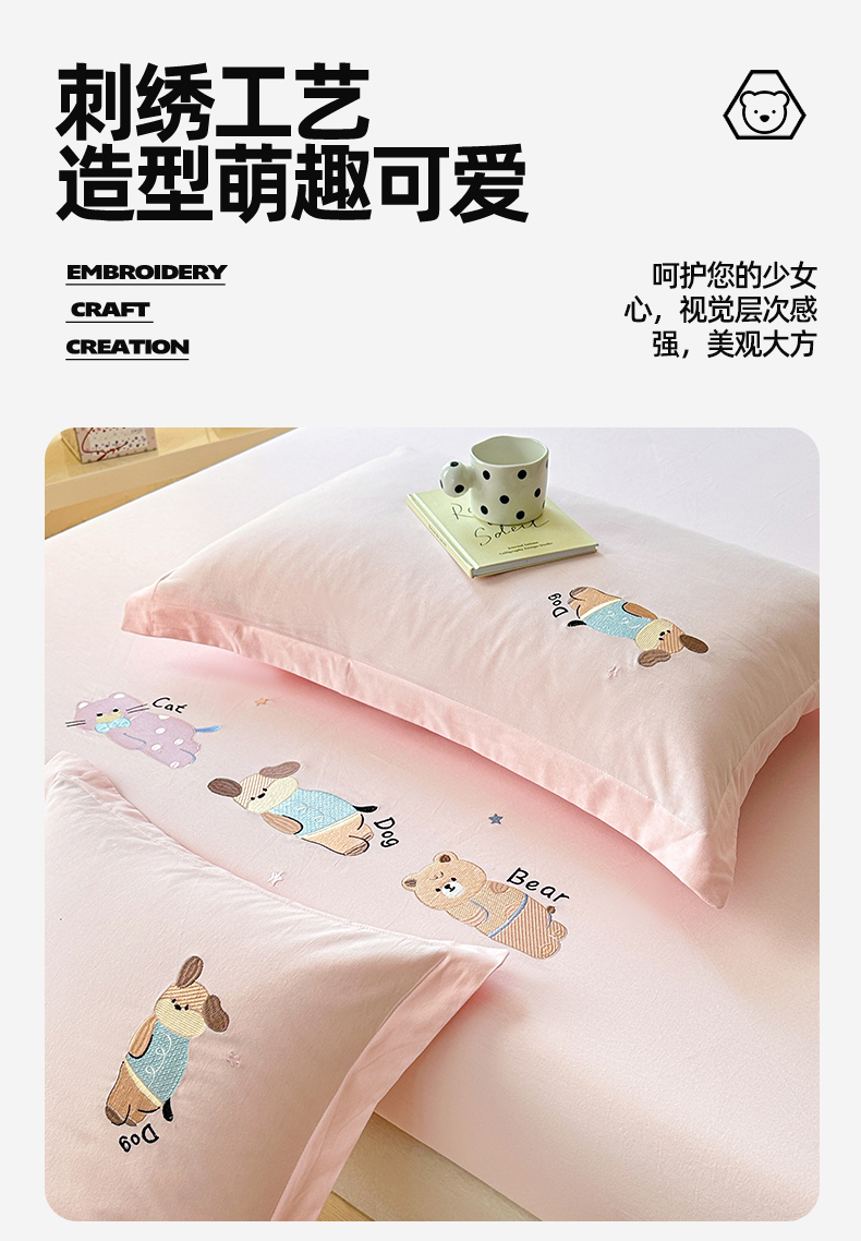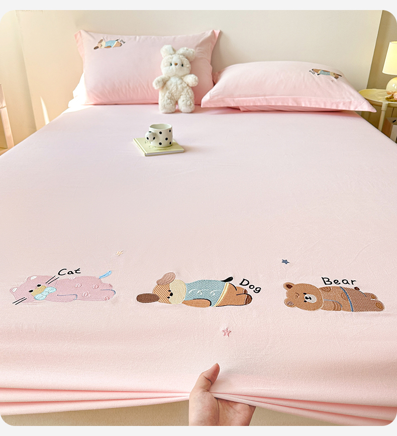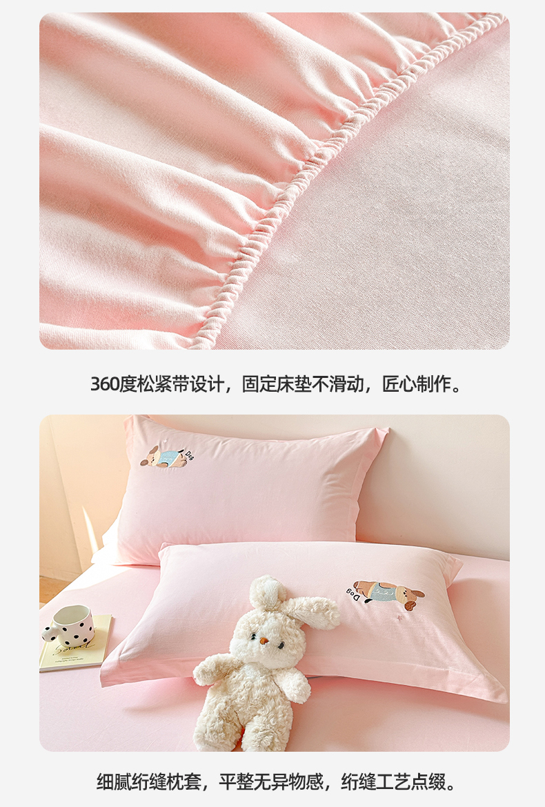 笙意家纺 2025新款全棉纯棉磨毛刺绣单品床笠 床笠单件 萌宠-绯粉