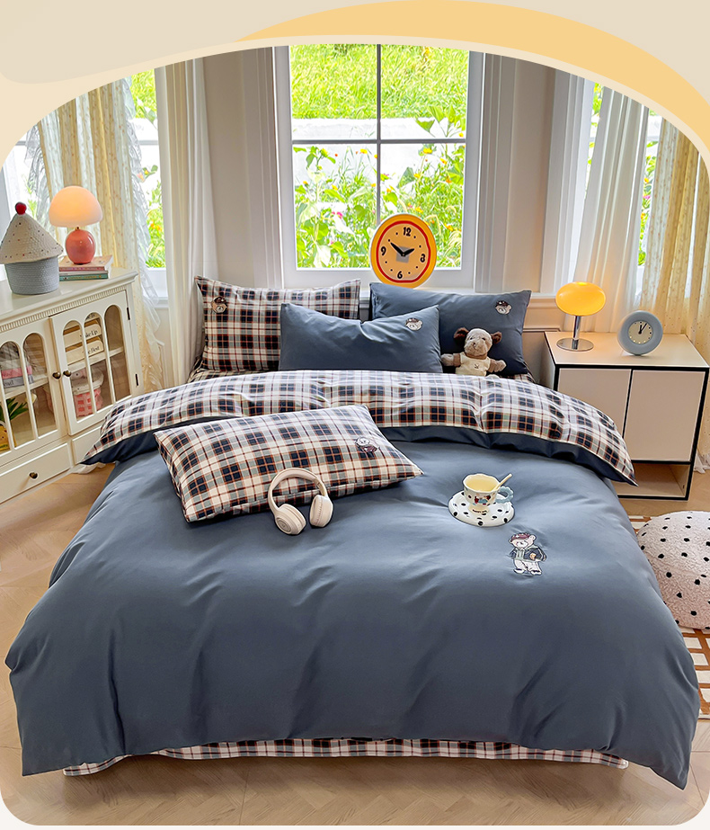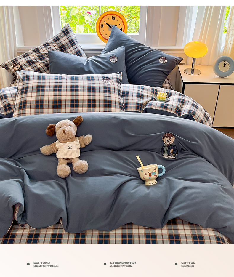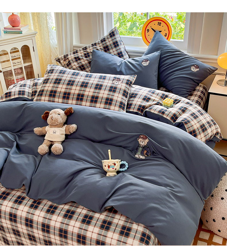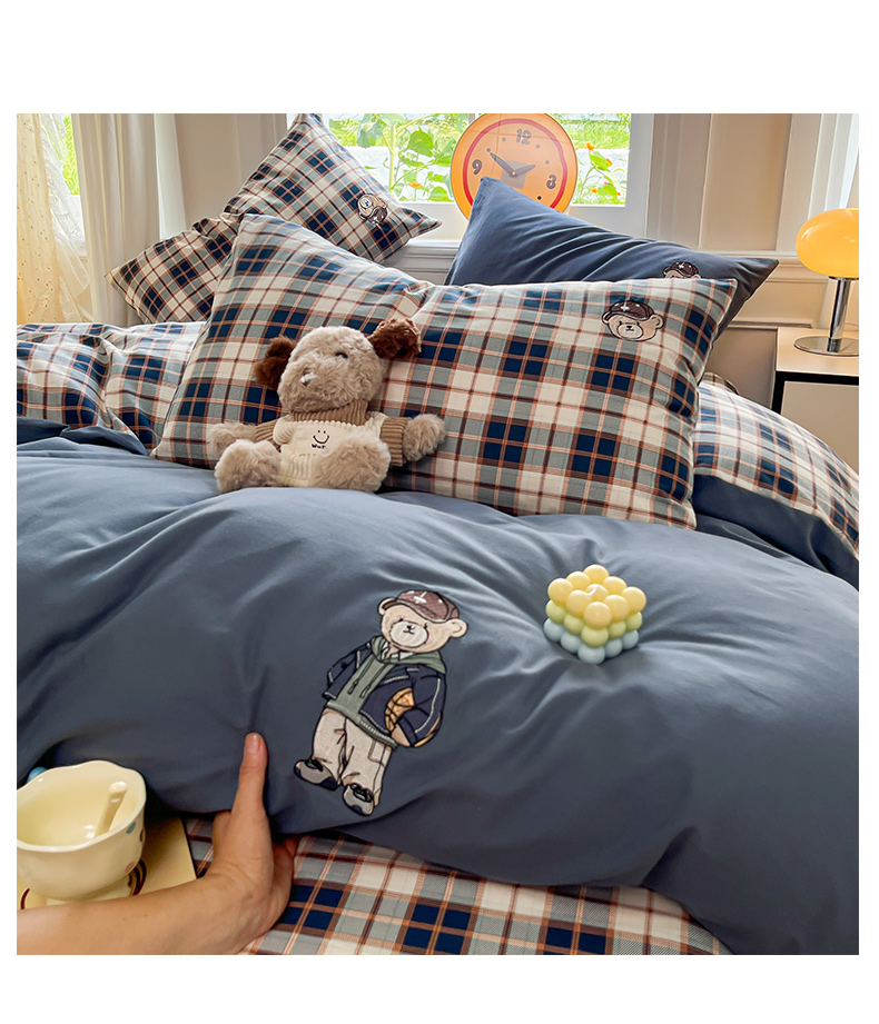 (总)大境 2026新款色织全棉水洗棉刺绣四件套小清新纯棉四件套,篮球小熊-格子咖,篮球小熊-格子蓝,篮球小熊-条纹粉,篮球小熊-条纹绿,篮球小熊-细条灰