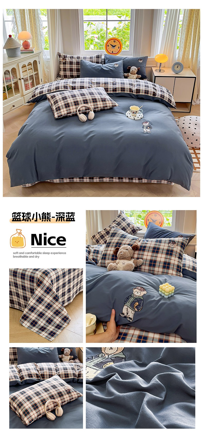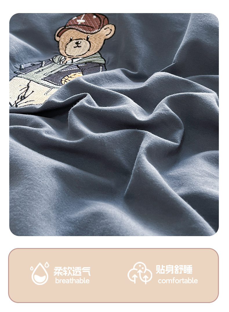 商品名称:大境 2025秋冬专版刺绣A类全棉磨毛四件套三件套 篮球小熊-深蓝