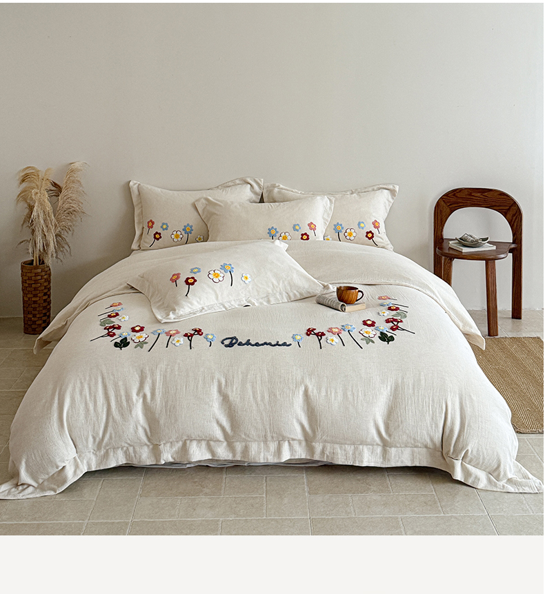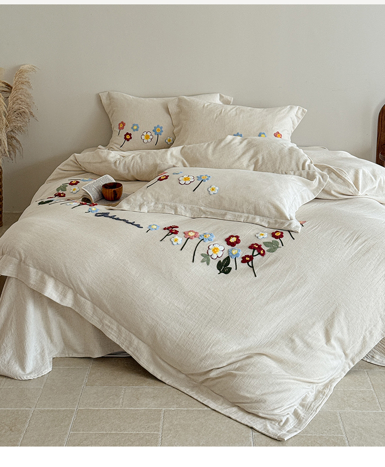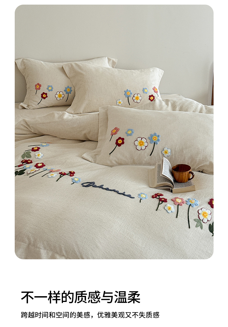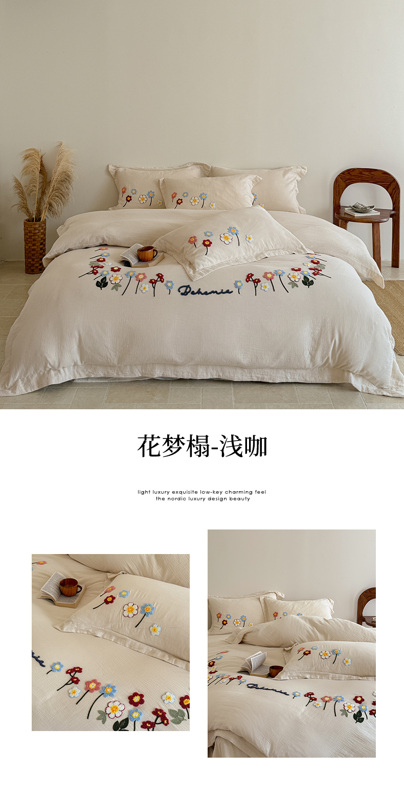 商品名称:绒棉世家 2025新款20%亚麻80%棉双层棉麻刺绣四件套 花梦榻-浅咖