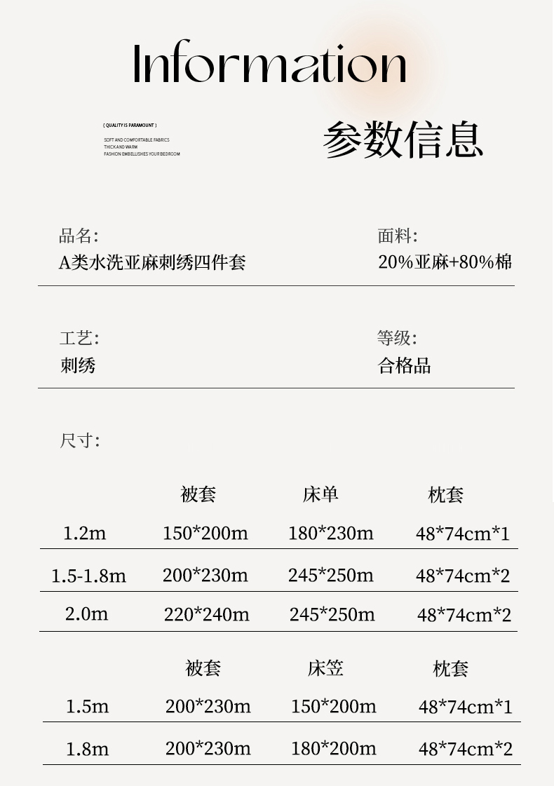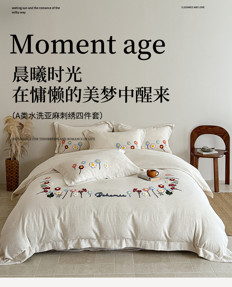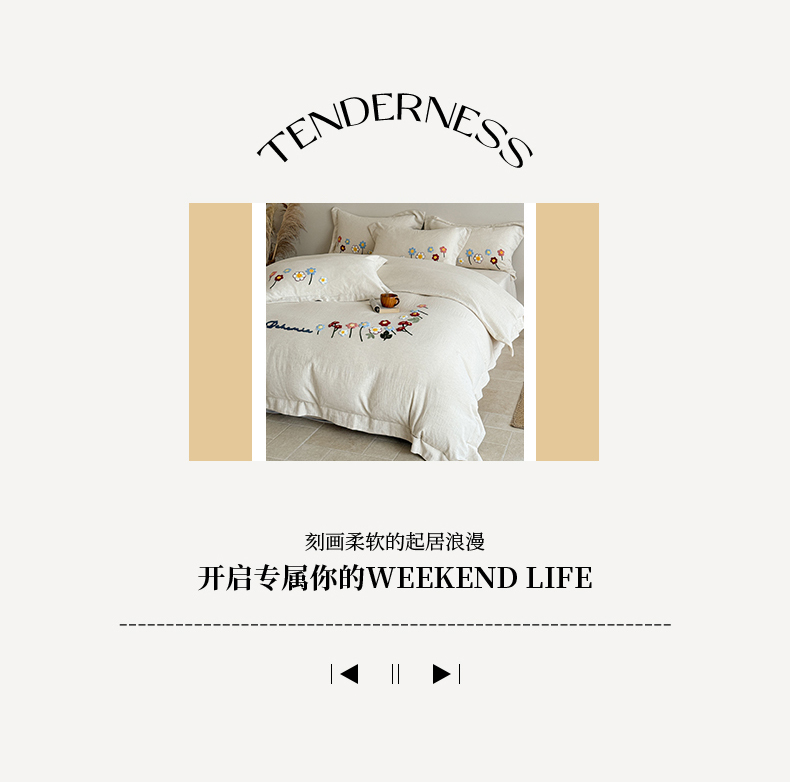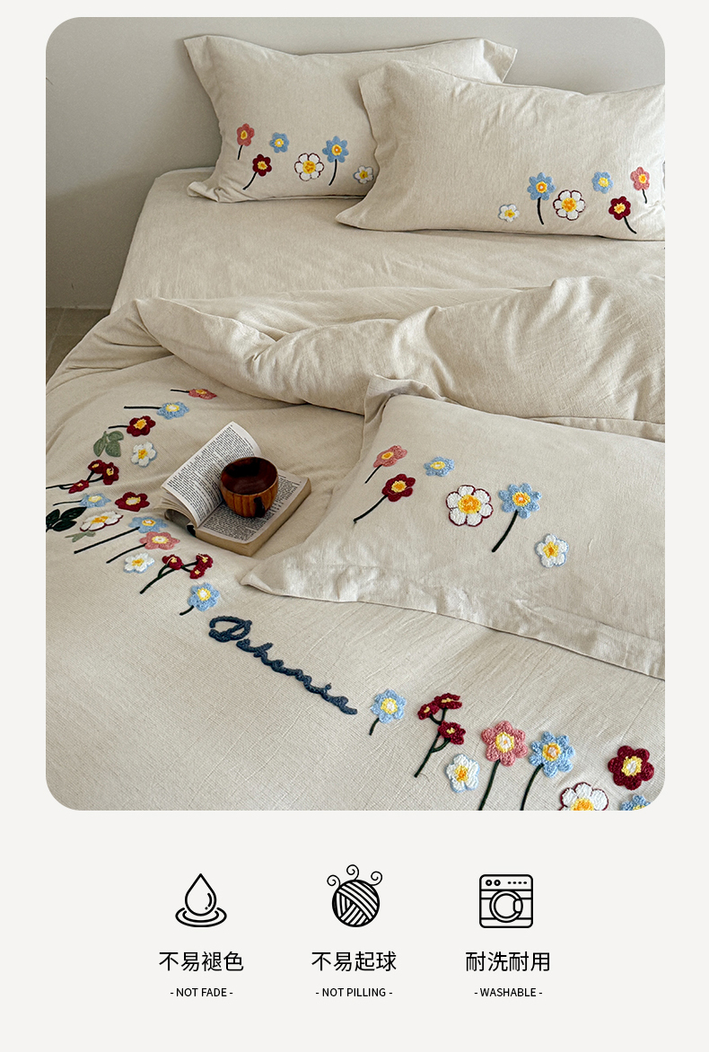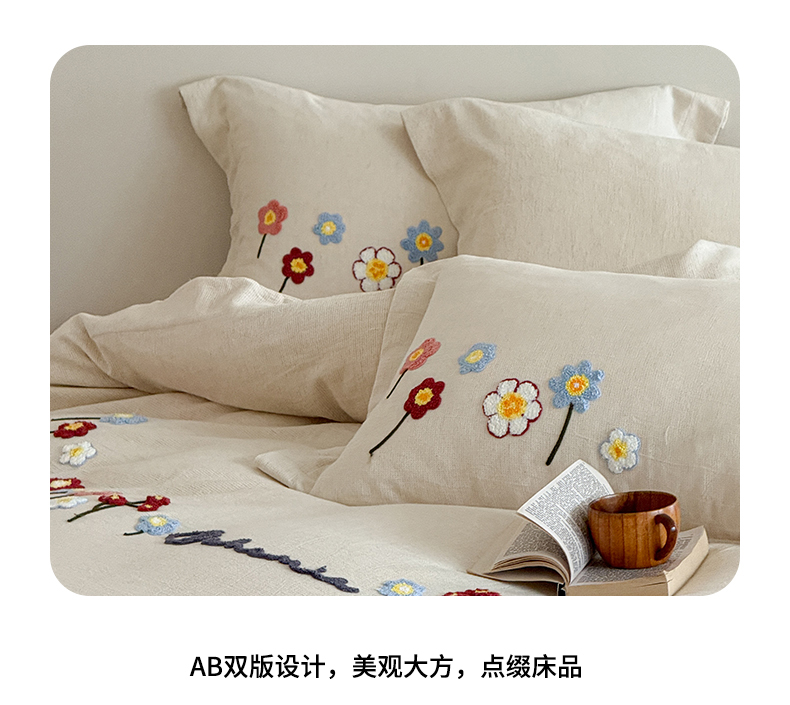 商品名称:绒棉世家 2025新款20%亚麻80%棉双层棉麻刺绣四件套 花梦榻-浅咖