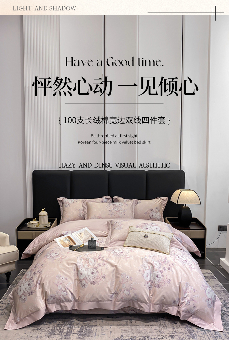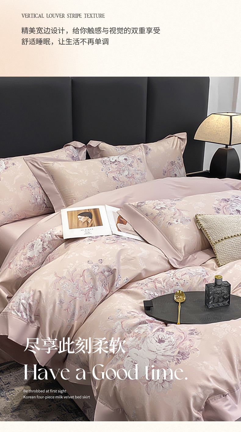 (总)娇逸家居 2025新款高克重A类数码印花牛奶绒双拼边款四件套,采薇灰,扶桑,浅影,秋灵粉,秋灵黄,秋灵绿,舜华粉,采薇米,舜华绿,仙客,栩蝶,璎珞,玉树,芸芙