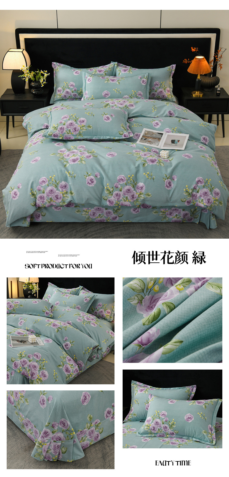 商品名称:润淳家居 2025新款百分百全棉磨毛四件套 倾世花颜 绿