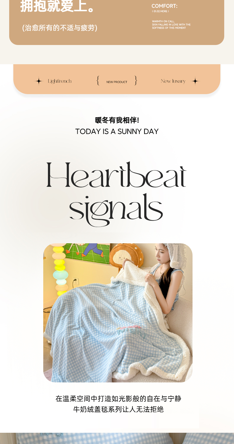 商品名称:布柔 2025新款高克重加厚印花毛巾刺绣牛奶绒羊羔绒盖毯双层毛毯午休毯卡通多功能沙发毯子 甜心咖盖毯