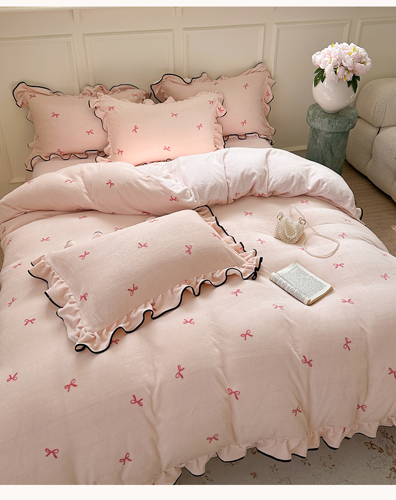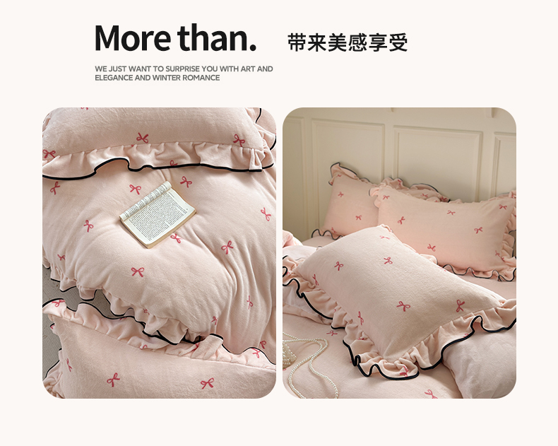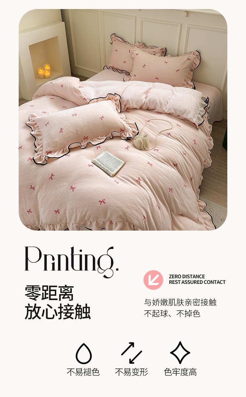 当前位置: 91家纺网 > 商品网购 > 床品套件 > 四件套 > 牛奶绒四件套 > 优悦生活馆 2025新款花边款牛奶绒四件套-芙然 芙然-白