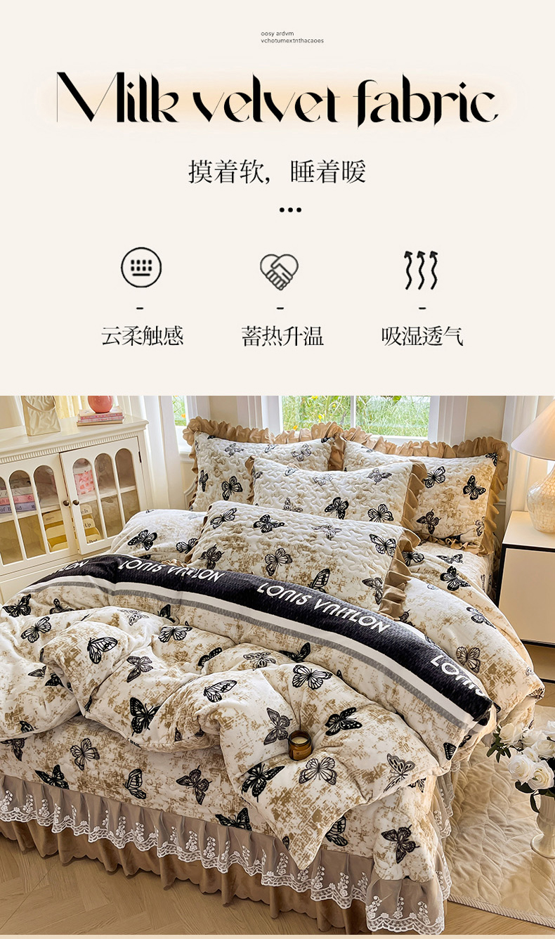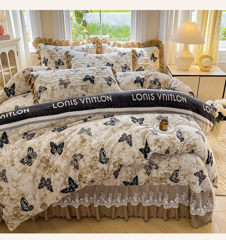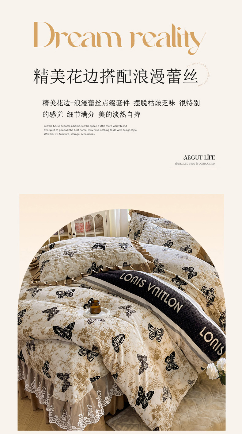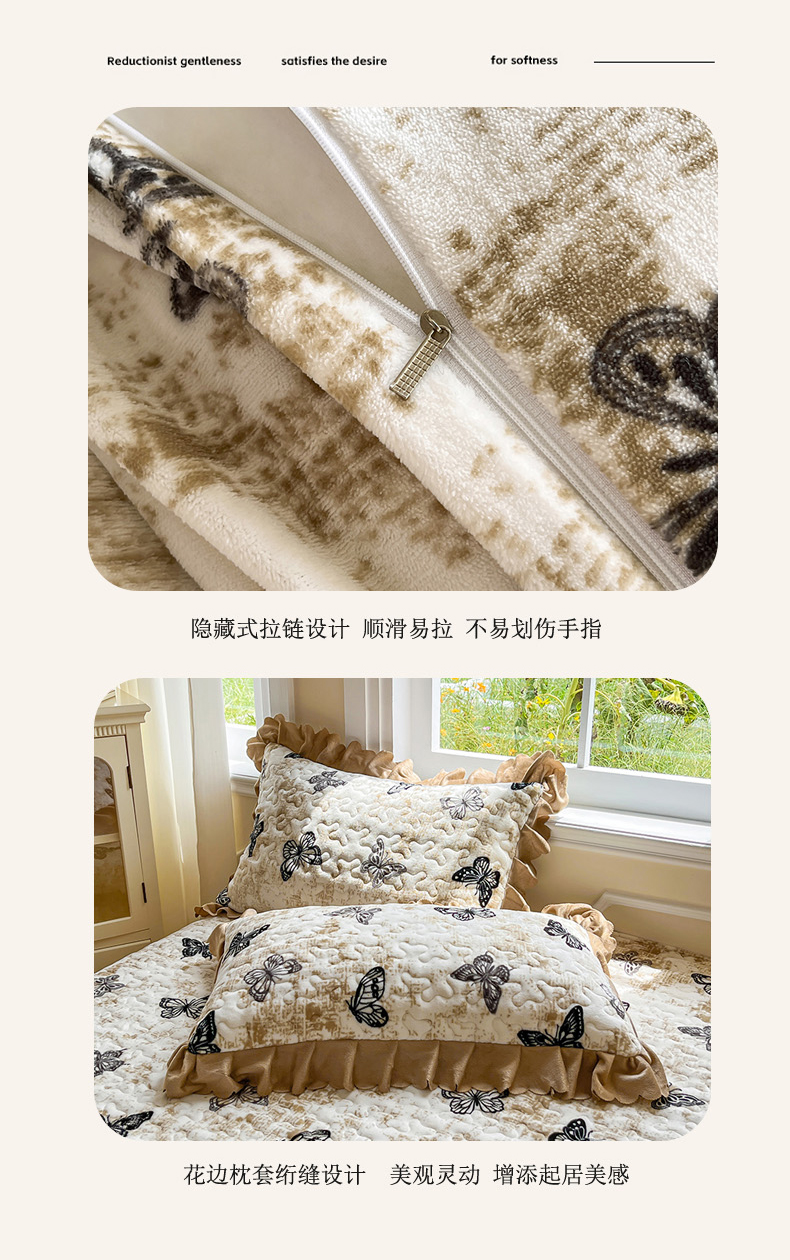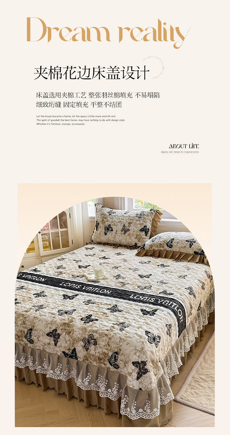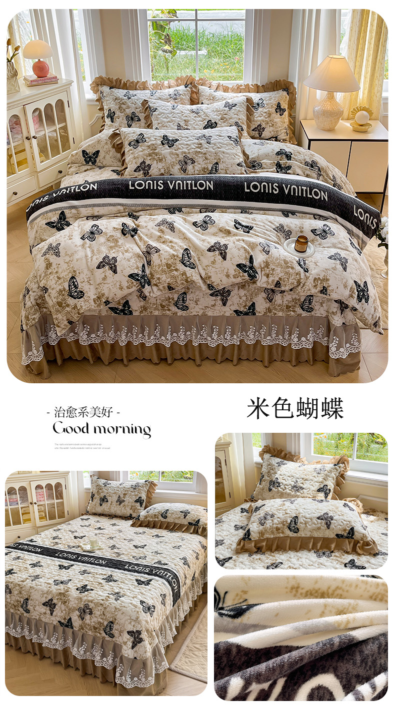 当前位置: 91家纺网 > 商品网购 > 床品套件 > 四件套 > 牛奶绒四件套 > 提花大世界 2025新款爆款高克重牛奶绒印花夹棉蕾丝花边床盖床三件四件套 米色蝴蝶
