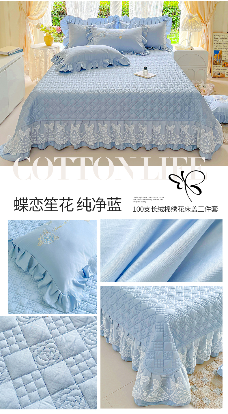 商品名称:宜凡家纺 2025新款长绒棉绣花夹棉床盖三件套--蝶恋笙花系列 蝶恋笙花 纯净蓝