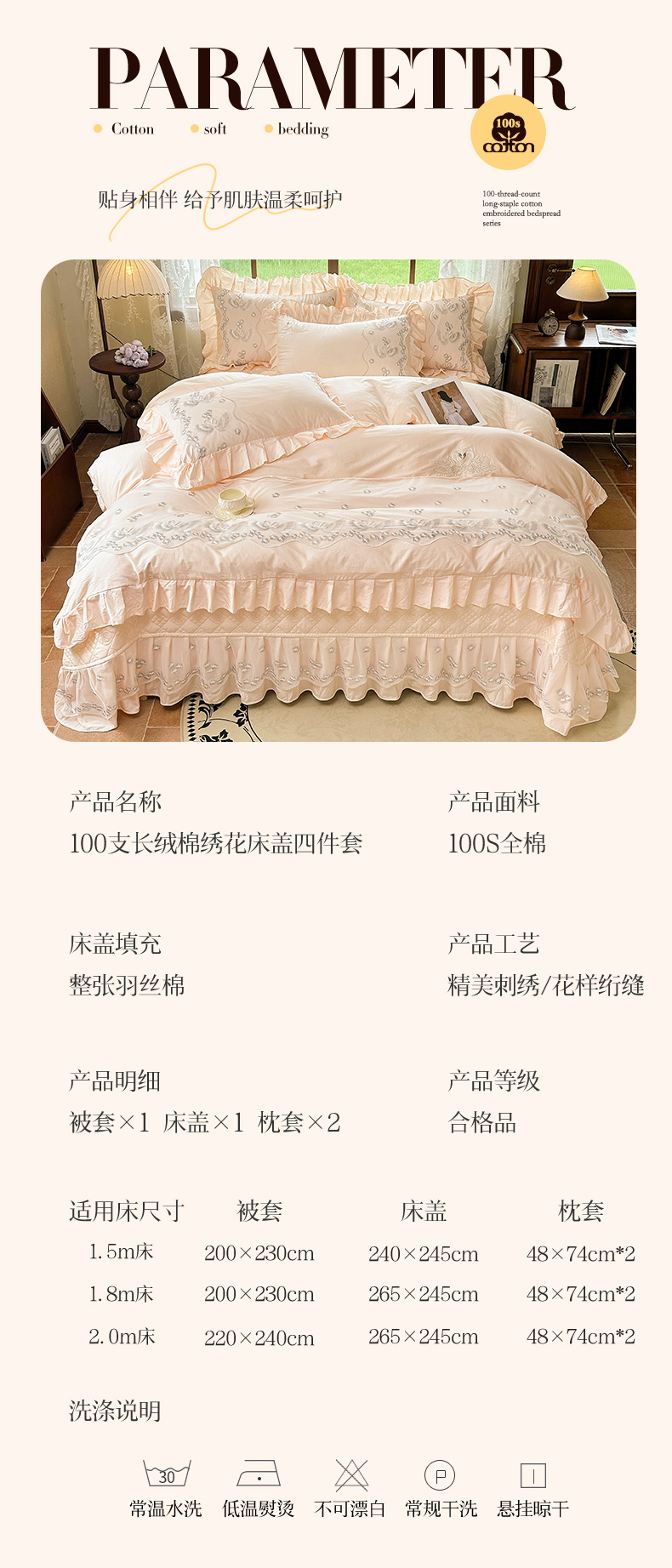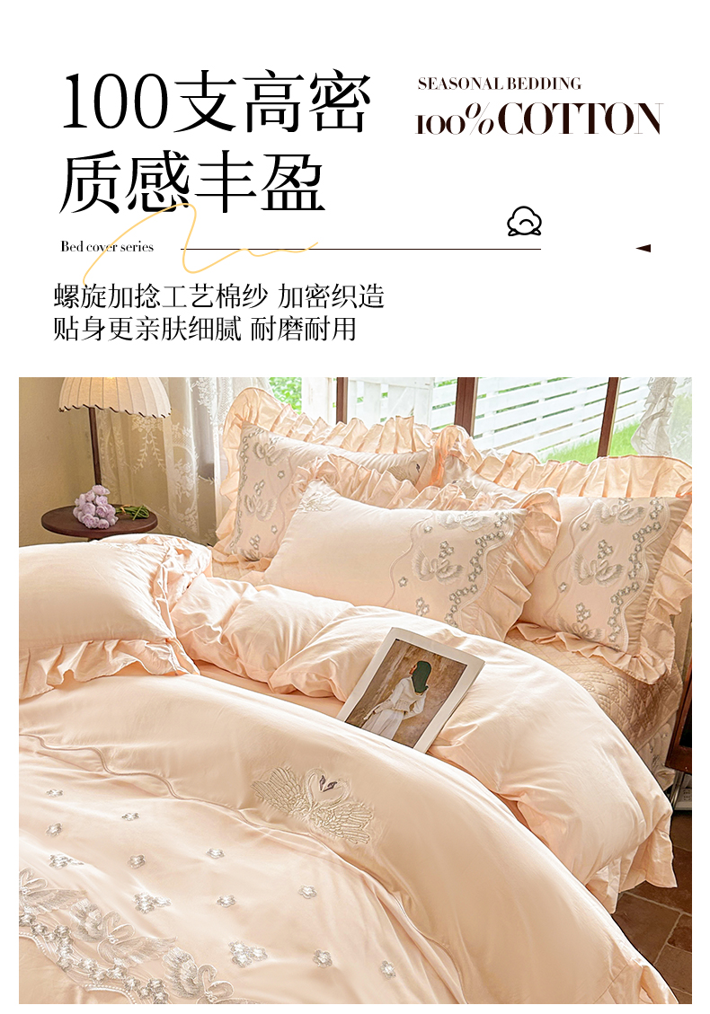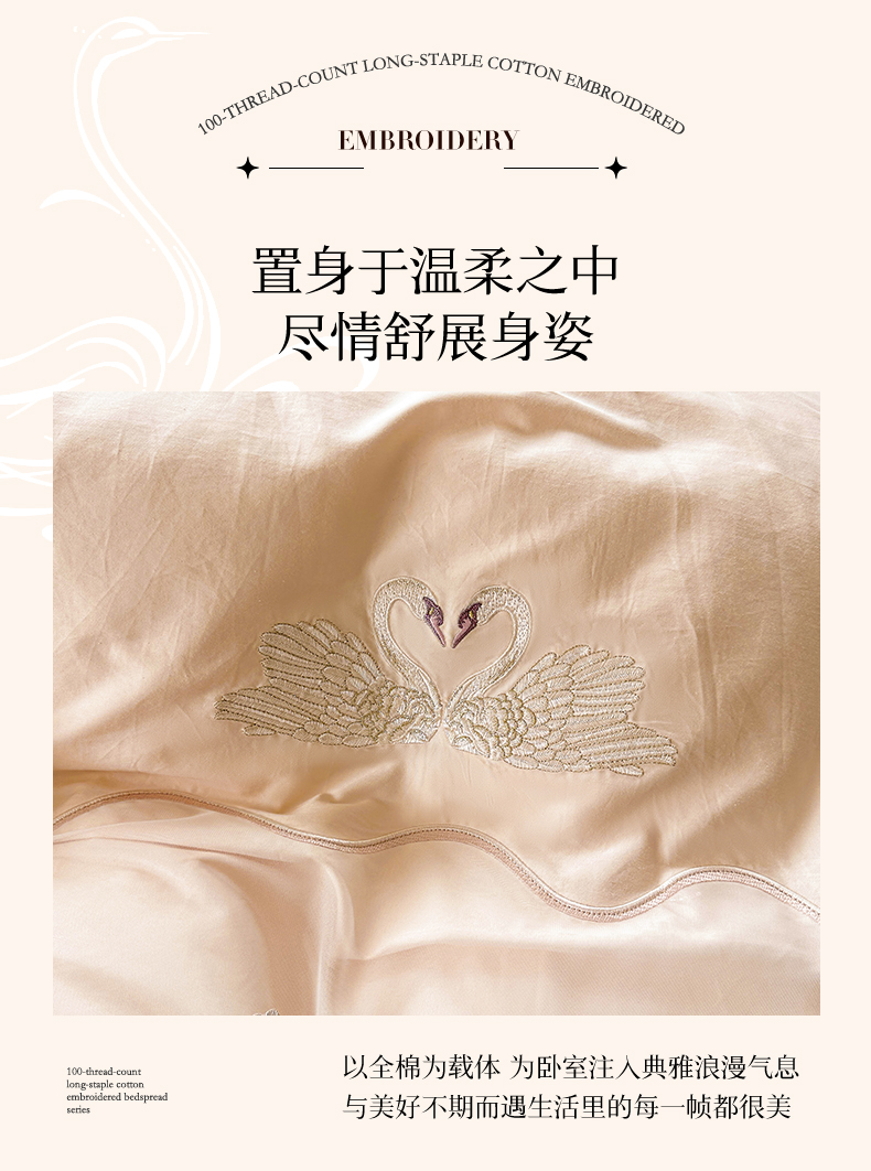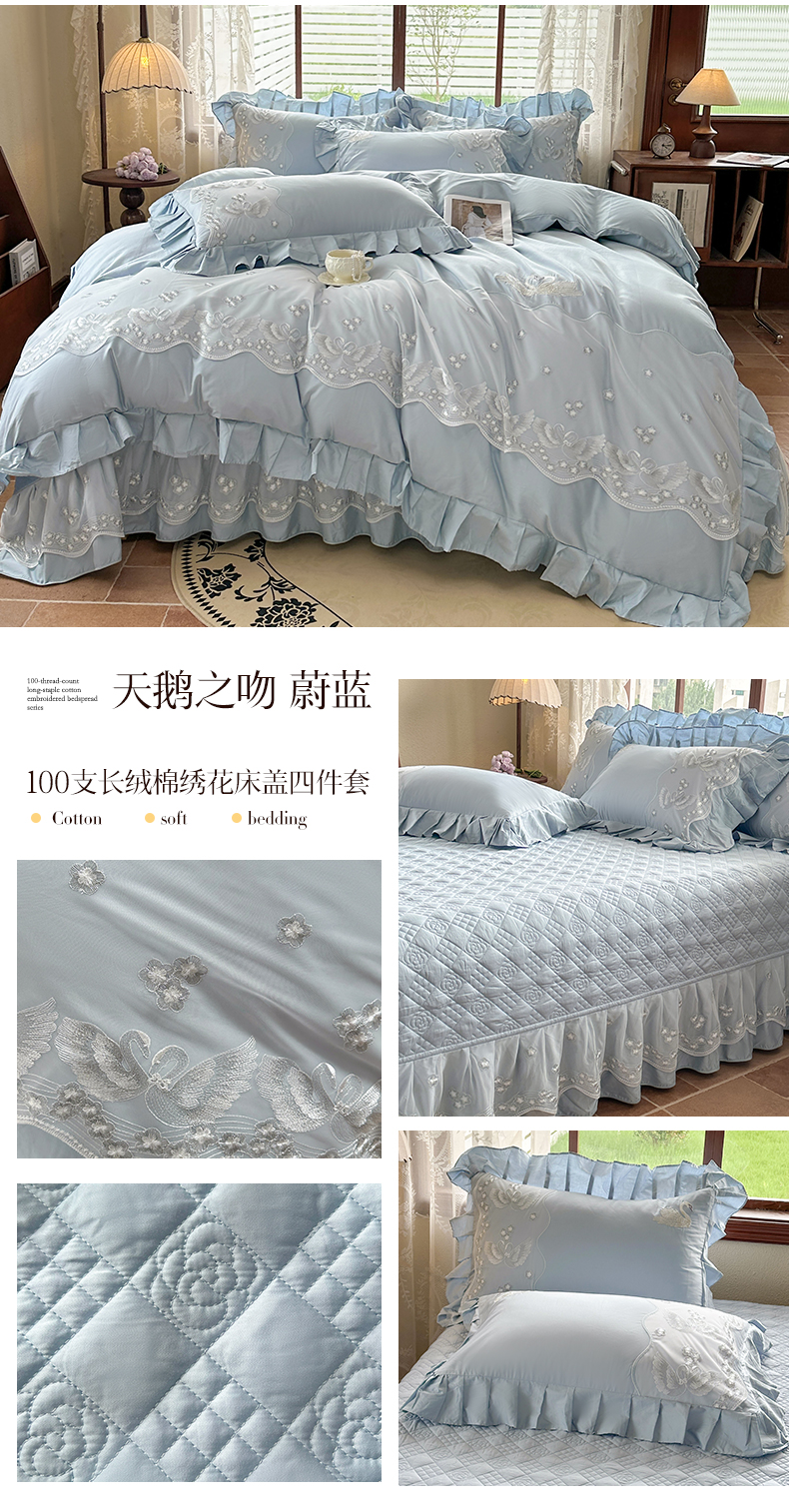 宜凡家纺 2025新款长绒棉绣花夹棉床盖四件套--天鹅之吻系列 天鹅之吻 蔚蓝