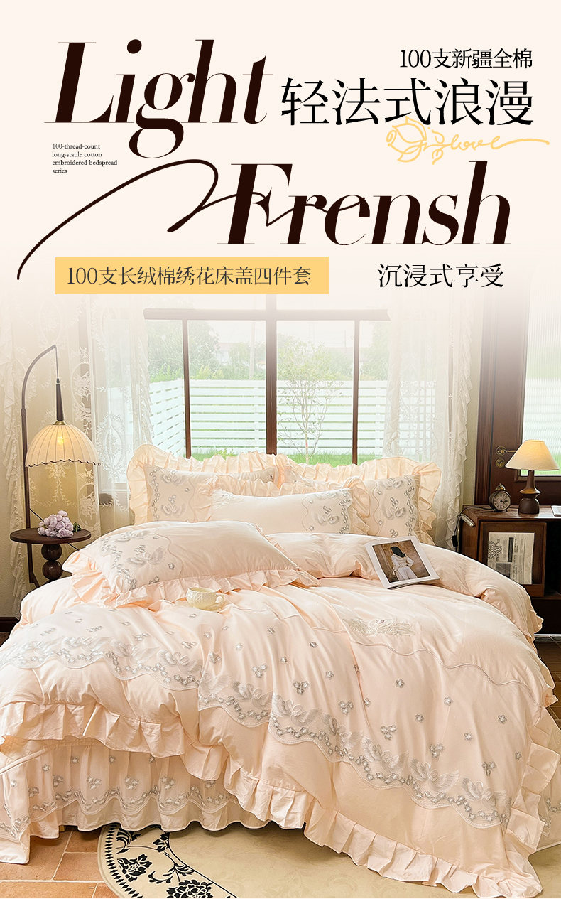 (总)宜凡家纺 2025新款牛奶绒雕花拼接刺绣床裙四件套,晨雾蔷薇,蝶恋花语,花野漫屿,蕾丝蝶音,洛可可影,雾蓝漫织,香槟漫月