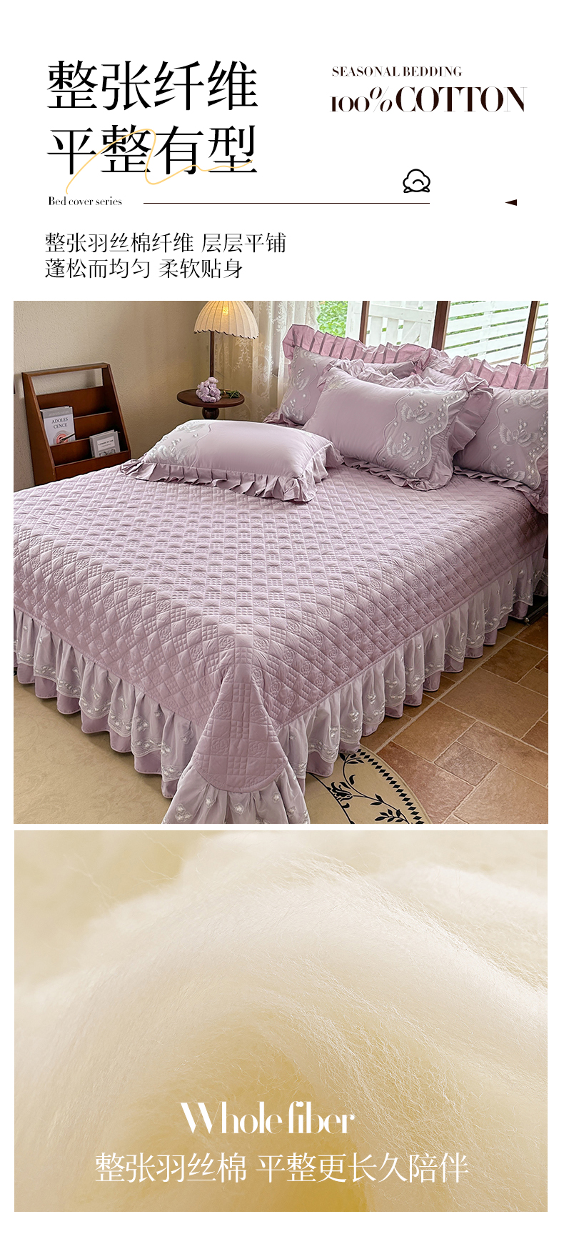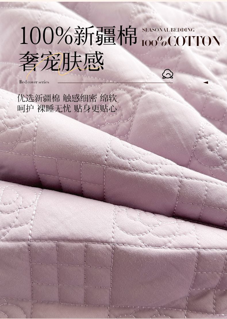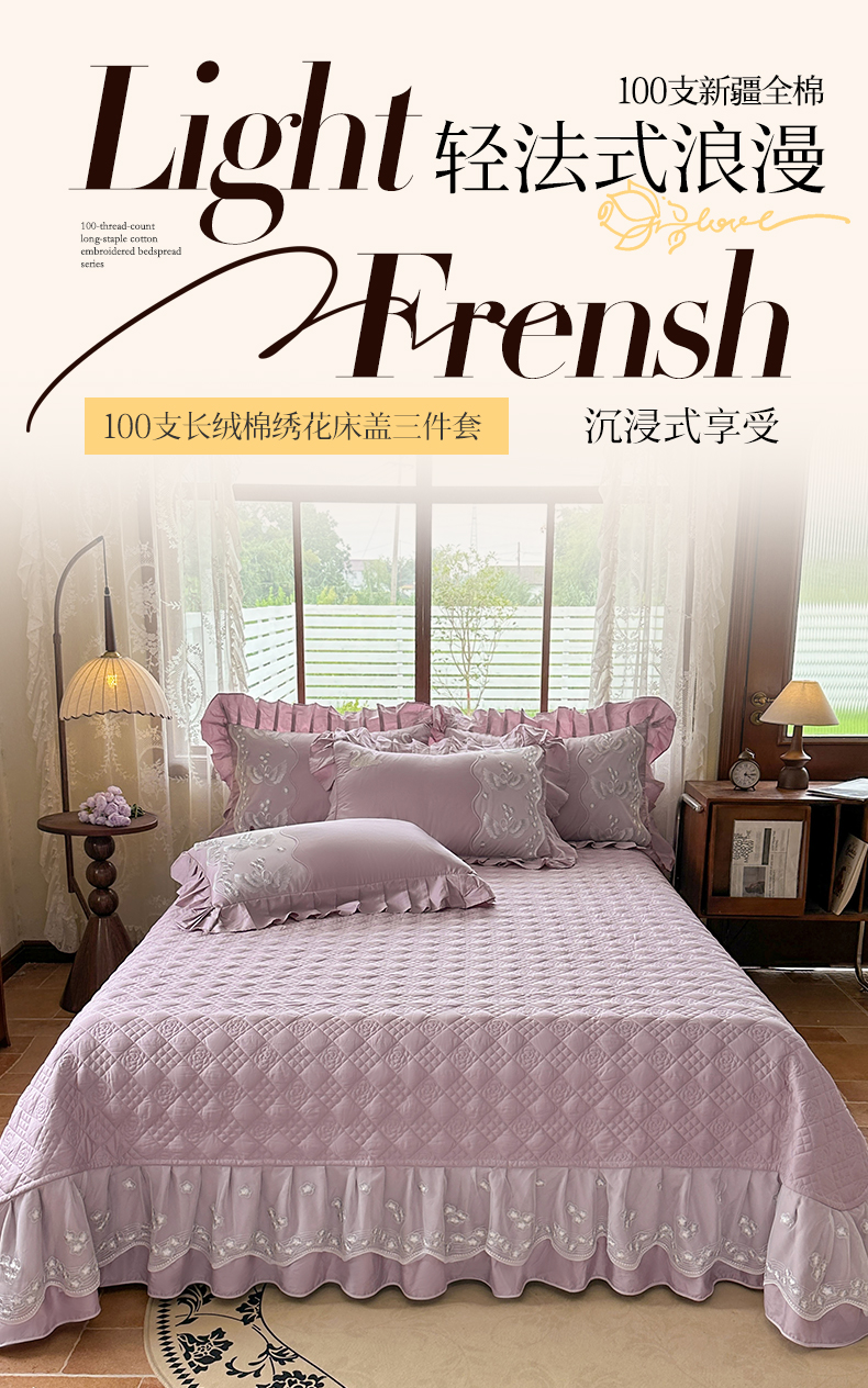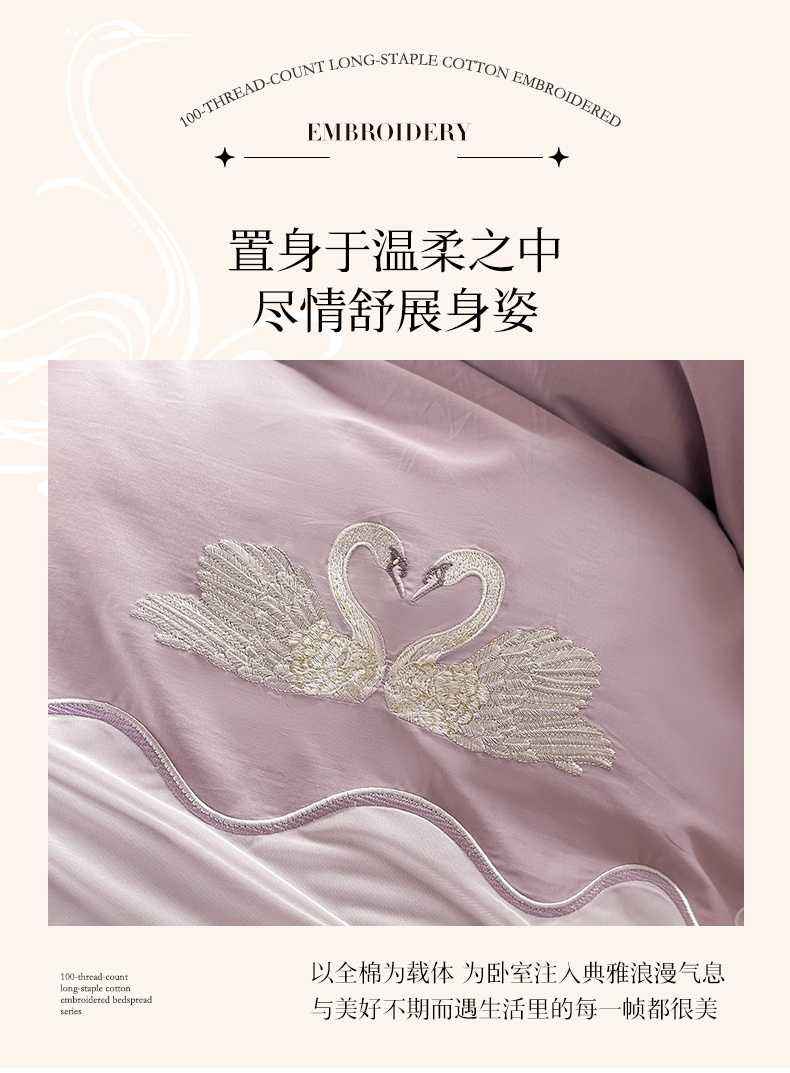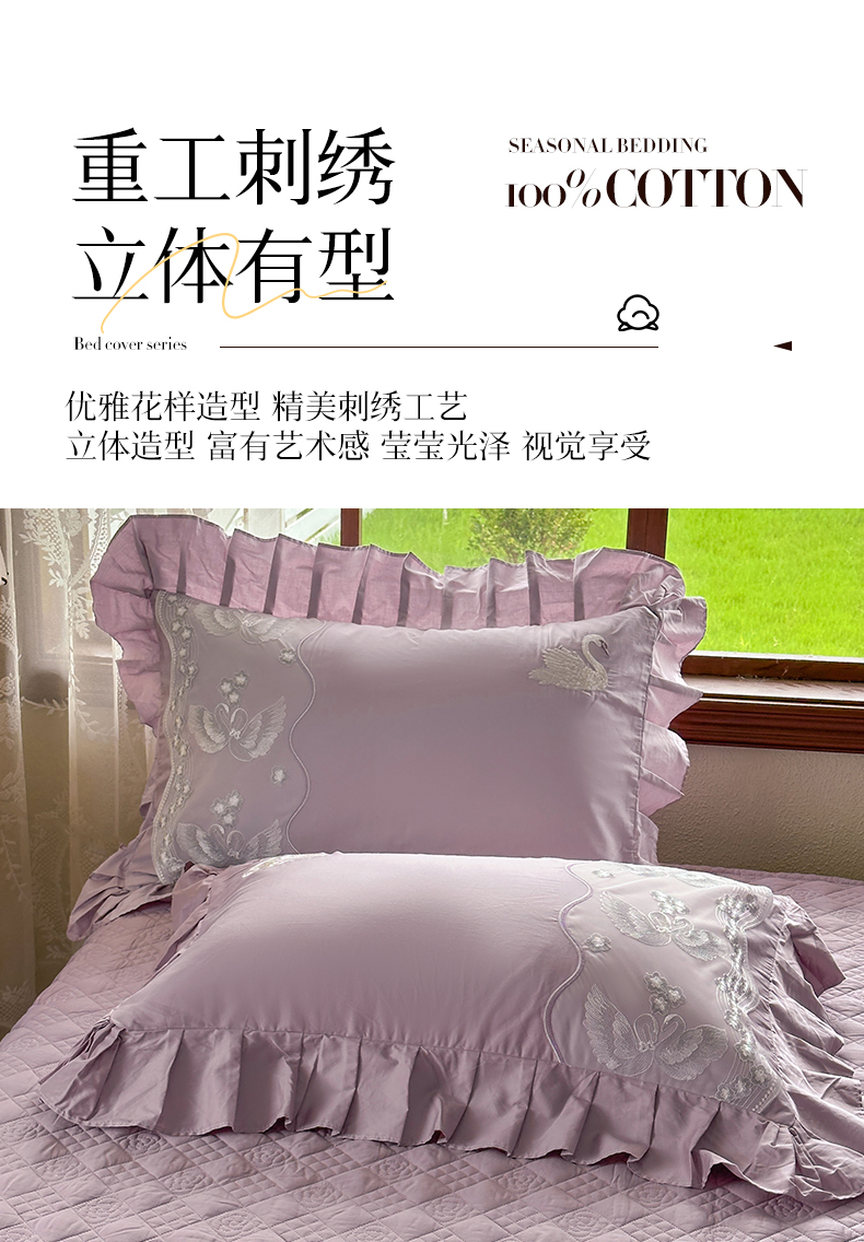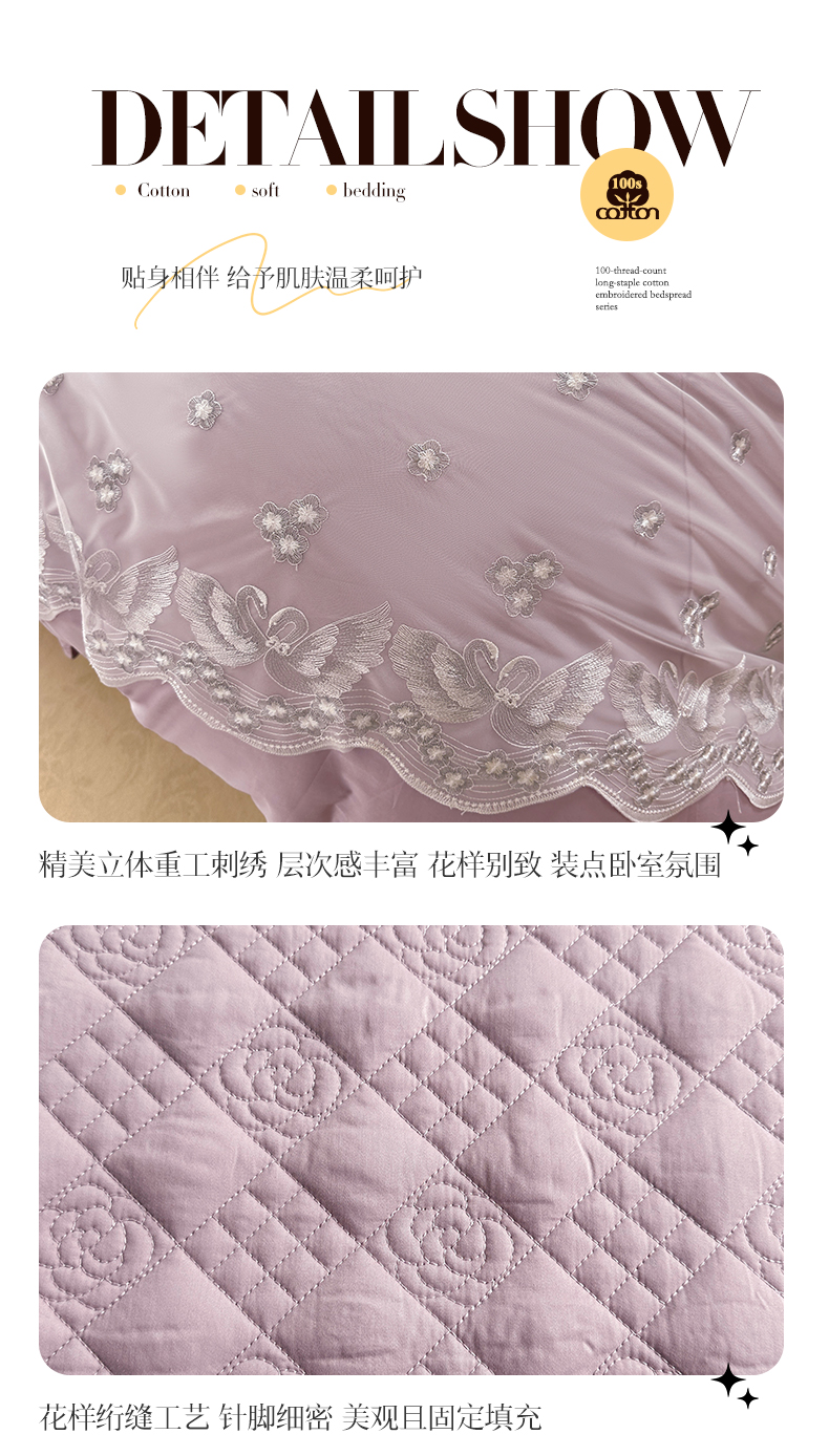 宜凡家纺 2025新款长绒棉绣花夹棉床盖三件套--天鹅之吻系列 天鹅之吻 香芋紫