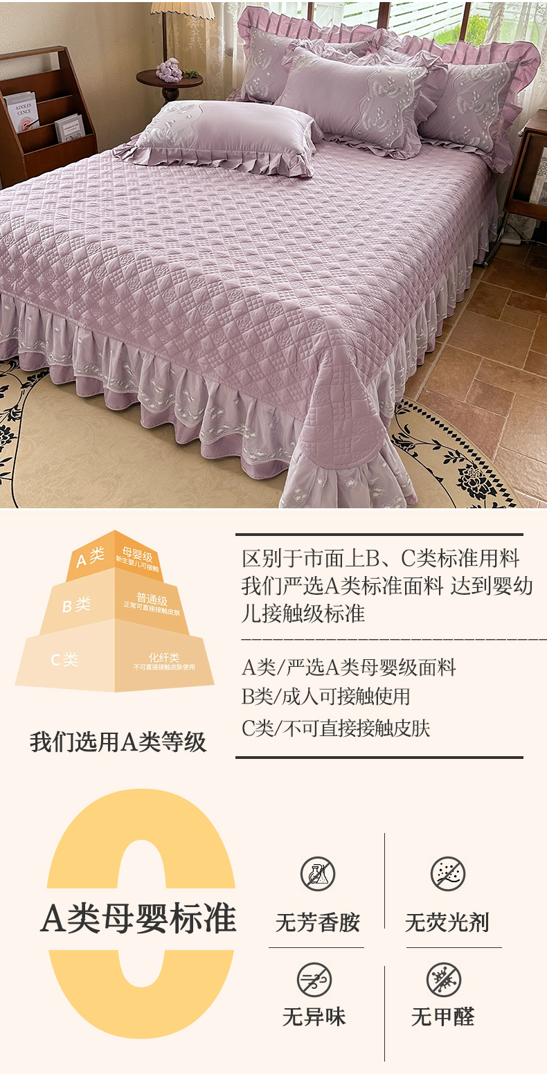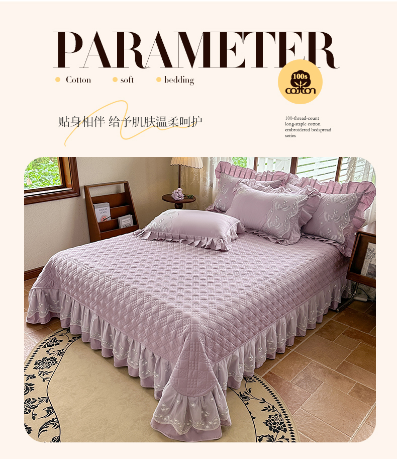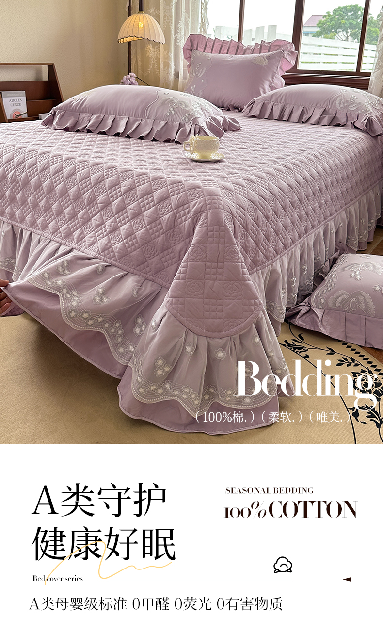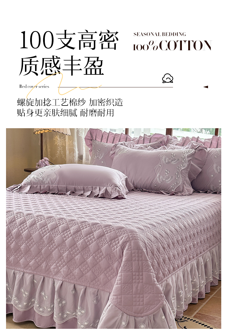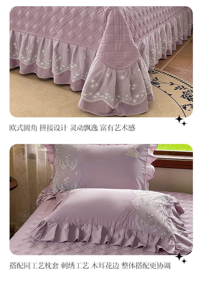 商品名称:宜凡家纺 2025新款长绒棉绣花夹棉床盖三件套--天鹅之吻系列 天鹅之吻 香芋紫