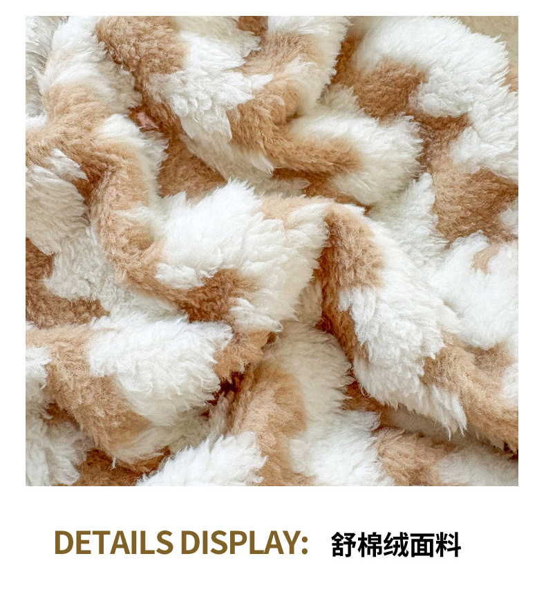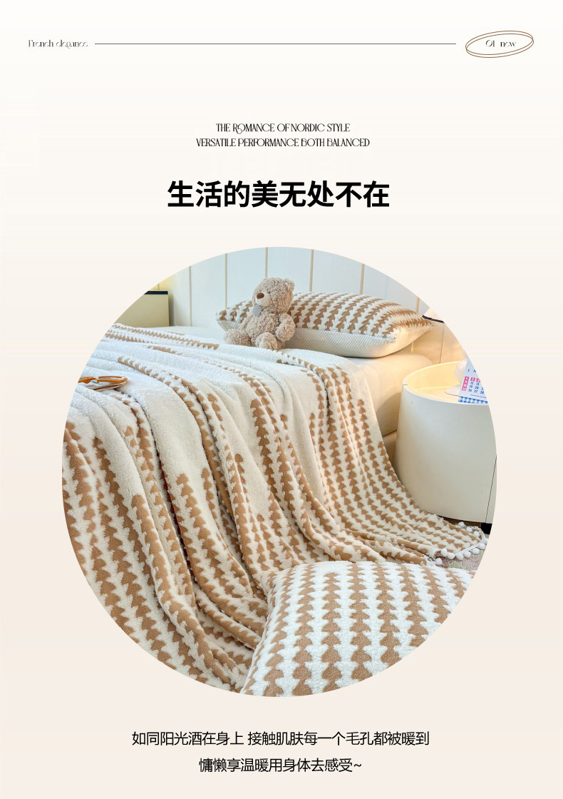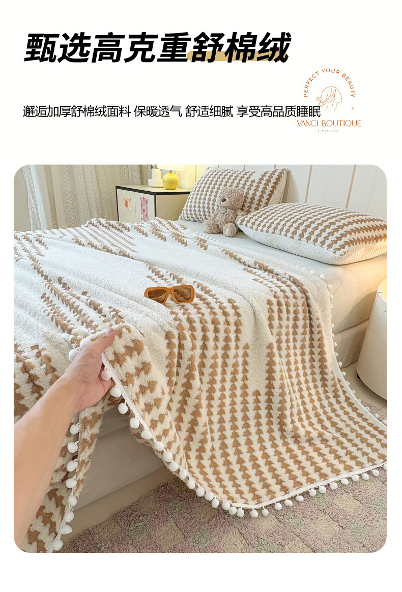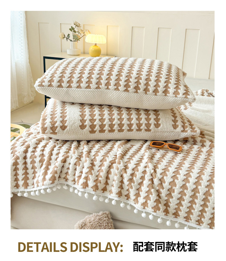 商品名称:恋佳居 2025新款高克重提花舒棉绒吊球花边毛毯 节节高-卡其色