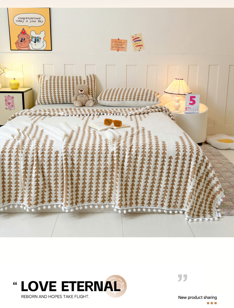 (总)恋佳居 2025新款高克重提花舒棉绒吊球花边毛毯,蝴蝶结,蝶儿飞,节节高-黑色,节节高-灰色,节节高-卡其色