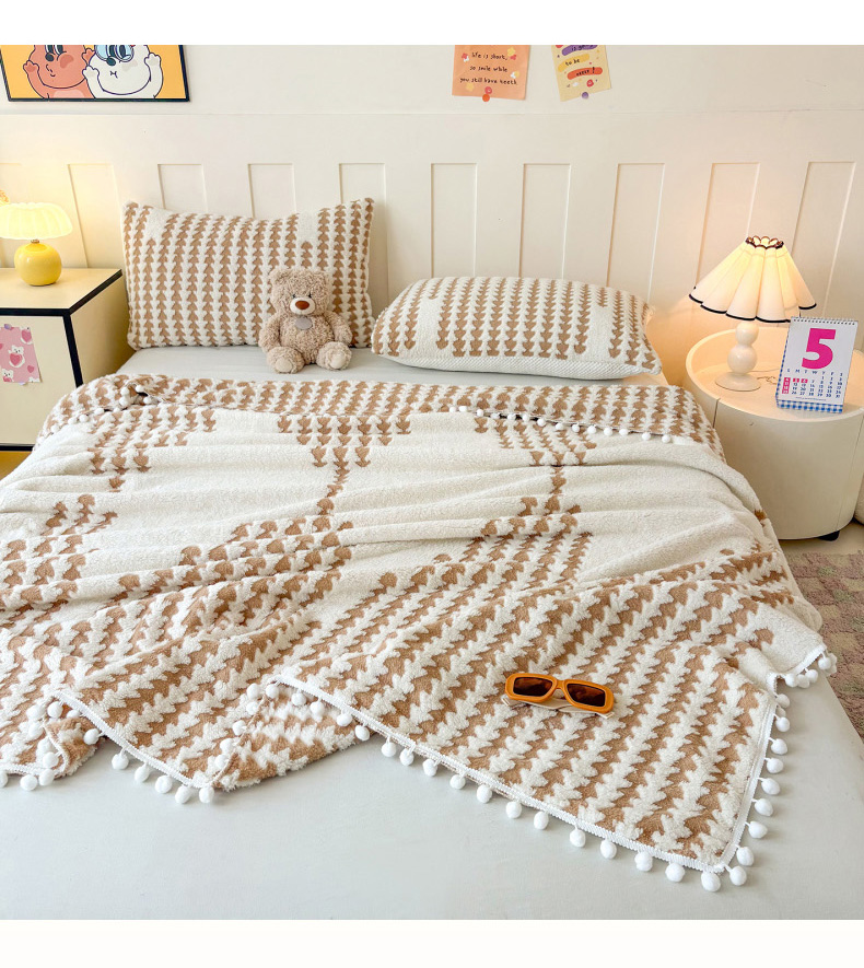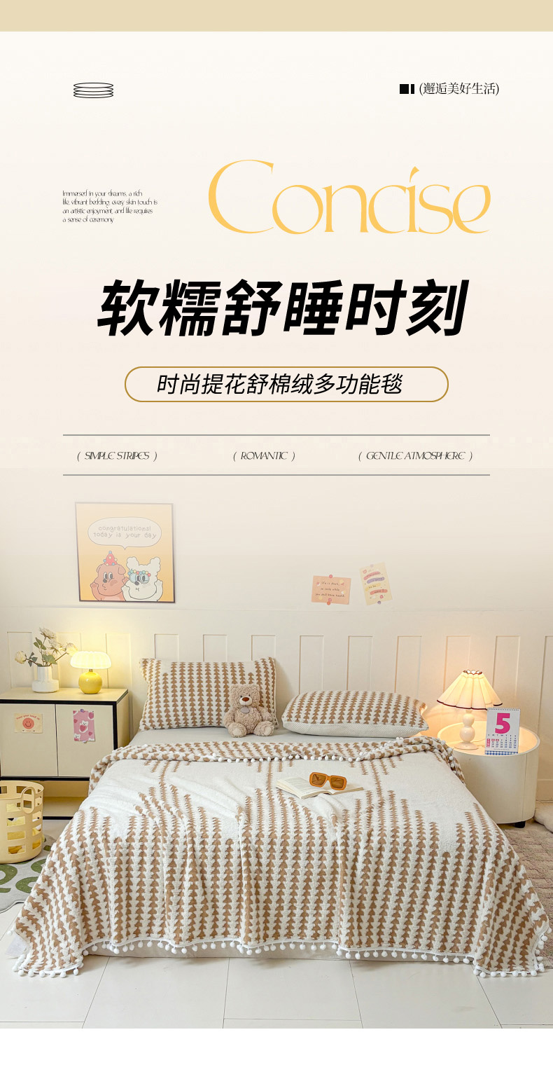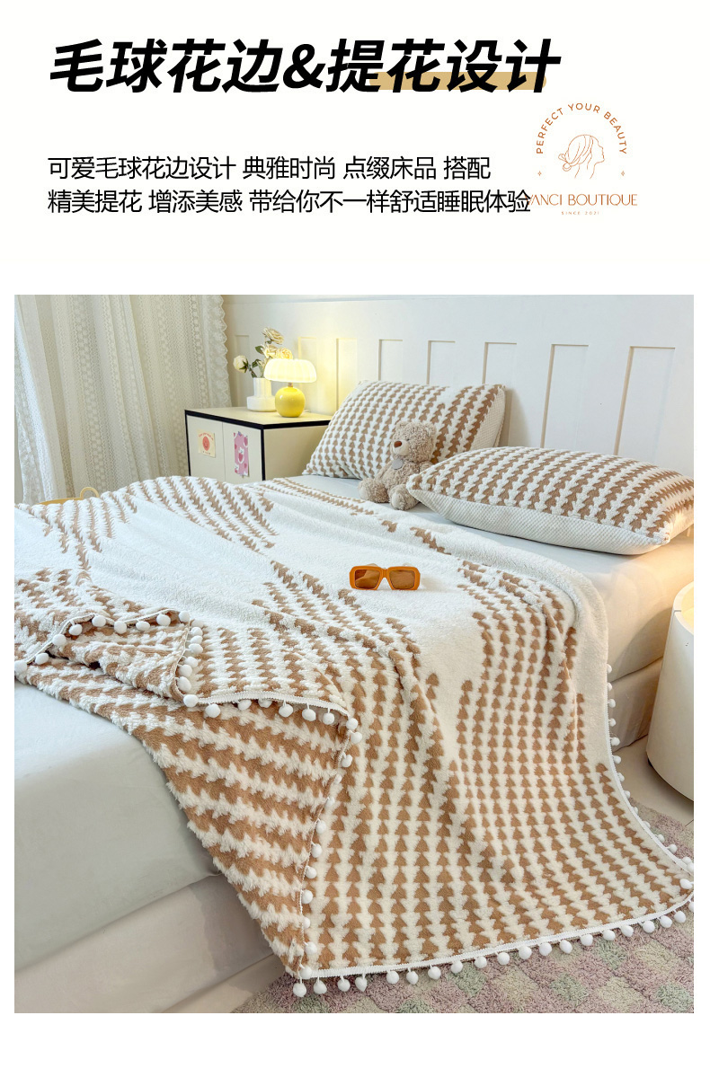 恋佳居 2025新款高克重提花舒棉绒吊球花边毛毯 节节高-卡其色