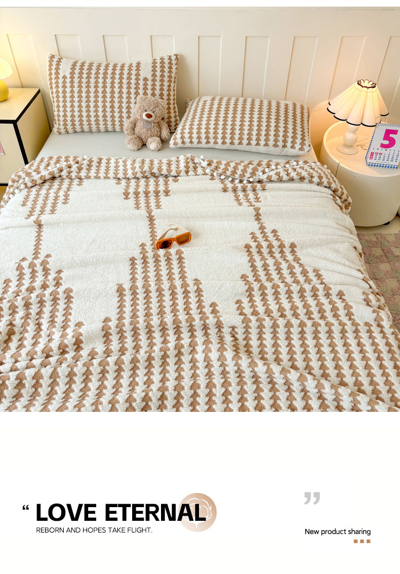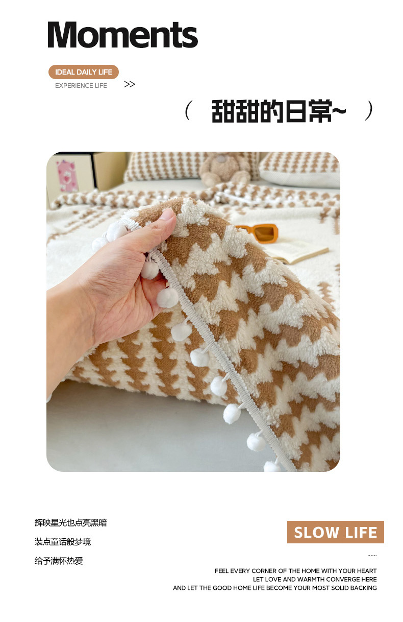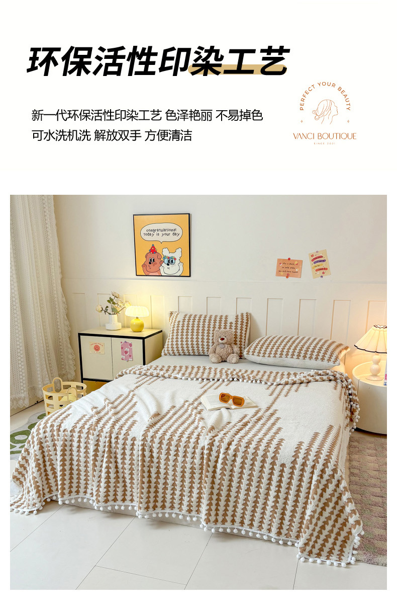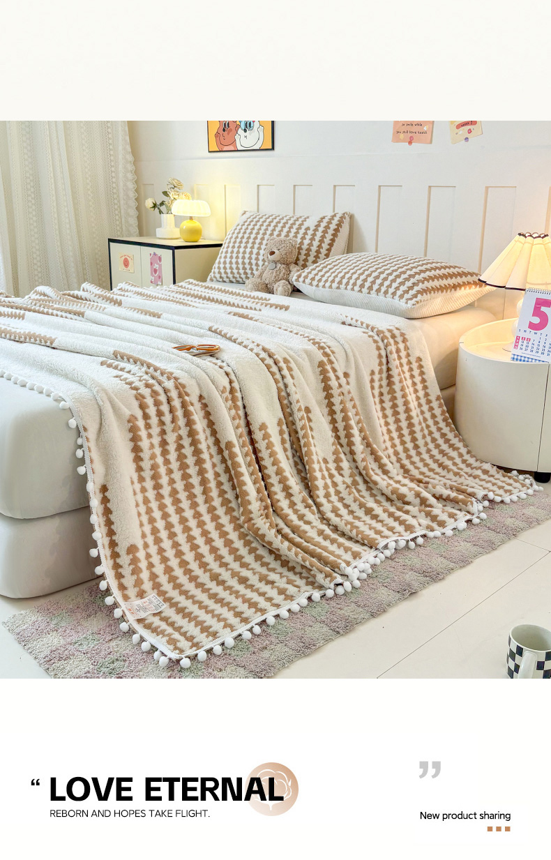 恋佳居 2025新款高克重提花舒棉绒吊球花边毛毯 节节高-卡其色
