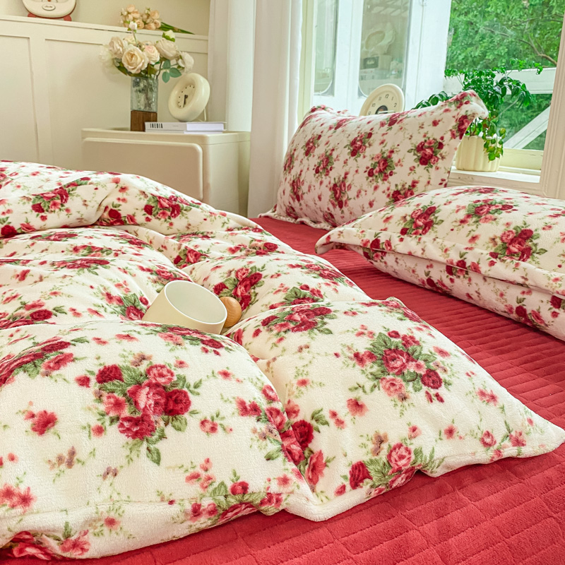 商品名称:尚美 2025新款热卖款亲肤舒适加绒加厚牛奶绒花边床盖款四件套双面绒 梨花落AA