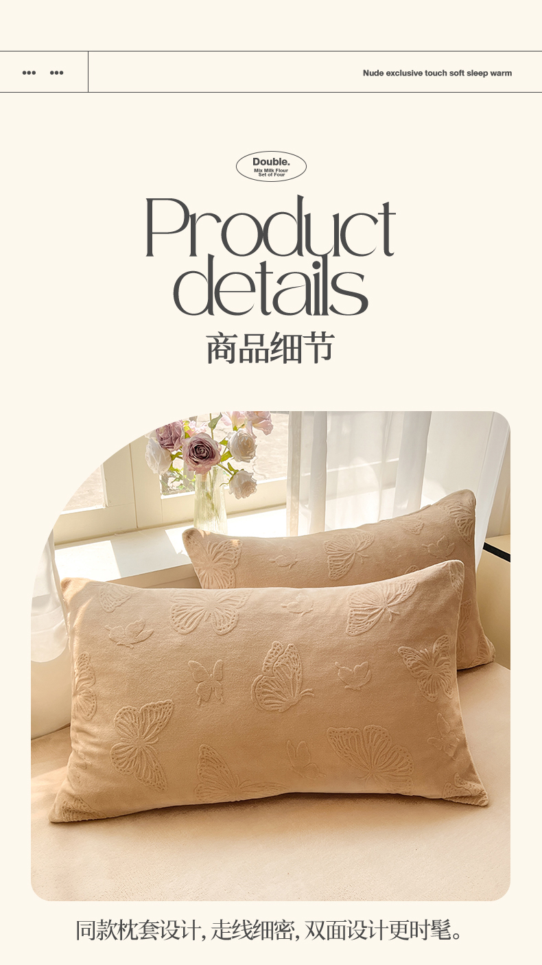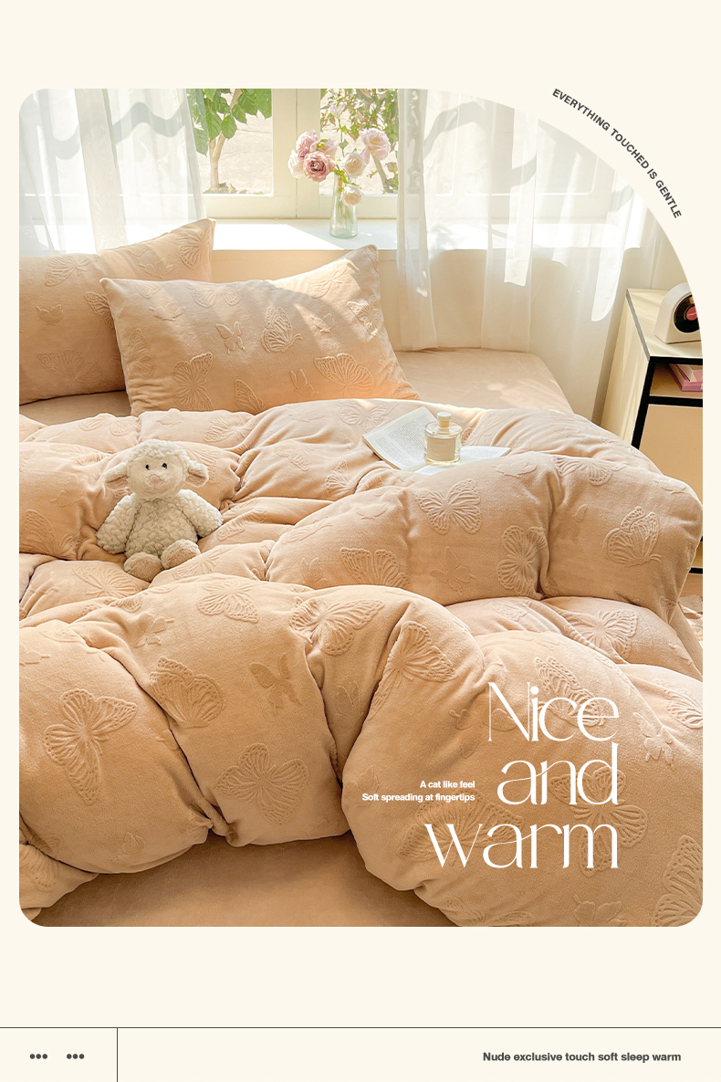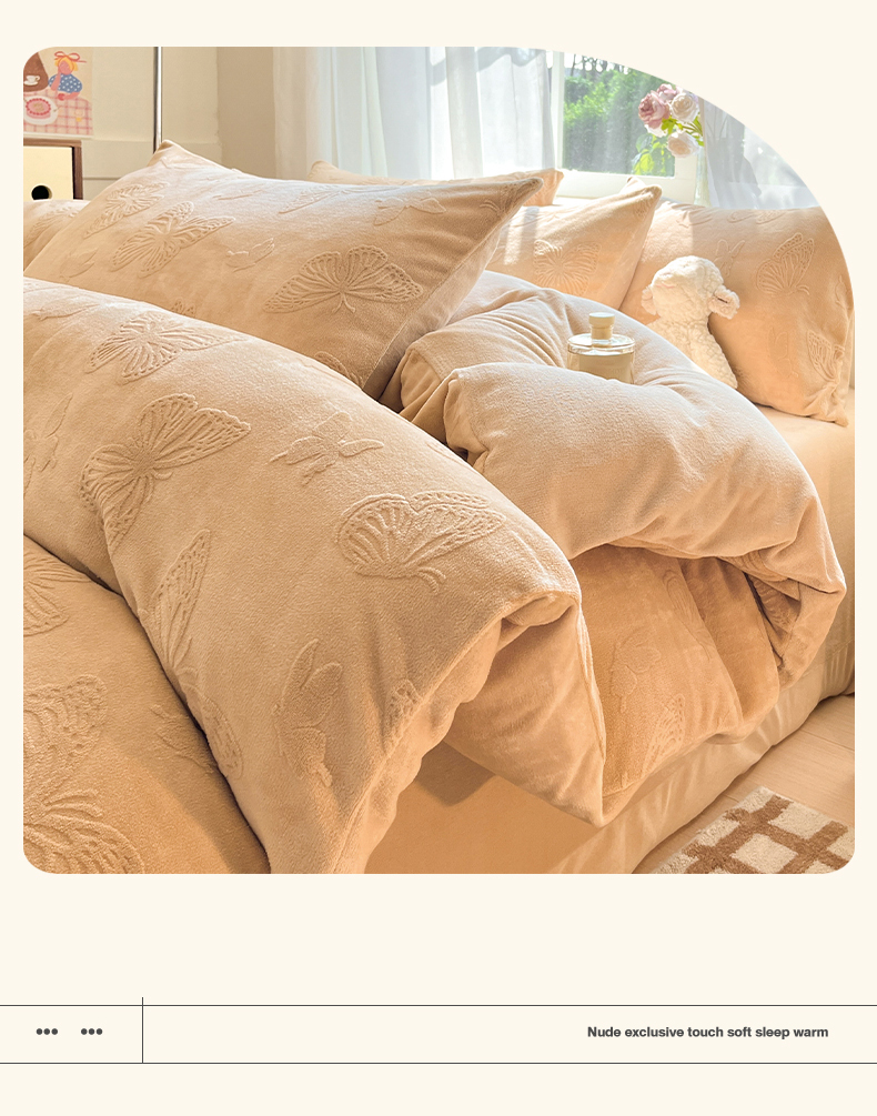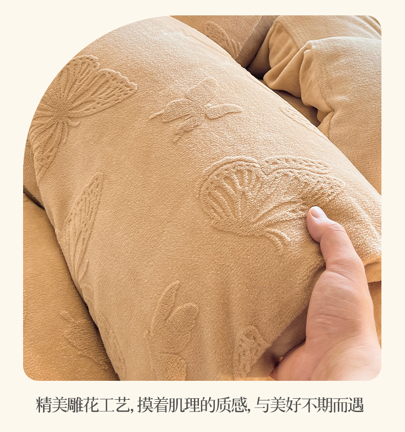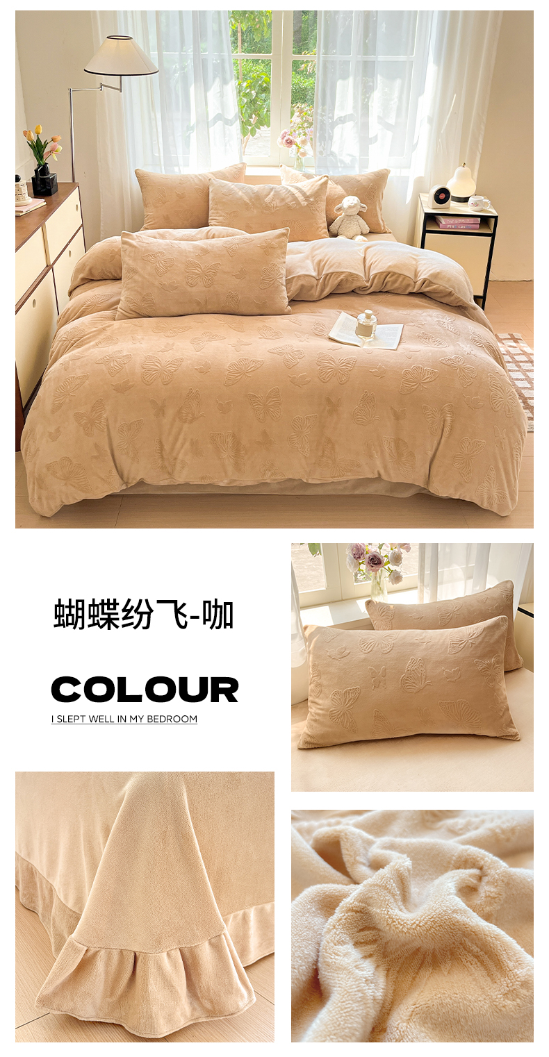 商品名称:绘萱家居 2025新款高克重雕花雕印纯色牛奶绒四件套双拼法莱绒珊瑚绒 蝴蝶纷飞-咖