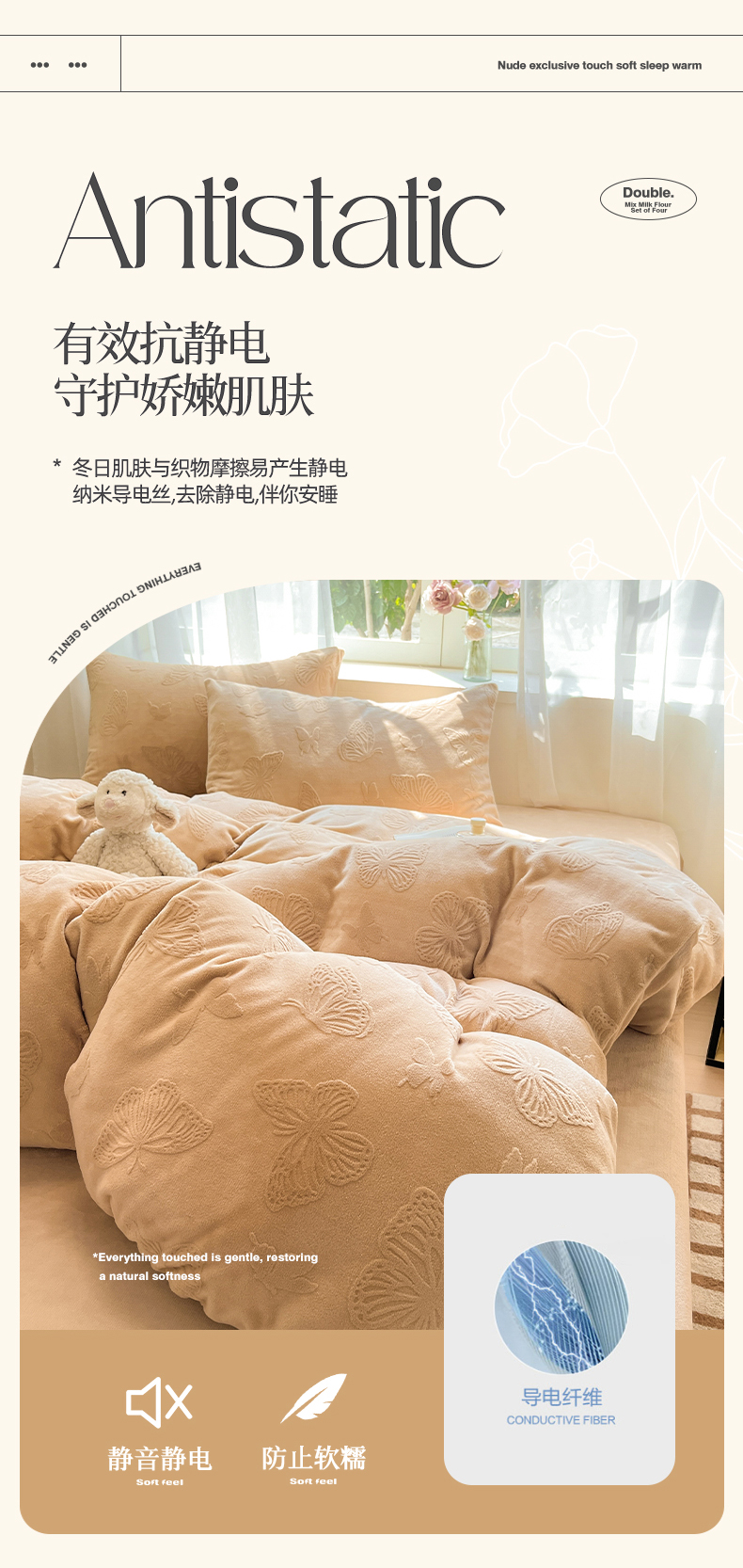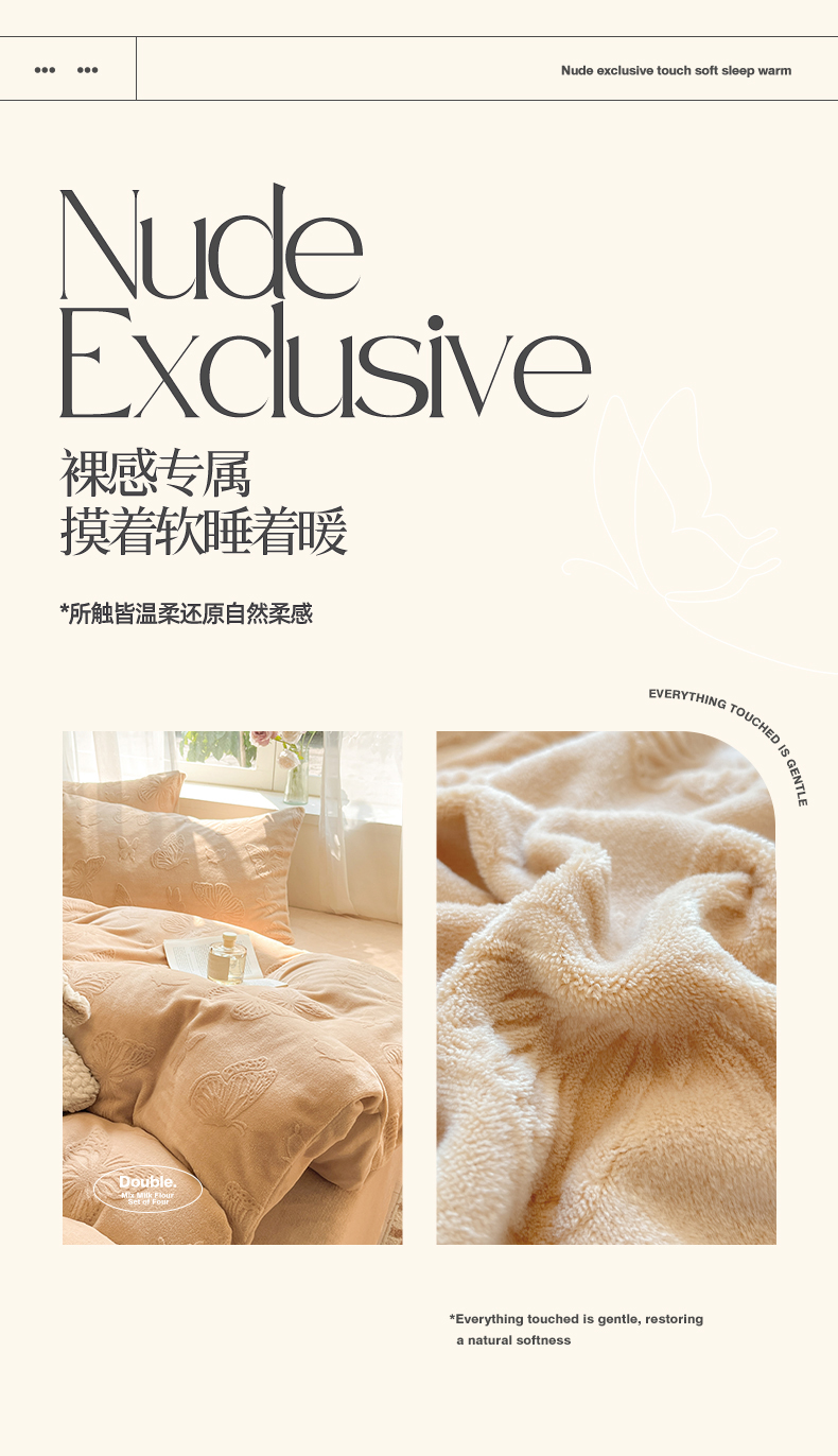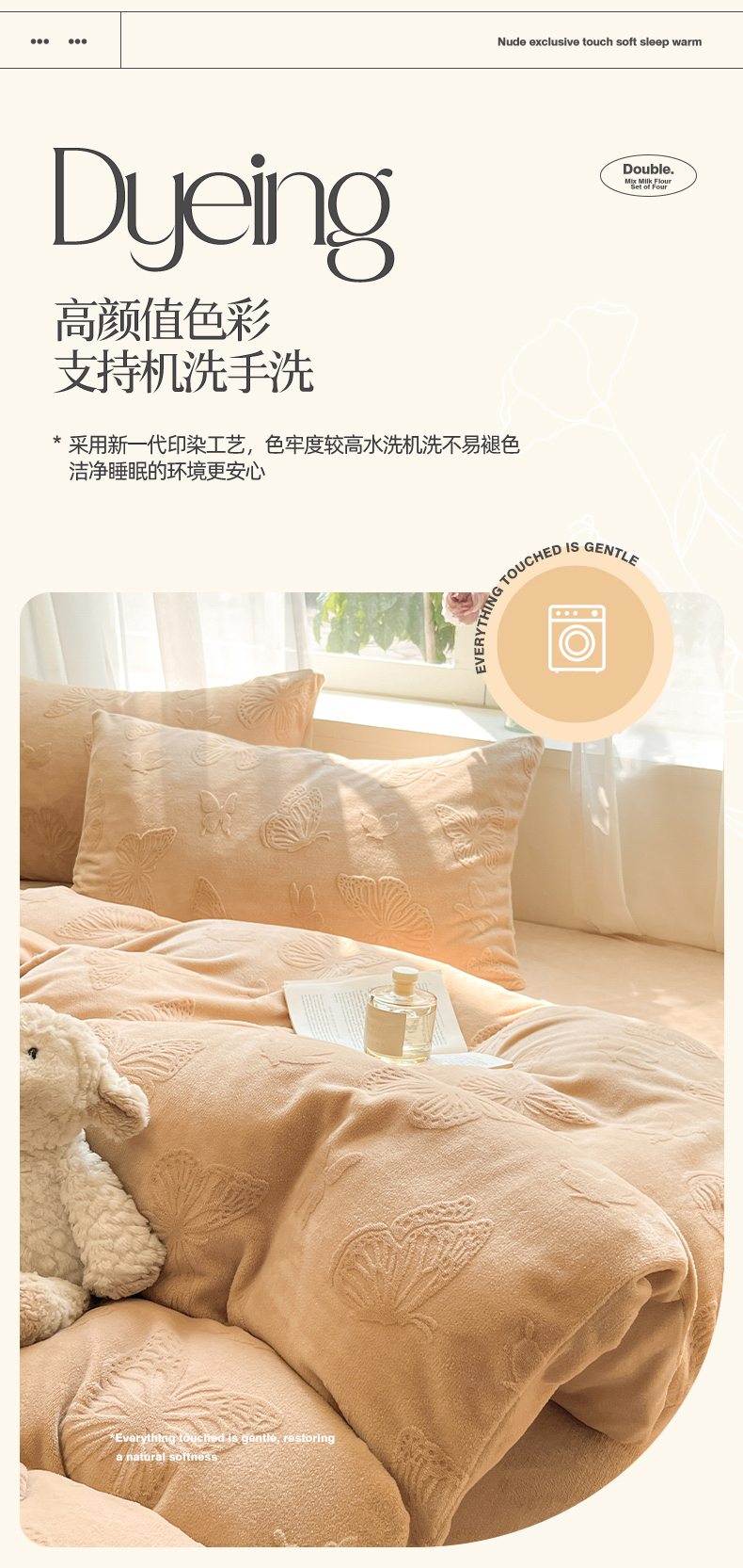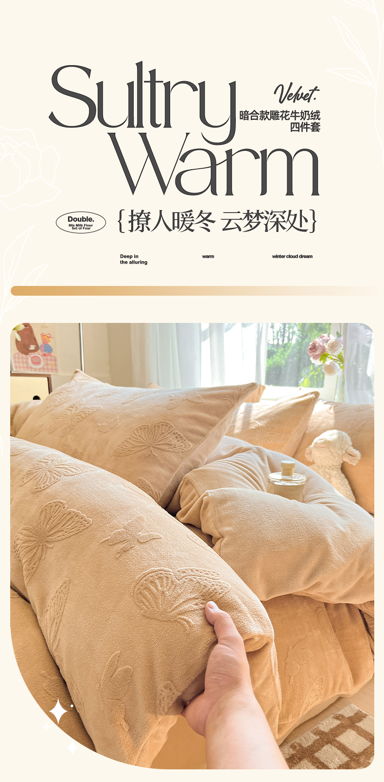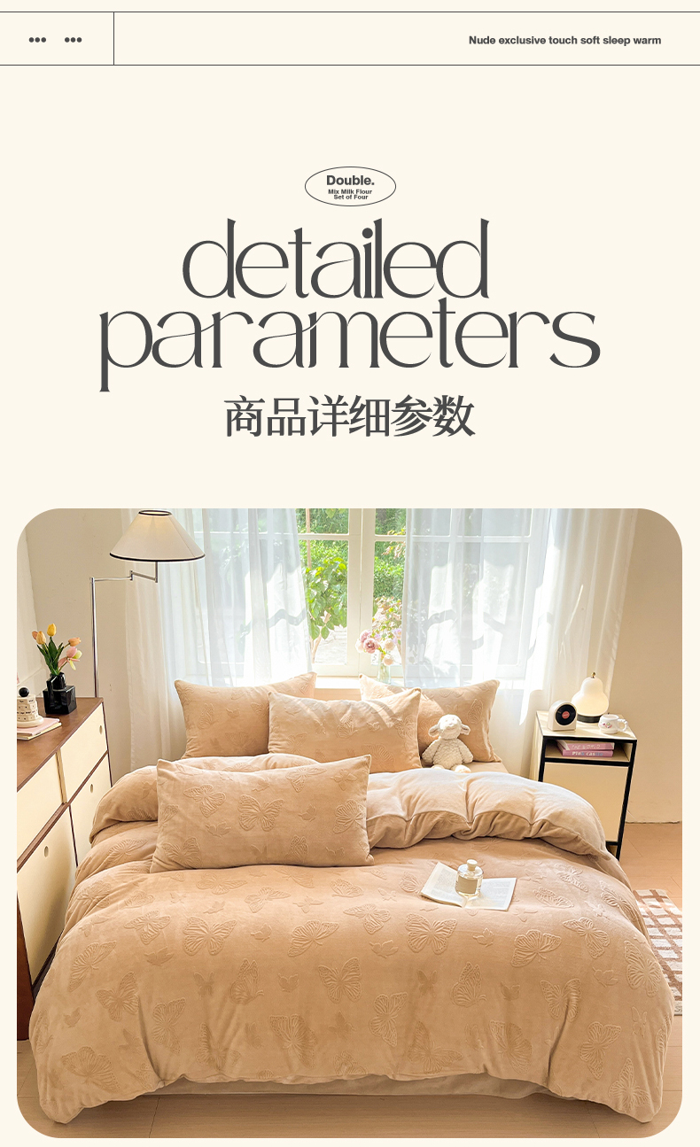 商品名称:绘萱家居 2025新款高克重雕花雕印纯色牛奶绒四件套双拼法莱绒珊瑚绒 蝴蝶纷飞-咖