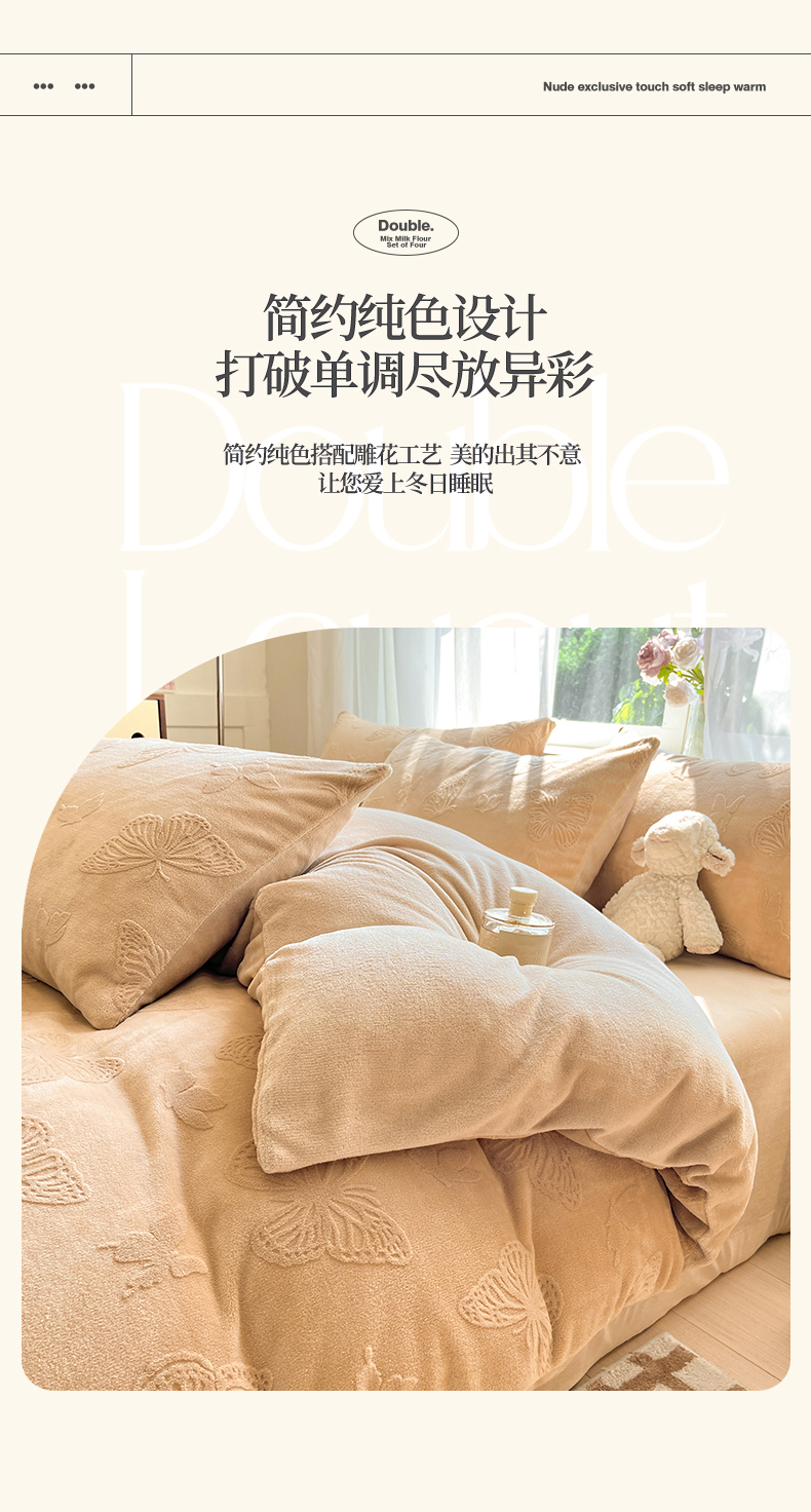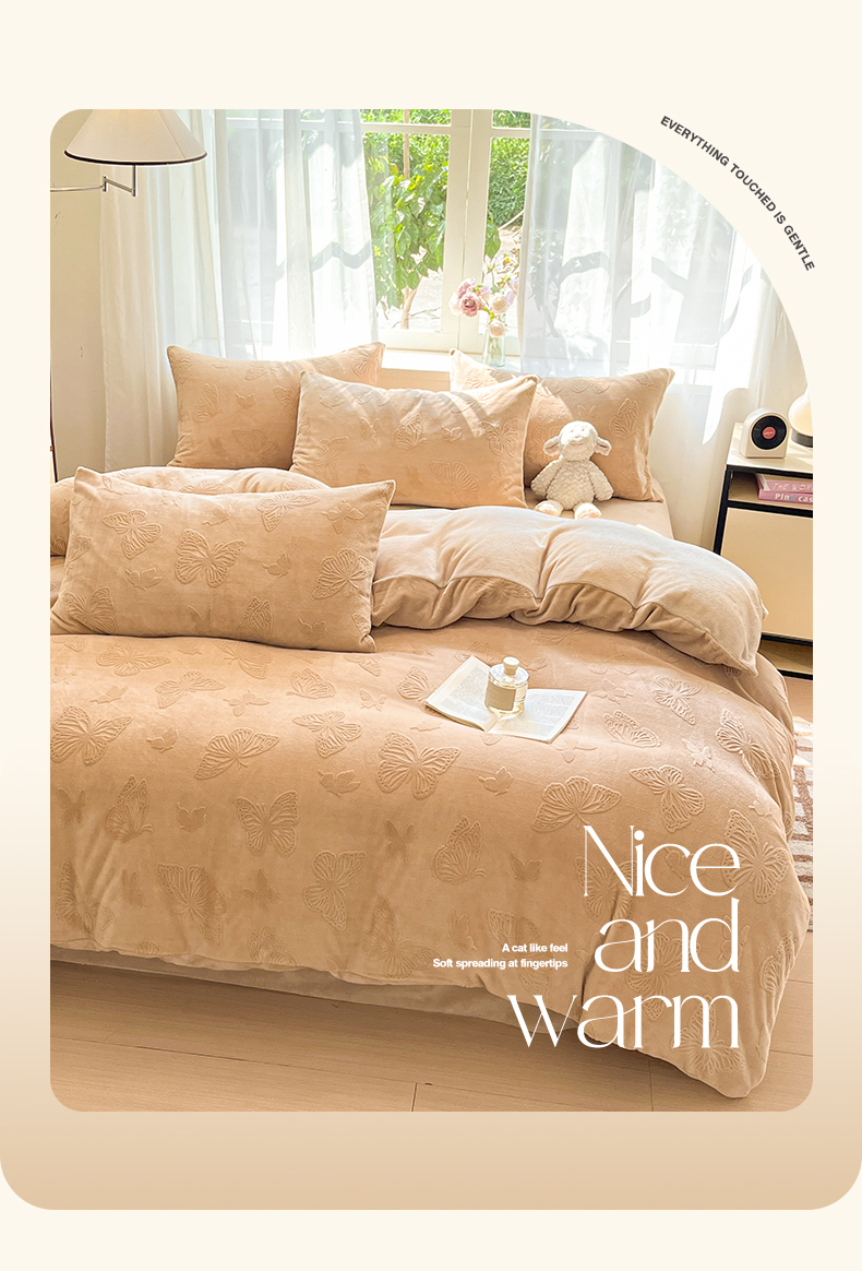 绘萱家居 2025新款高克重雕花雕印纯色牛奶绒四件套双拼法莱绒珊瑚绒 蝴蝶纷飞-咖