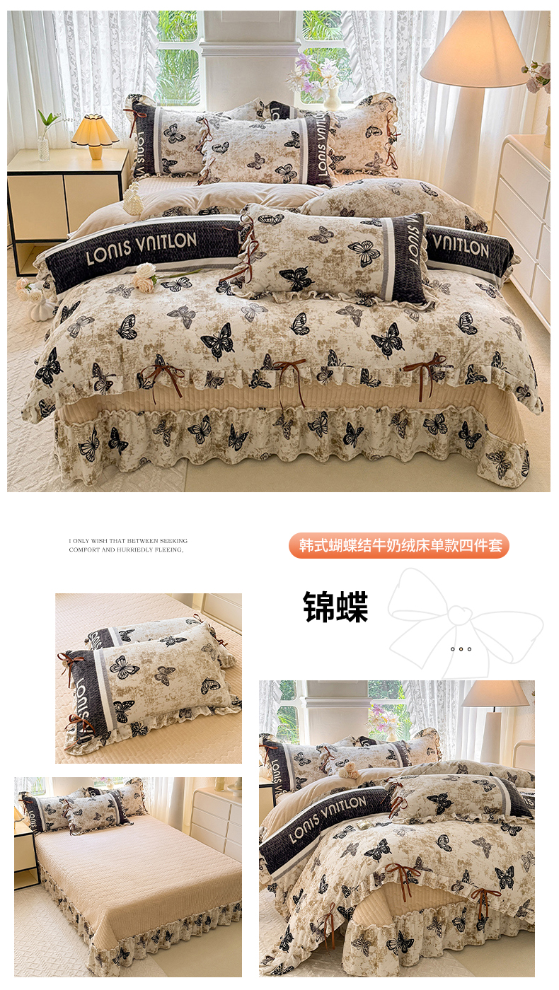商品名称:韩约家纺 2025新款韩式蝴蝶结牛奶绒床盖款四件套 蝶花