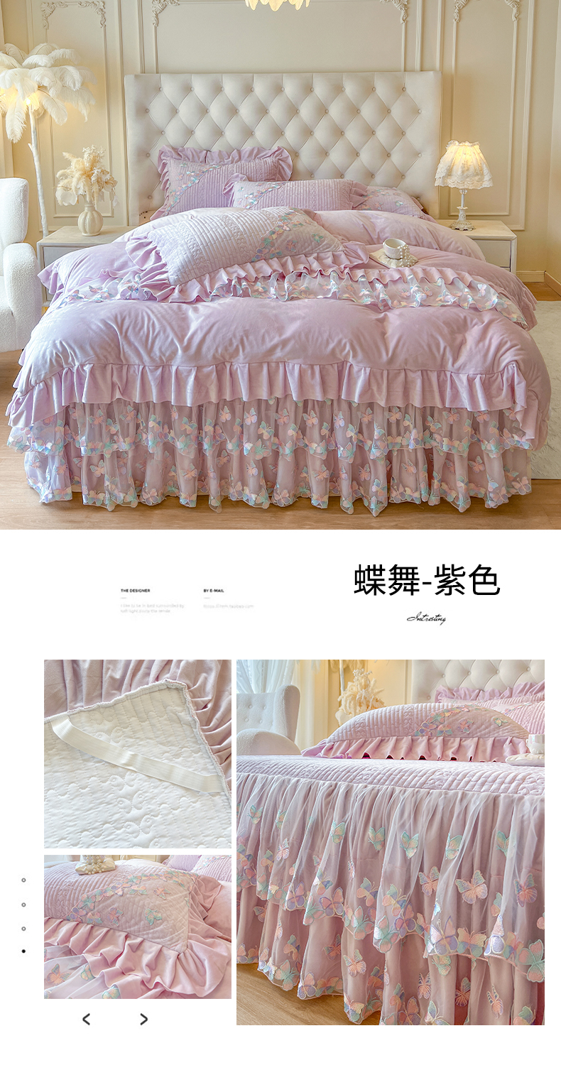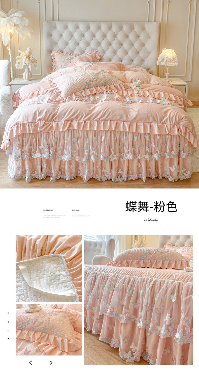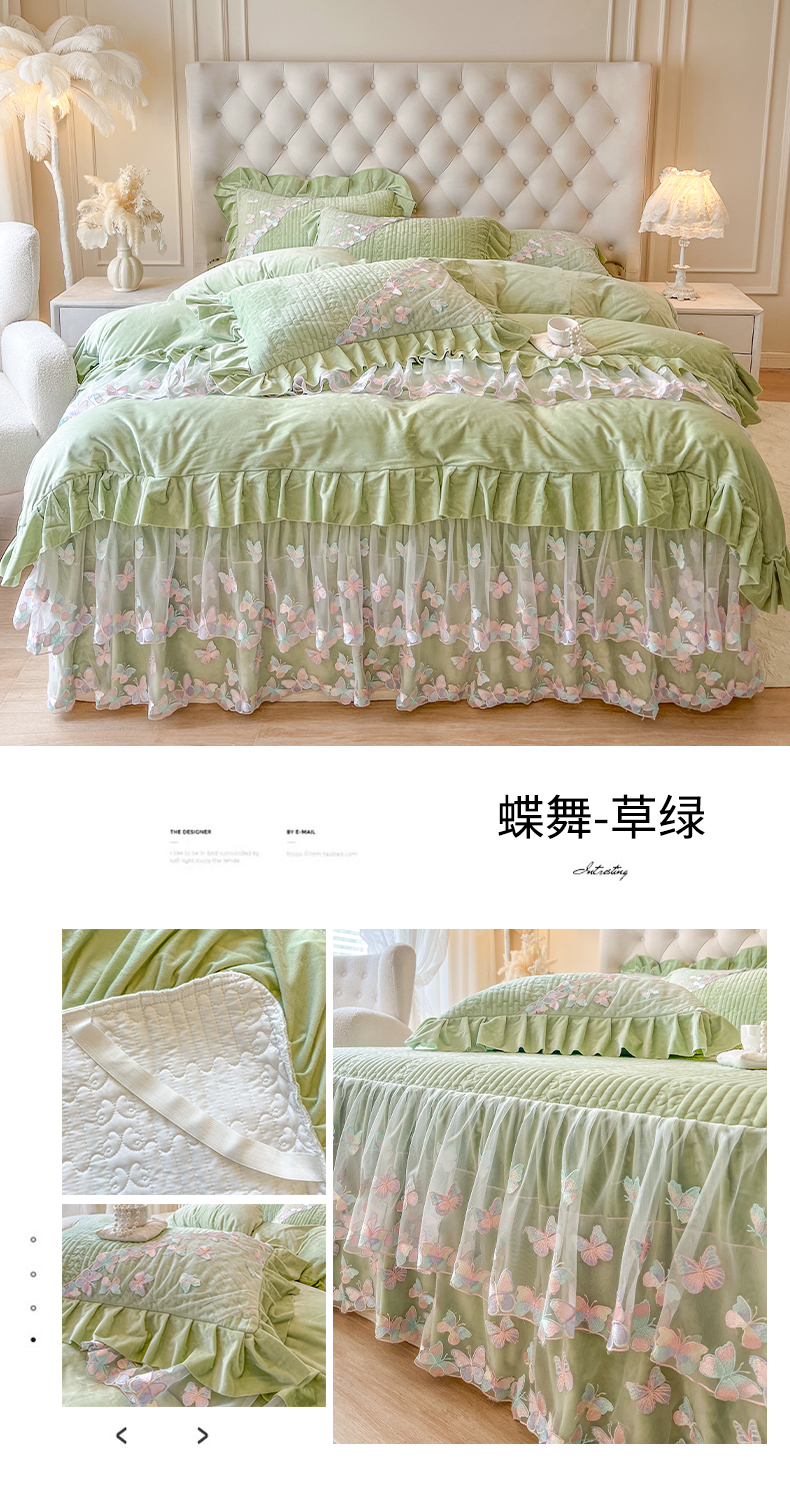 商品名称:瑞宝 2025新款宝宝绒重工刺绣花边床裙四件套-梦蝶 梦蝶-浅透玉(控价 318起)