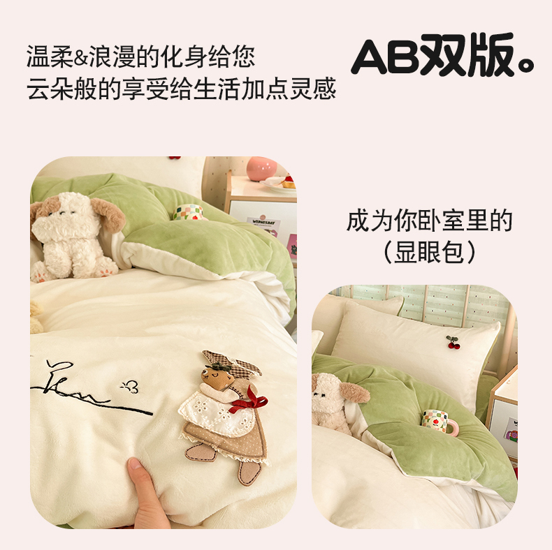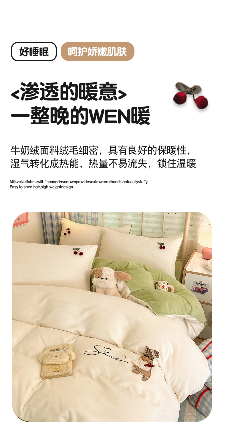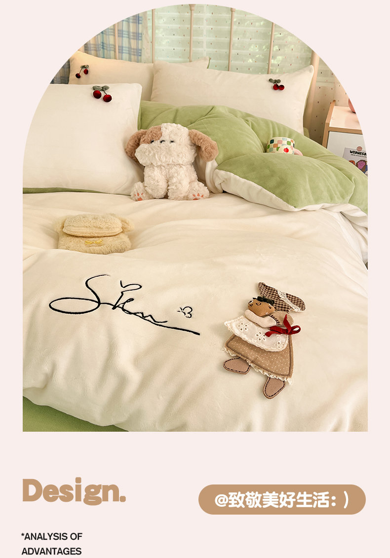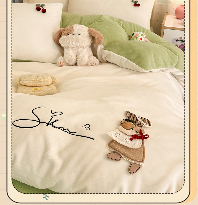 (总)羚羊语家纺 2025新款牛奶绒手作款樱桃女孩四件套毛巾绣刺绣花秋冬加厚法莱绒法兰绒珊瑚绒三件套(买家秀请联系客服!),手作女孩-奶油粉,毛巾绣-平古企鹅,手作女孩-柔雾紫,毛巾绣-自由大鹅,毛巾绣-腊肠狗,手作女孩-燕麦奶,手作女孩-清新绿