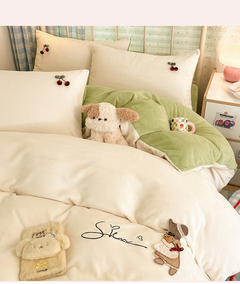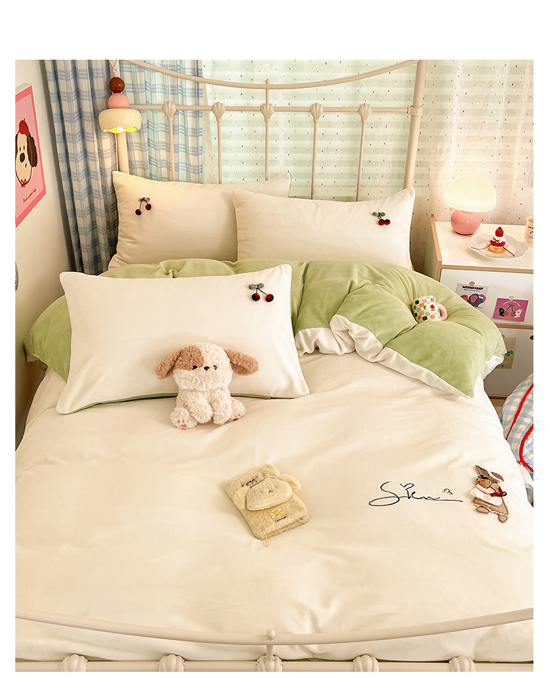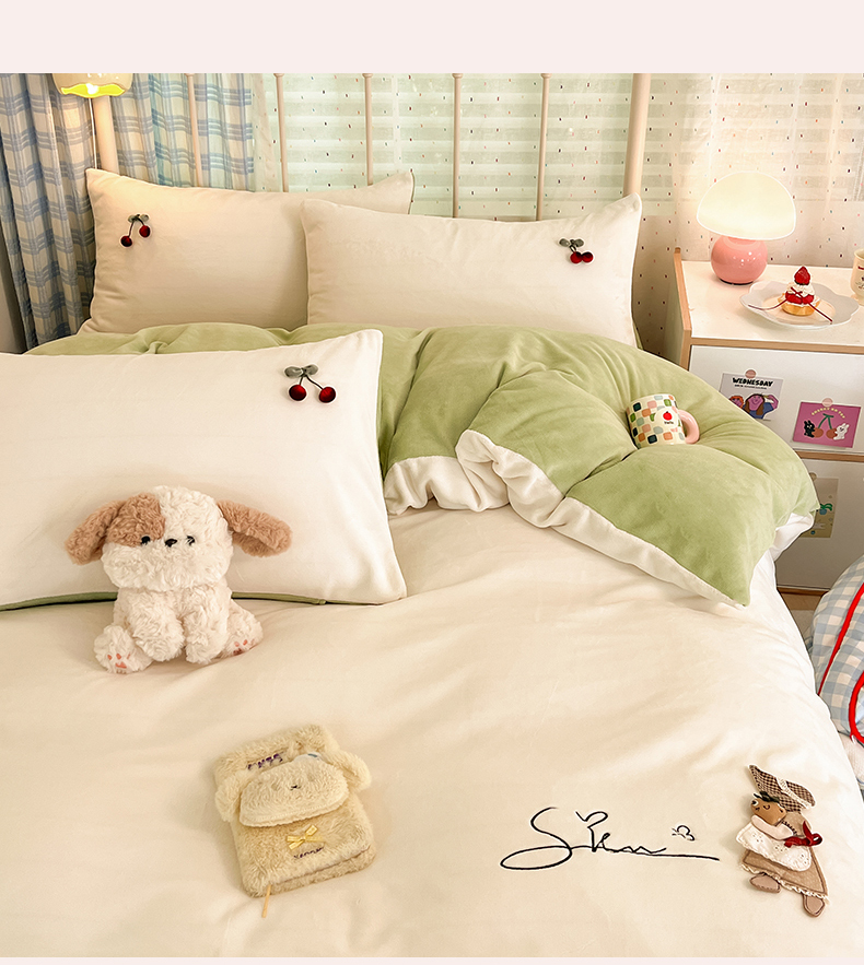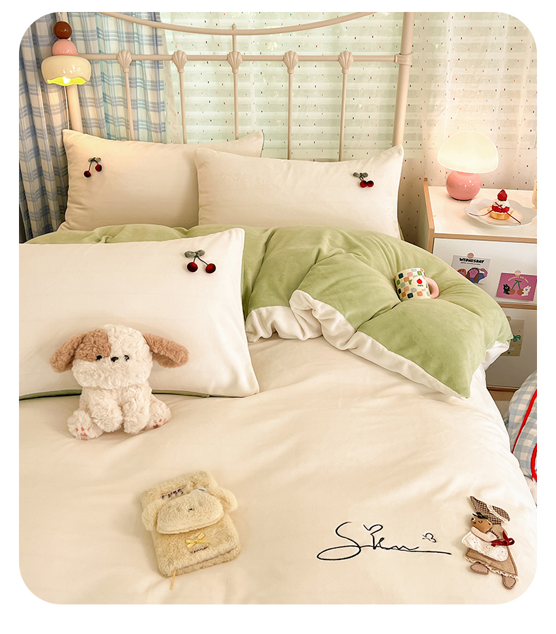 商品名称:羚羊语家纺 2025新款牛奶绒手作款樱桃女孩四件套毛巾绣刺绣花秋冬加厚法莱绒法兰绒珊瑚绒三件套 手作女孩-清新绿