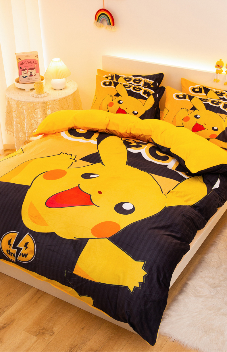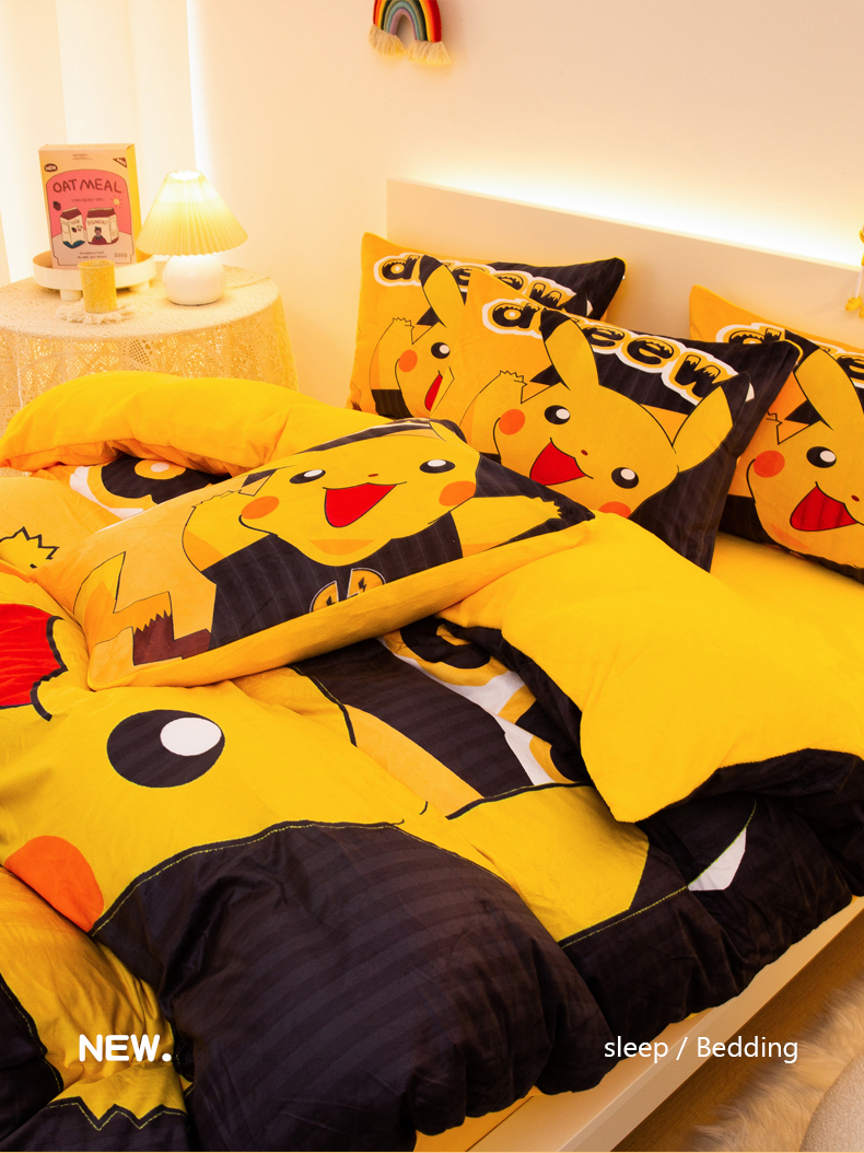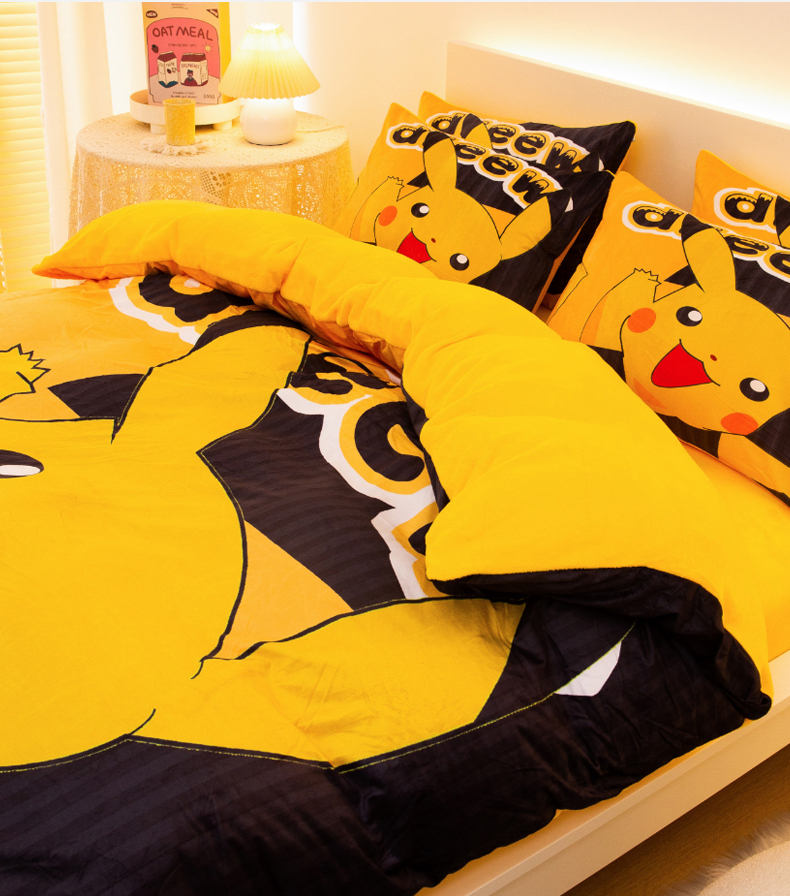 一电 2025外贸跨境电商儿童卡通床上四件套亲肤牛奶绒学生三件床单被套加大珊瑚宝宝卡通单被套 闪电皮卡丘