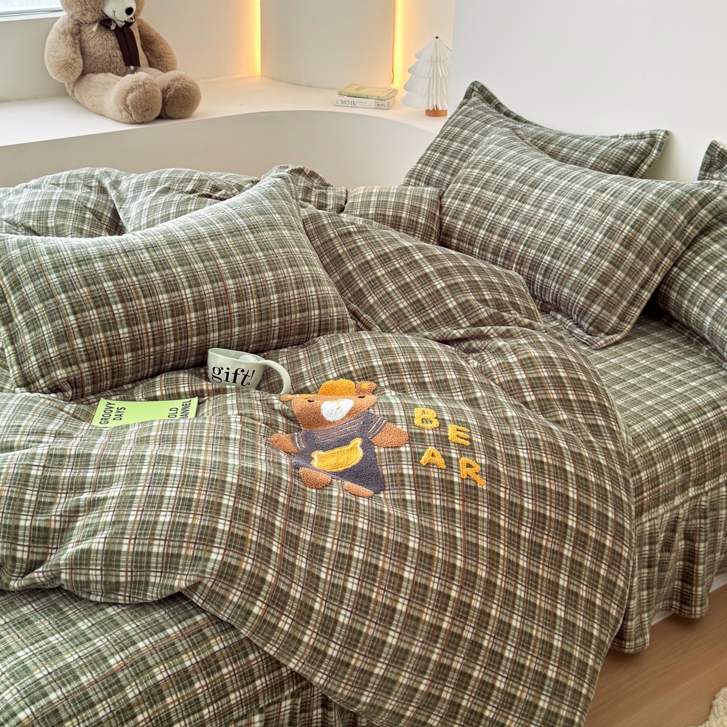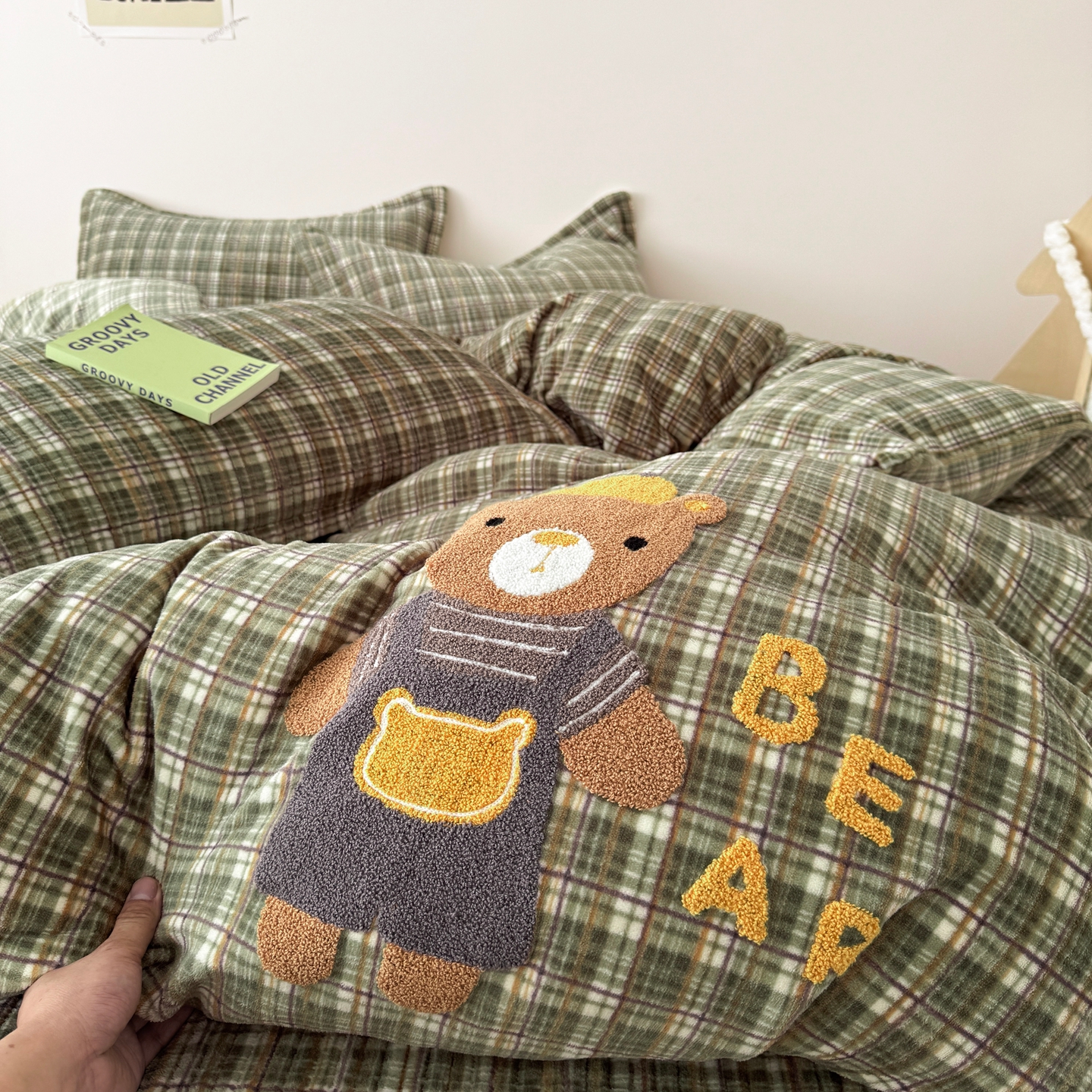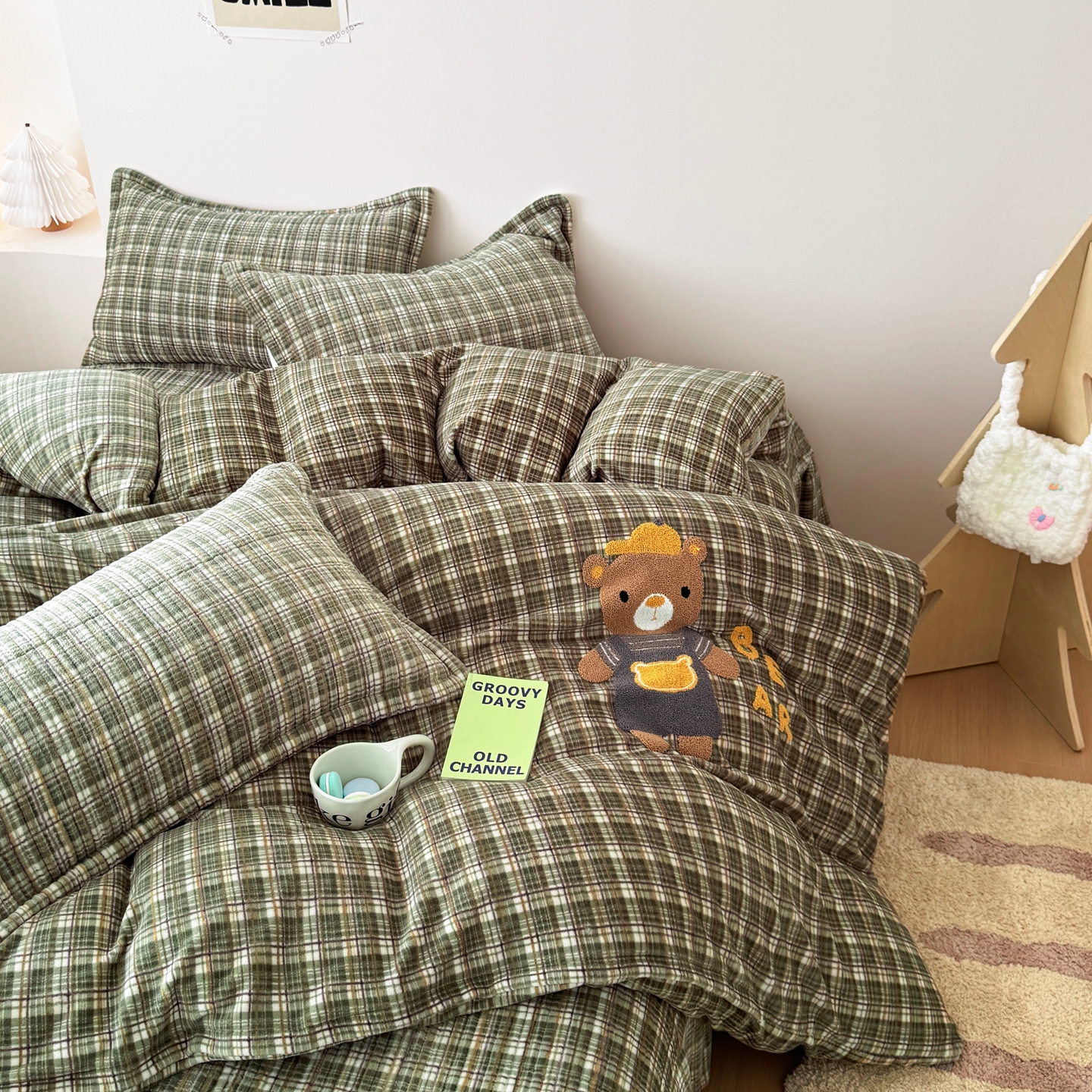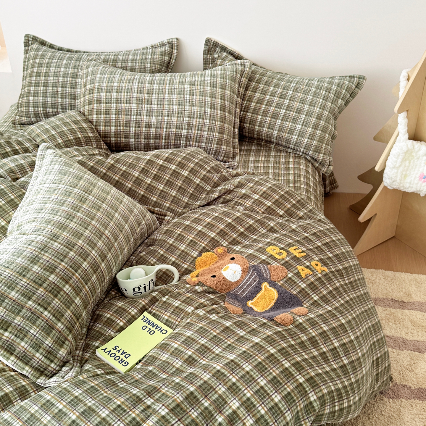 希朵家纺 2025新款可爱牛奶绒毛巾绣床盖四件套 帽子熊绿