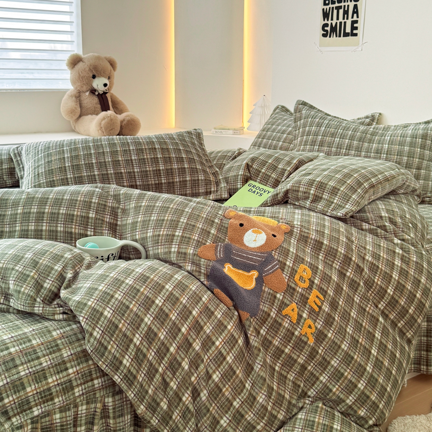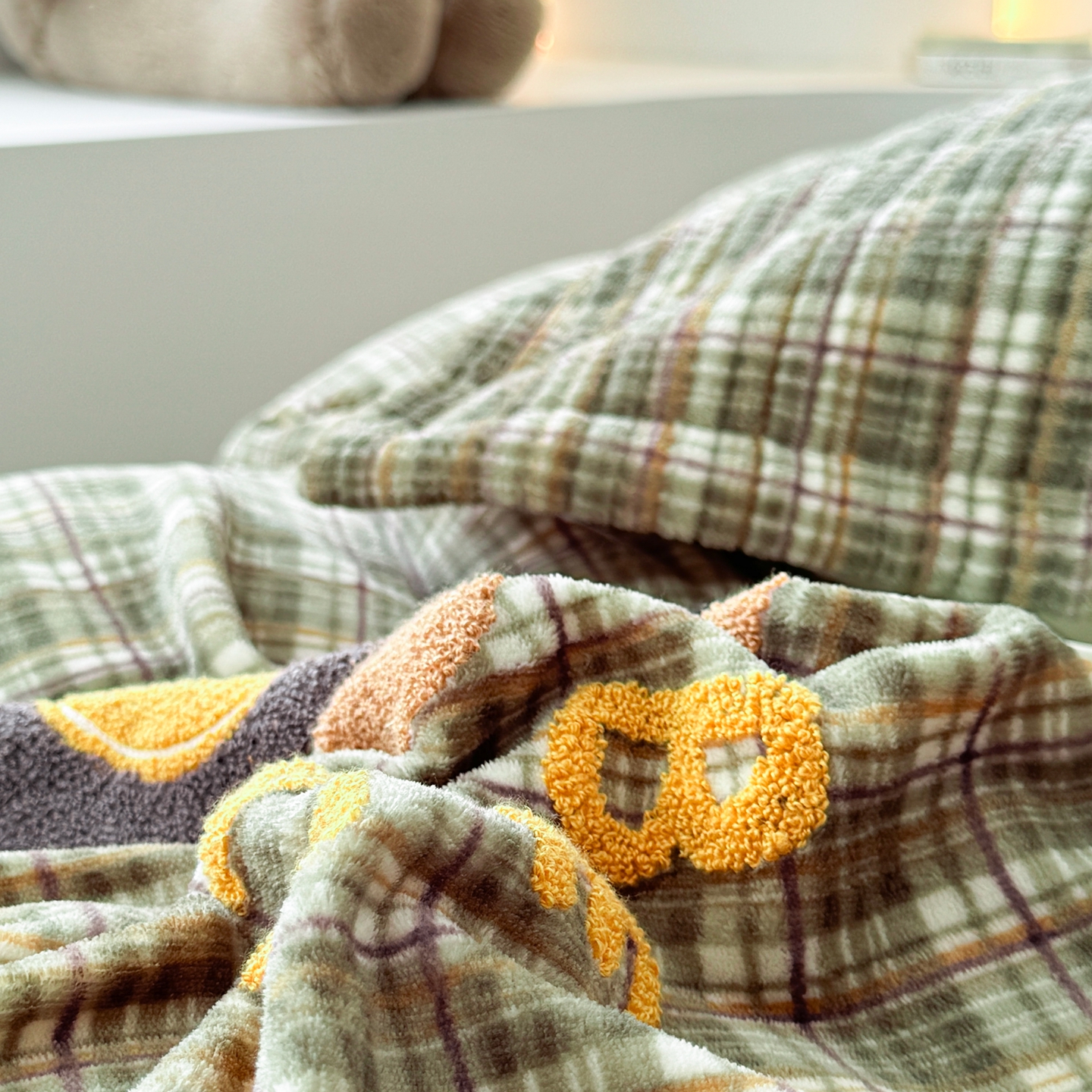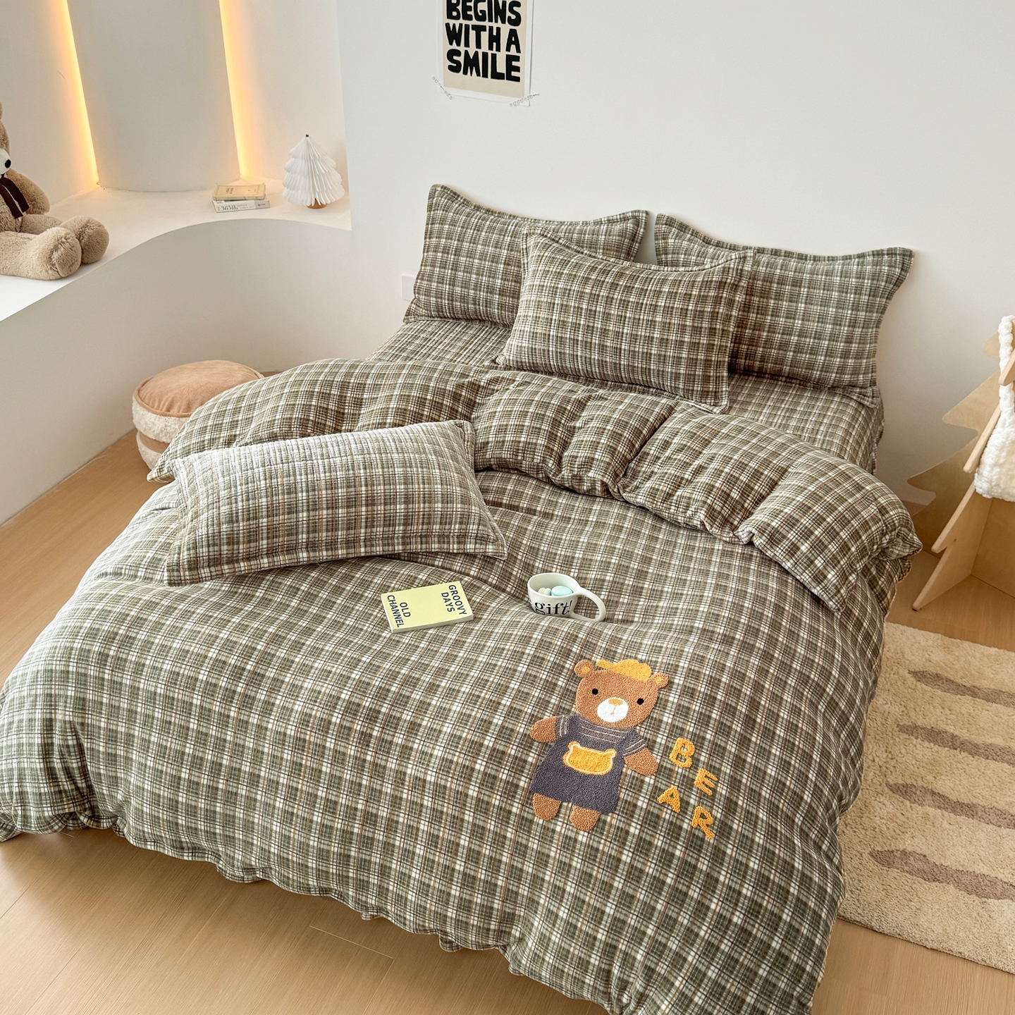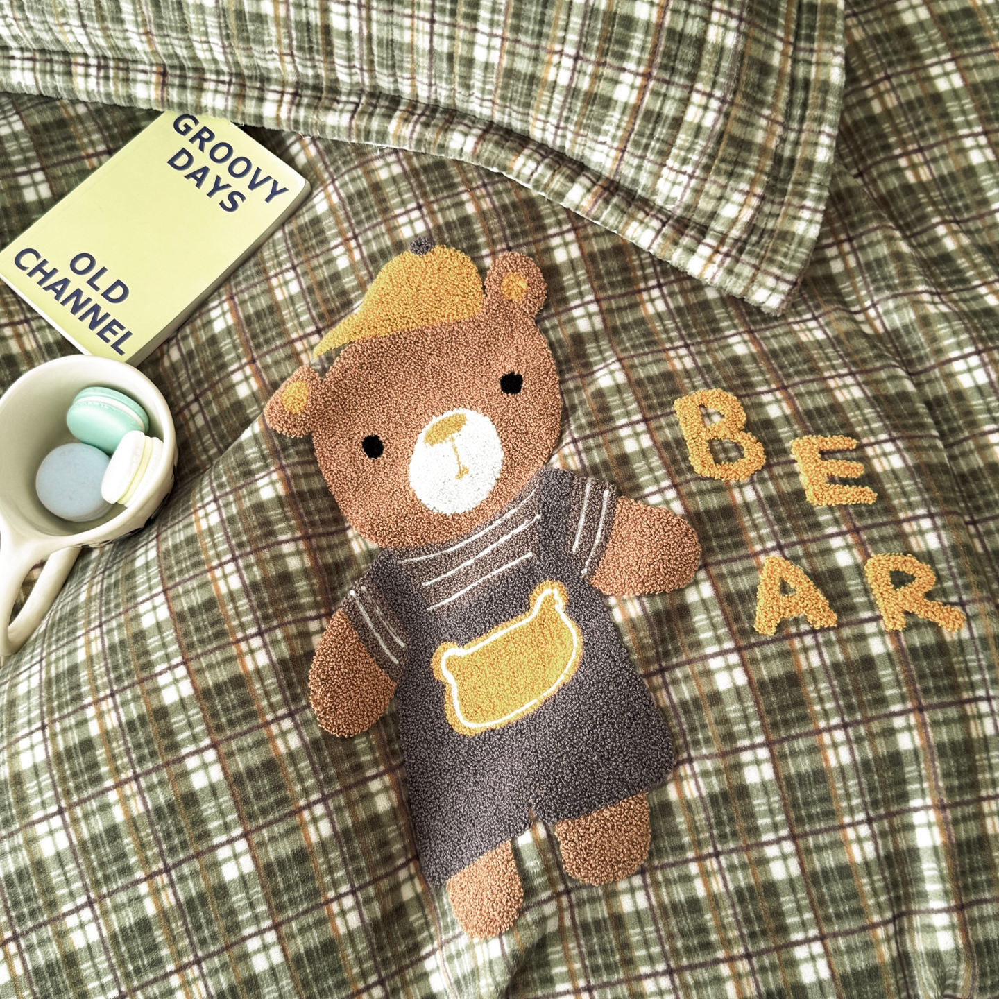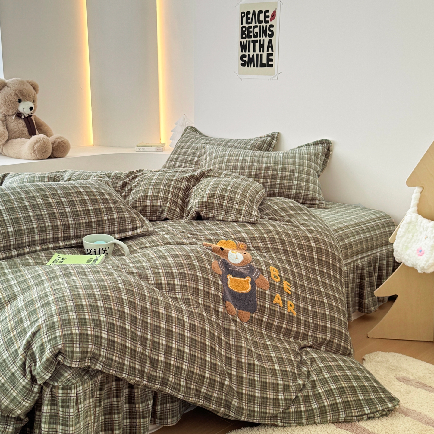 希朵家纺 2025新款可爱牛奶绒毛巾绣床盖四件套 帽子熊绿