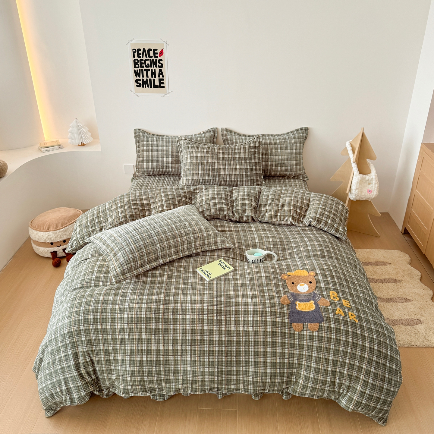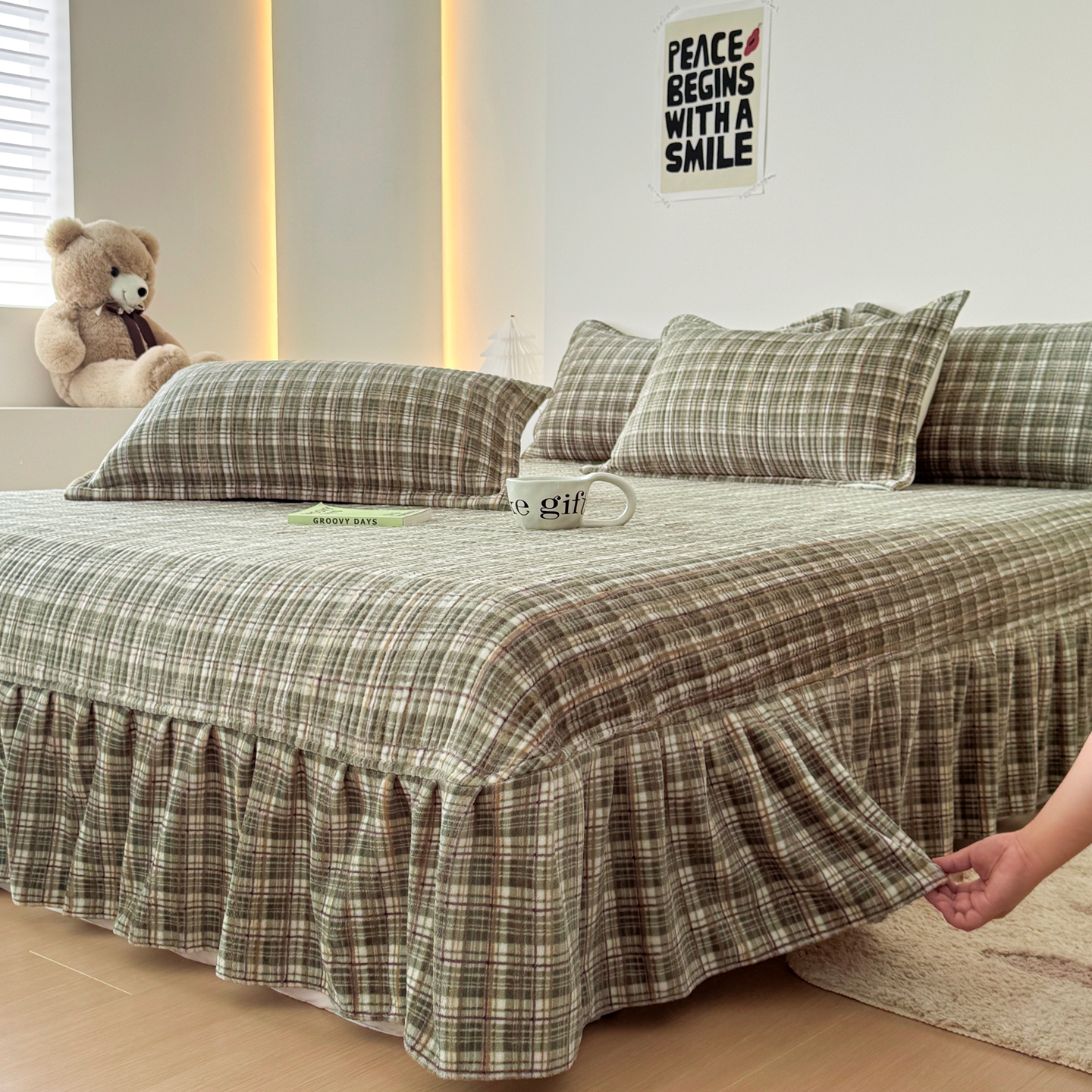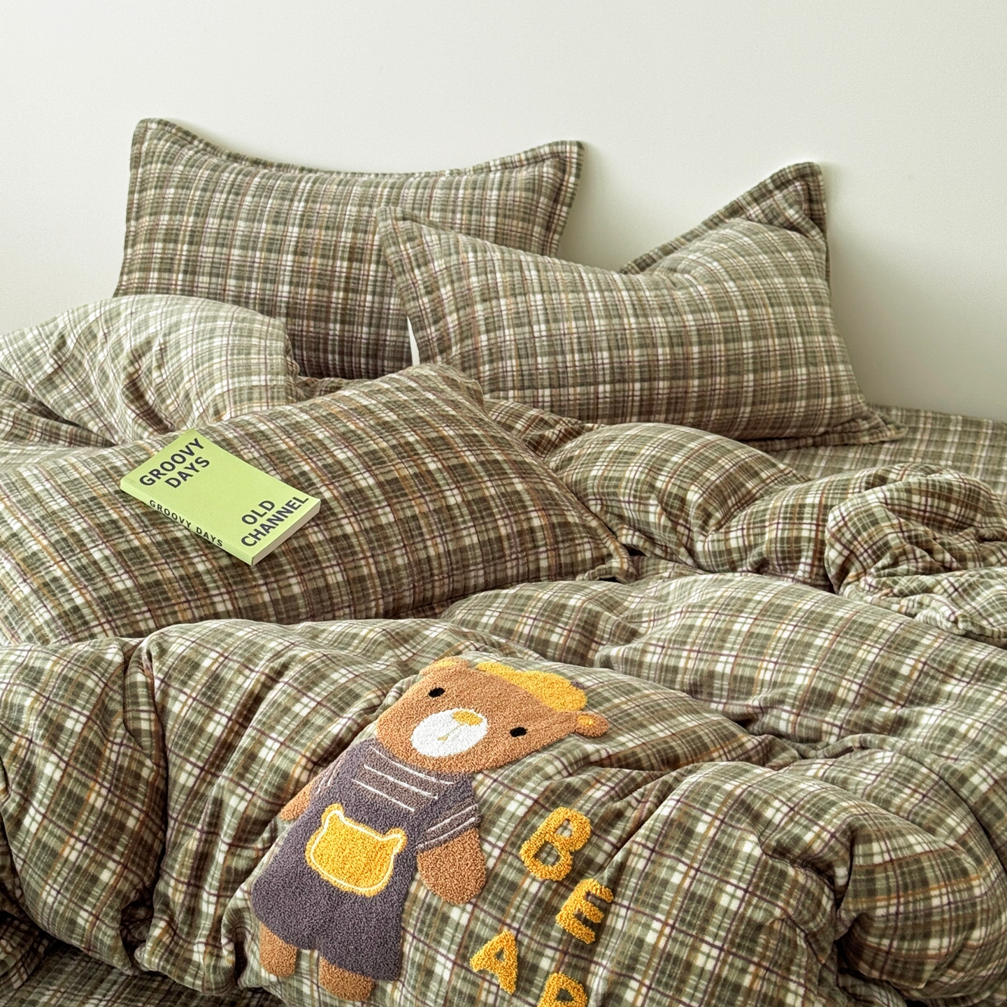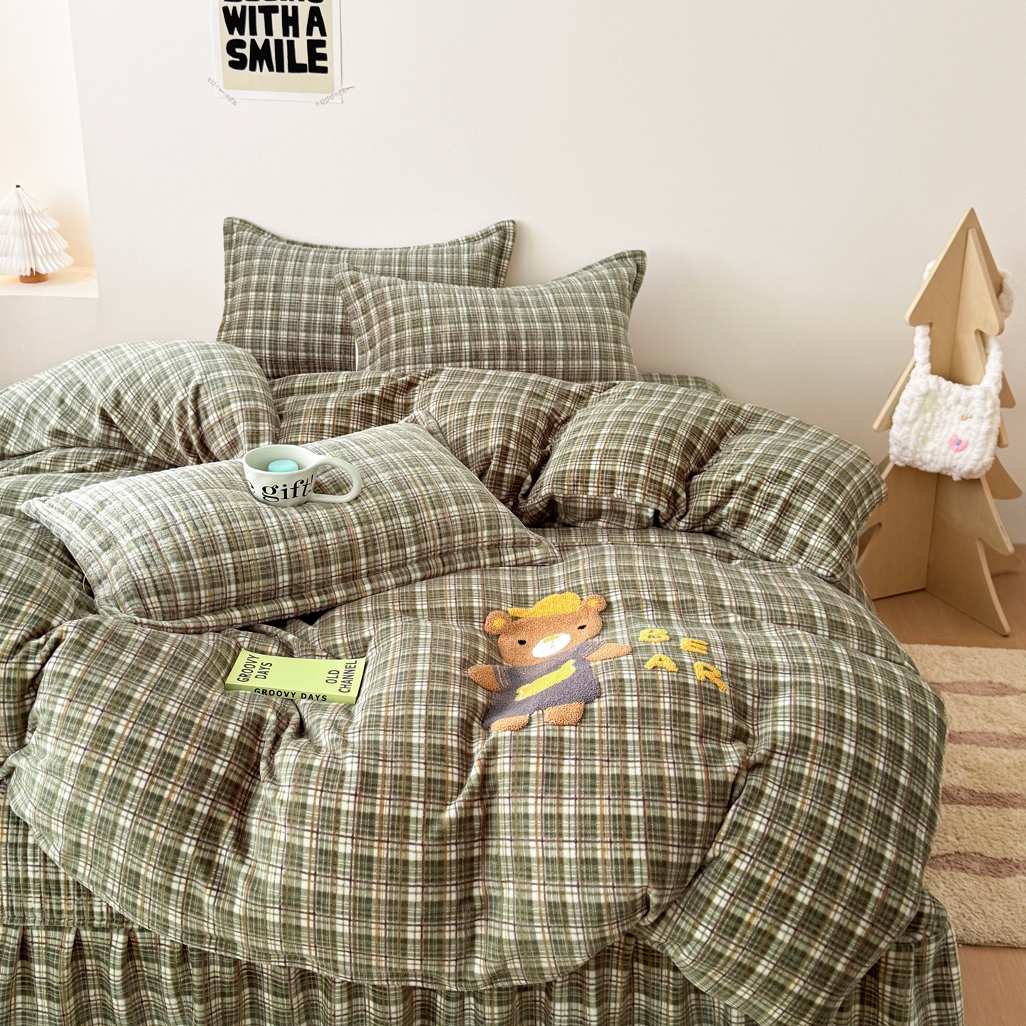 希朵家纺 2025新款可爱牛奶绒毛巾绣床盖四件套 帽子熊绿