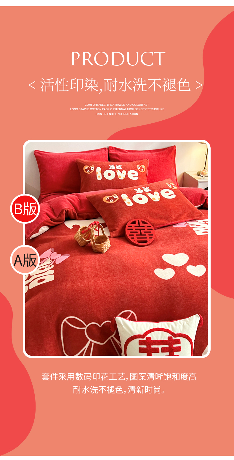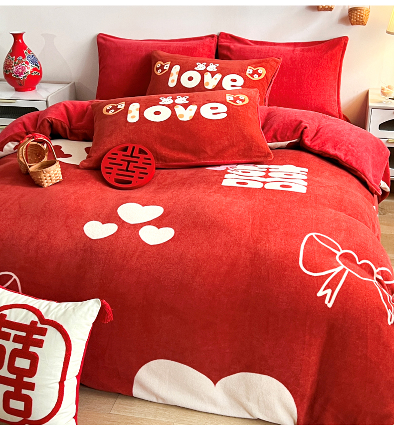 商品名称:一电 2025新款网红花婚庆牛奶绒四件套结婚喜被大红色新婚被罩婚嫁妆被套床单 喜结良缘