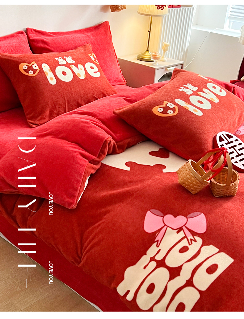 一电 2025新款网红花婚庆牛奶绒四件套结婚喜被大红色新婚被罩婚嫁妆被套床单 喜结良缘