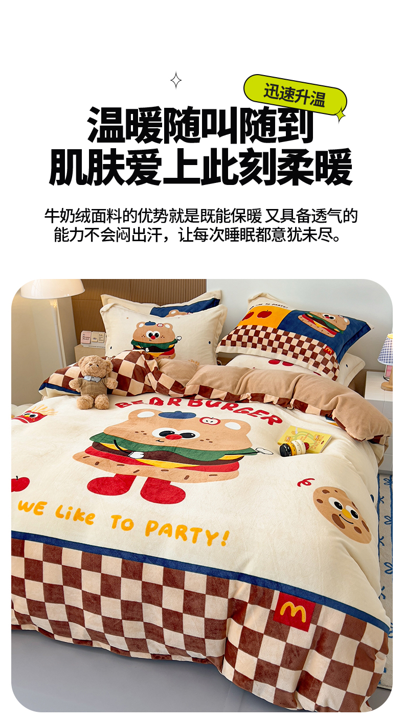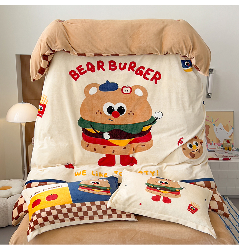 福来临家纺 2025牛奶绒大版卡通四件套 玩趣汉堡