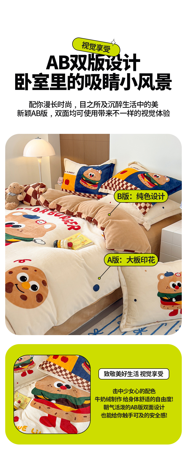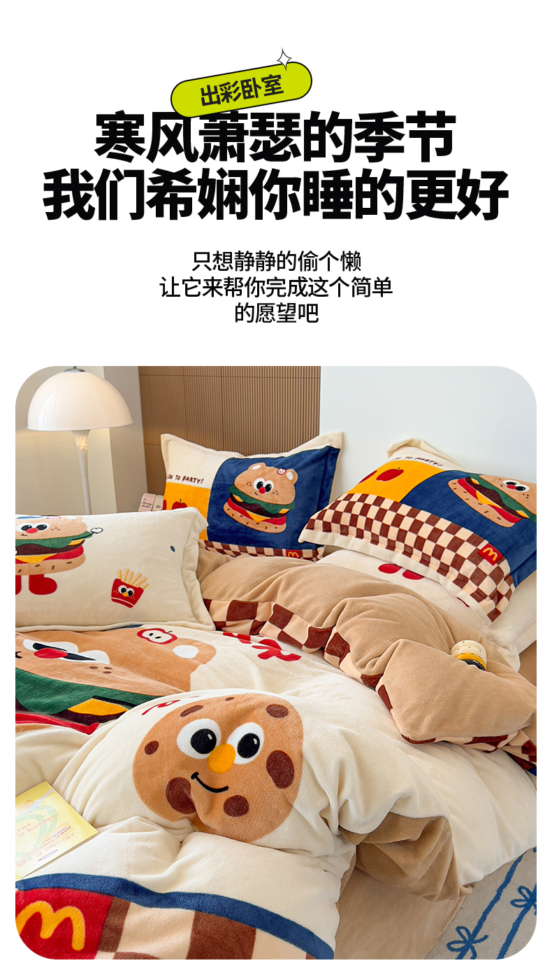 商品名称:福来临家纺 2025牛奶绒大版卡通四件套 玩趣汉堡