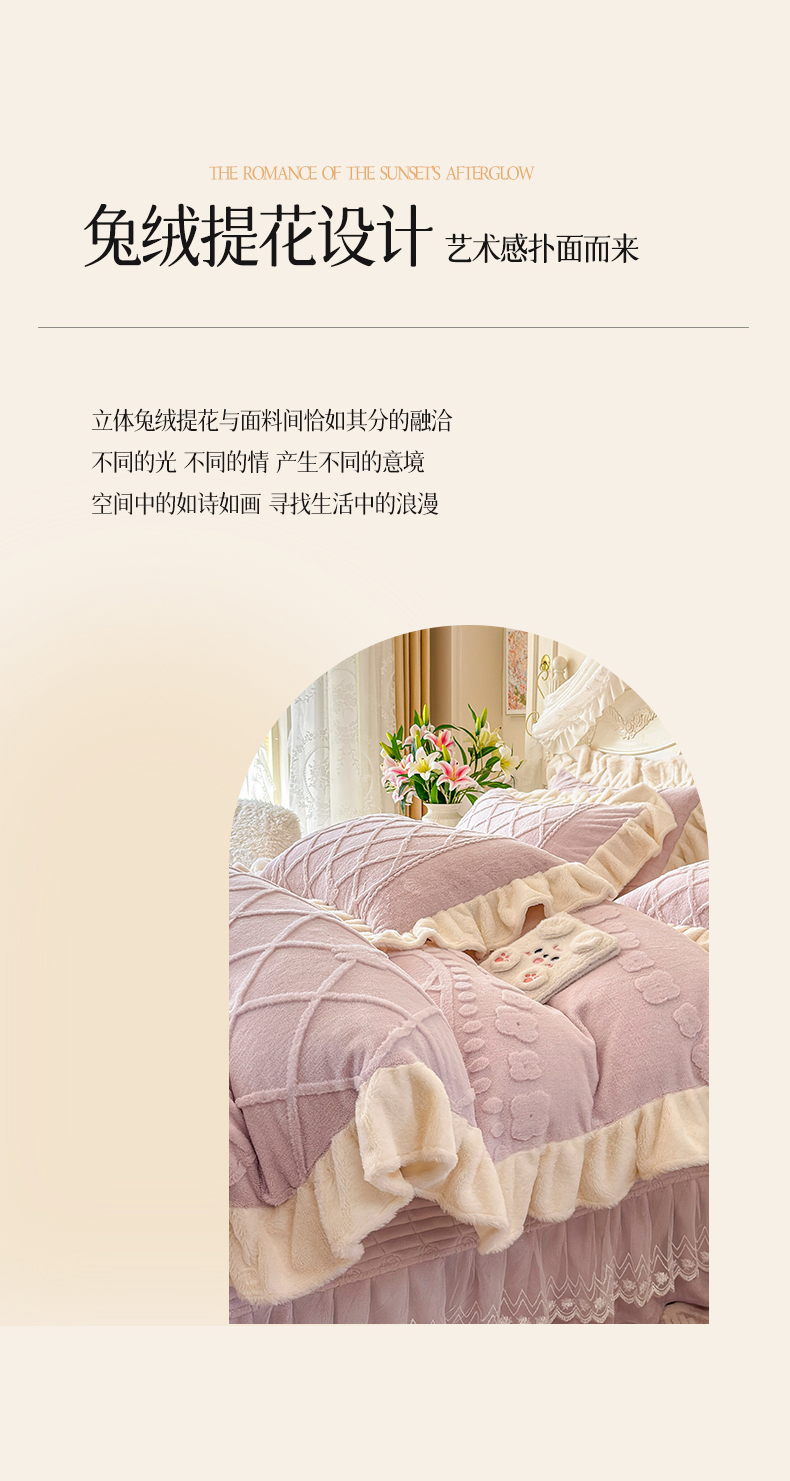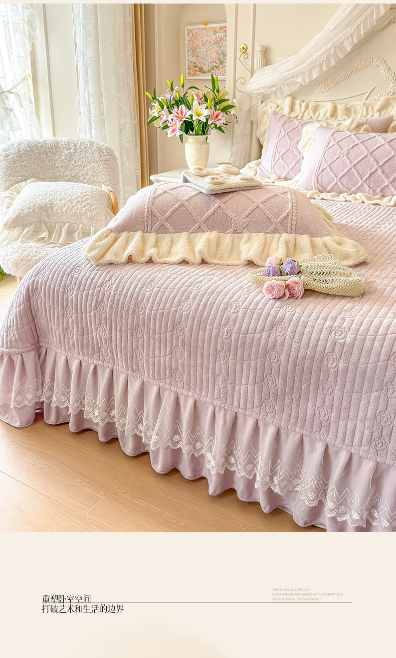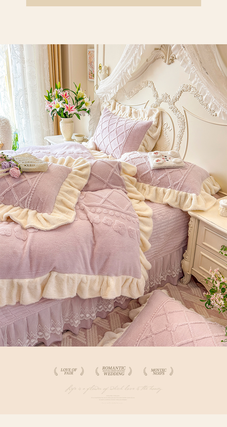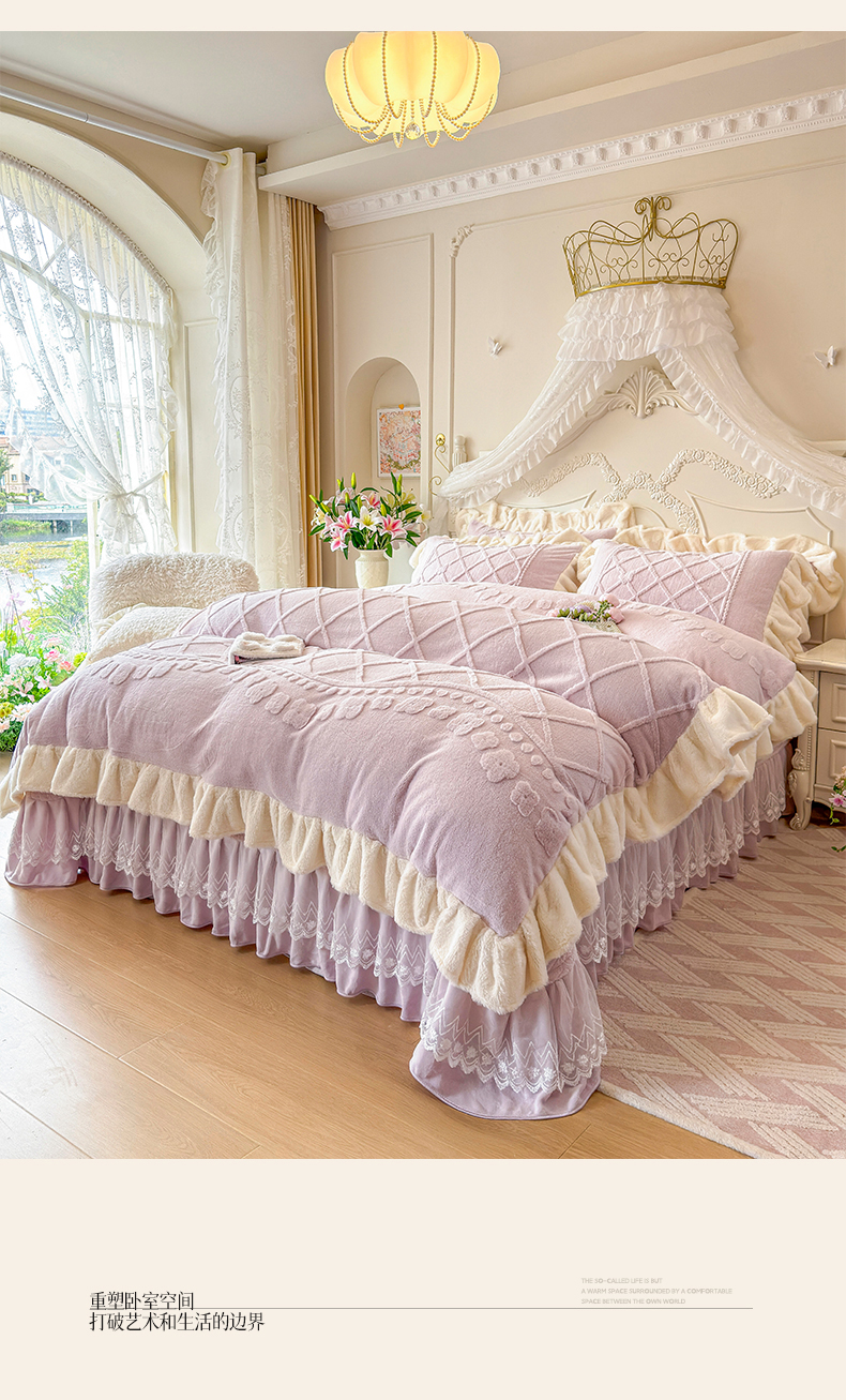 (总)宜凡家纺 2025新款兔绒提花牛奶绒夹棉床裙四件套,爱心 少女粉,爱心 粉紫,爱心 驼色,蝶舞 大红,蝶舞 米色,蝶舞 浅紫,蝶舞 玉色,简爱 苍青,简爱 豆沙紫,简爱 玉色,樱桃 苍青,樱桃 豆沙紫,樱桃 奶油白