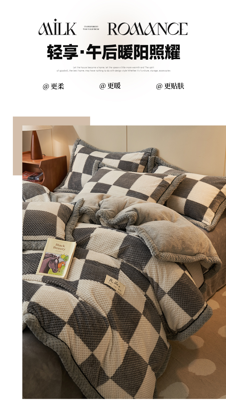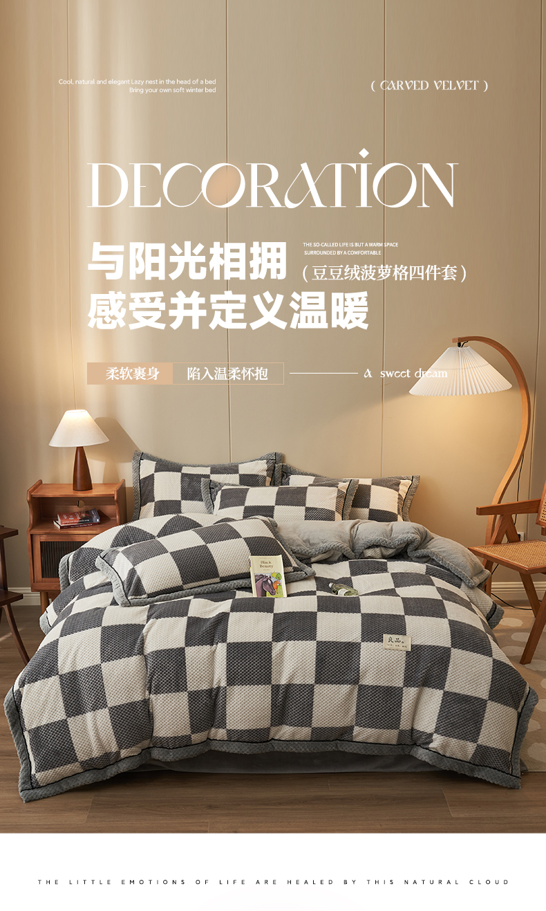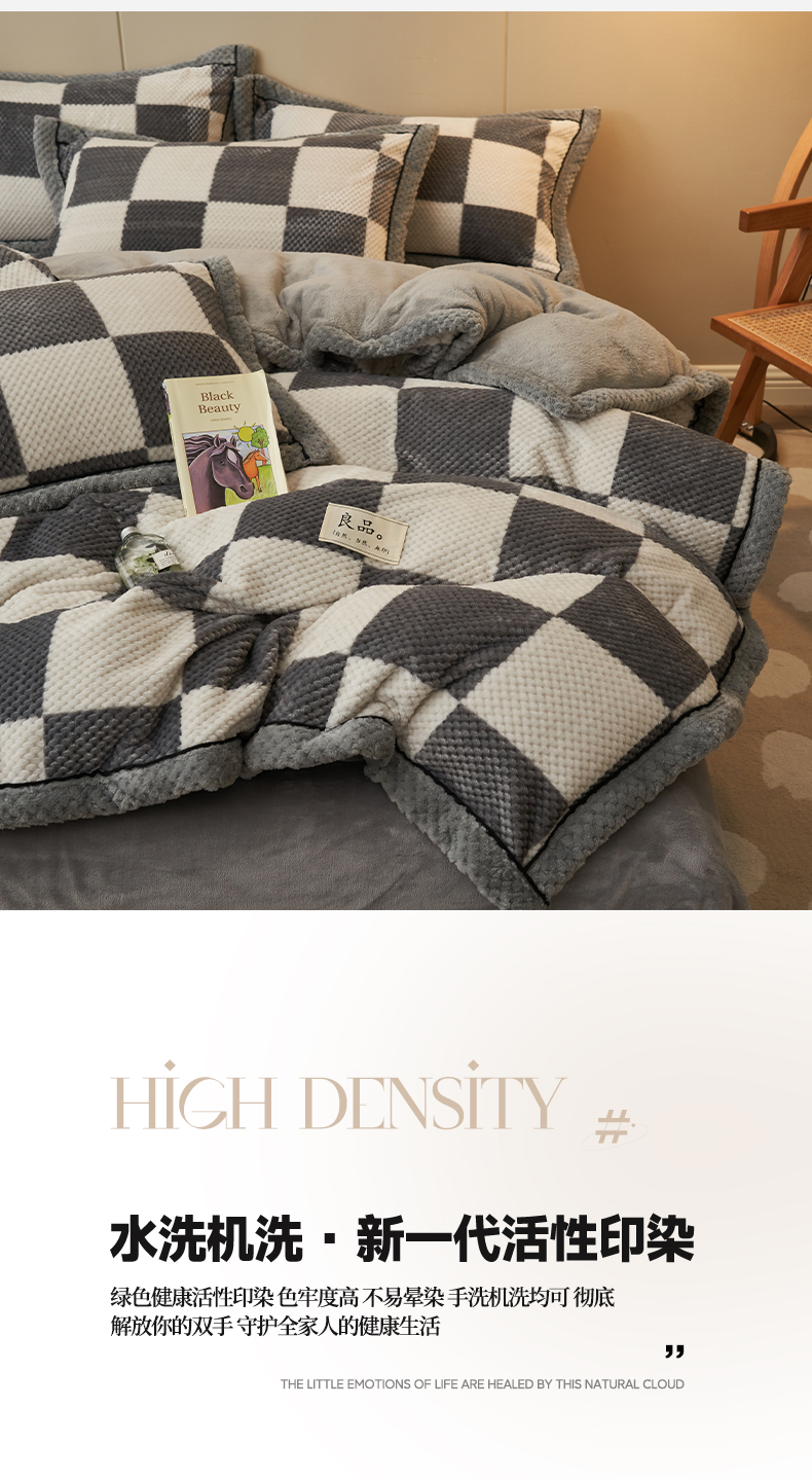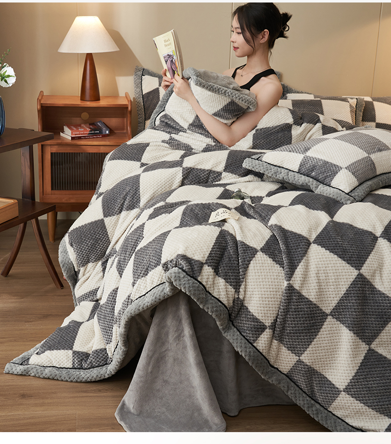 商品名称:早晨家纺 2025新款豆豆款菠萝格提花四件套 豆豆绒-大方格灰