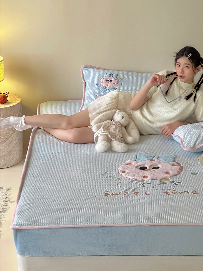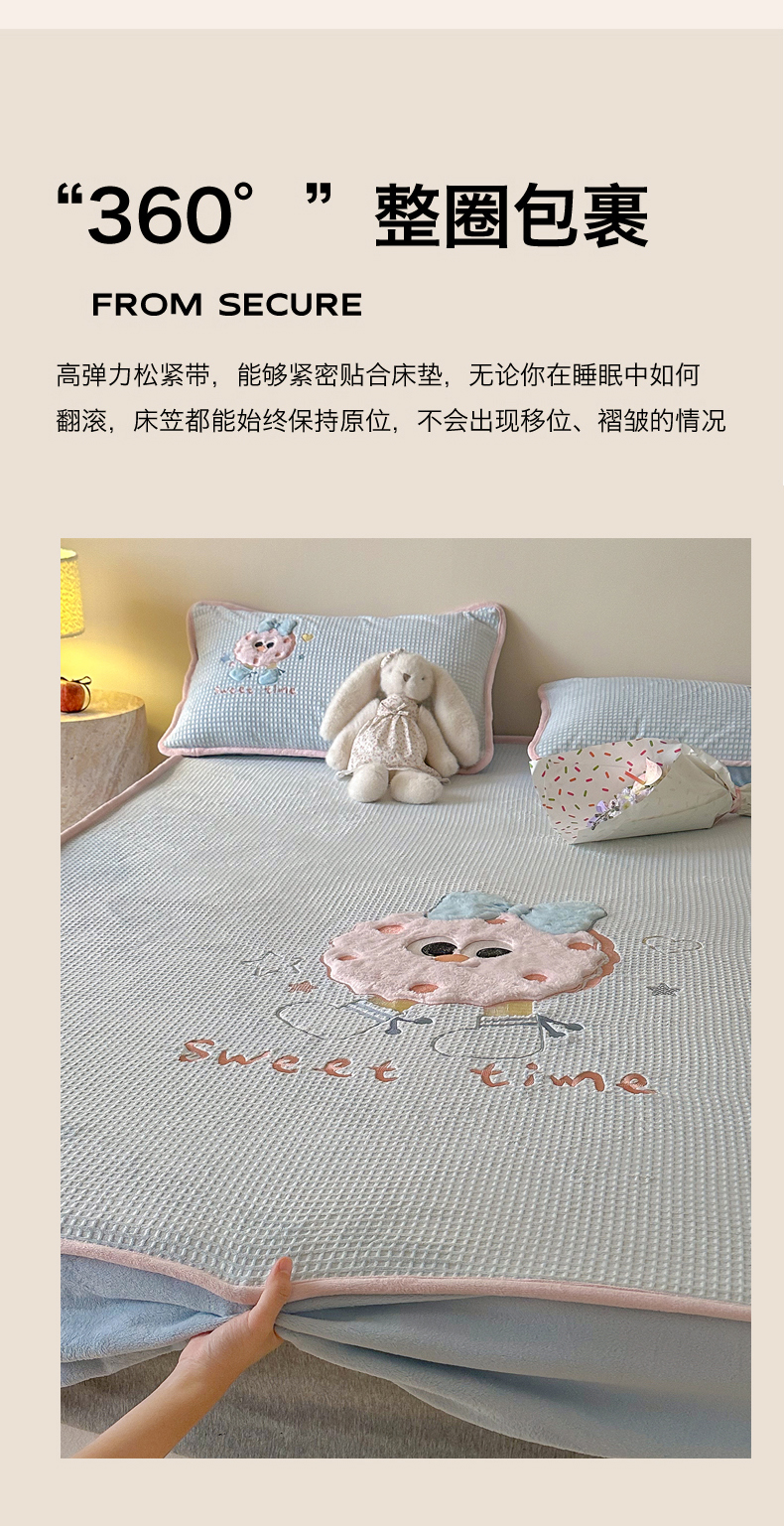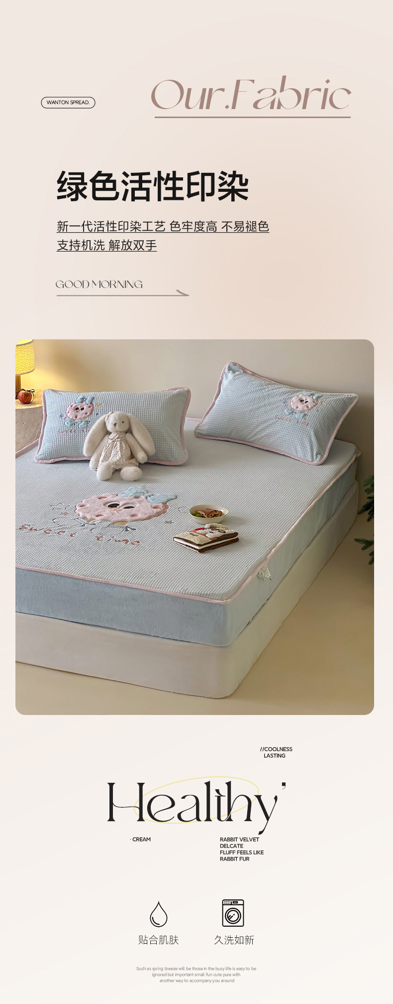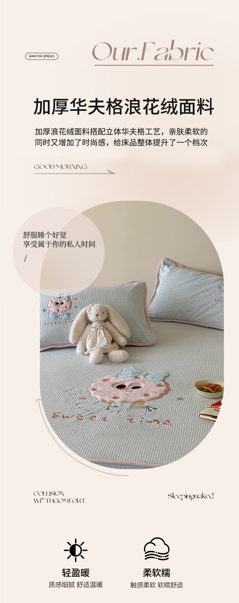 商品名称:Sweet dreams甜梦 2025新款华夫格绒兔毛贴布床笠三件套 甜甜圈蓝